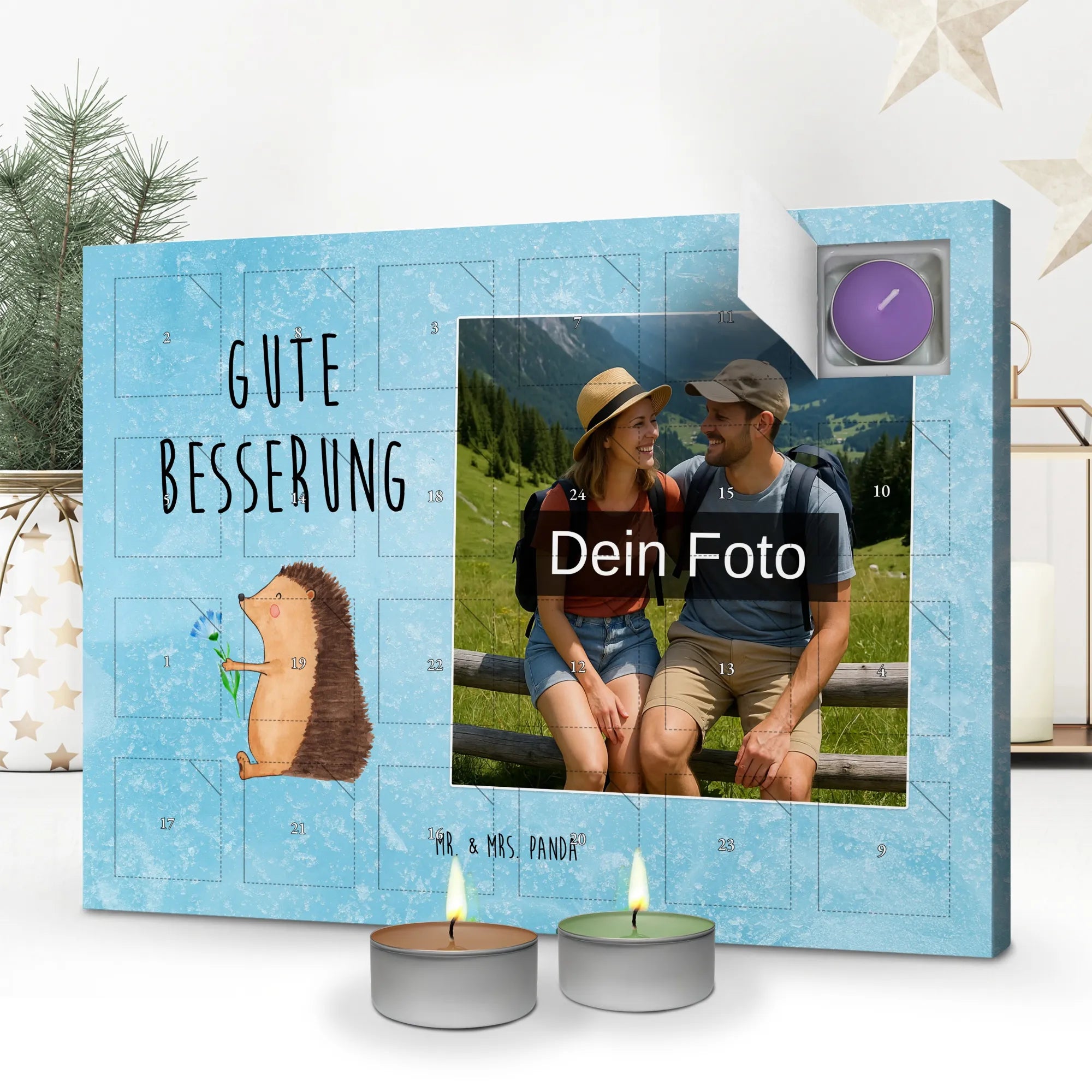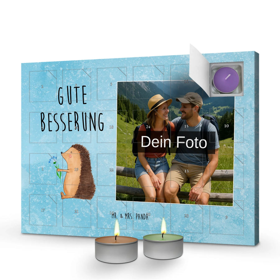 Personalisierter Duftkerzen Foto Adventskalender Igel Blumen - Eisblau