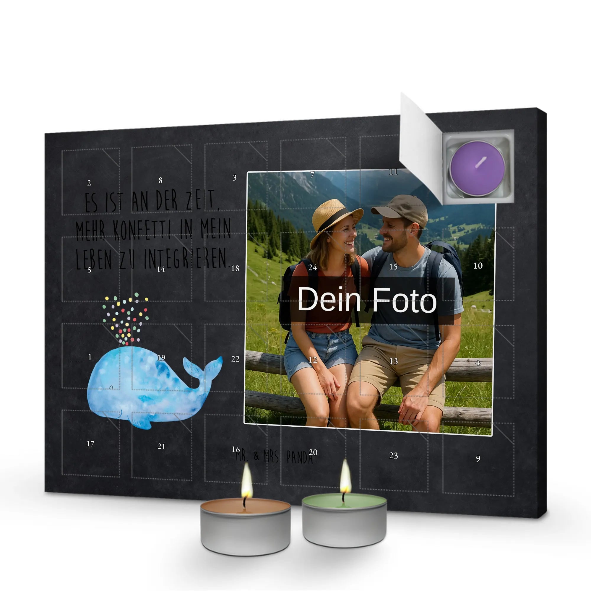 Personalisierter Adventskalender Duftkerzen Foto – von Mr. & Mrs. Panda mit Herz gestaltet. Dieser Adventskalender verbindet persönliche Erinnerungen mit zauberhaften Düften und niedlichen Illustrationen. Du kannst ein Foto deiner Wahl einfügen; die restlichen Motive und liebevollen Sprüche kommen von Mr. & Mrs. Panda. Die Front ziert eine niedliche Zeichnung von Mrs. Panda. Hinter den Türchen verbergen sich sechs unterschiedliche Düfte: Vanille, Lavendel, Grüner Tee, Apfel-Zimt, Granatapfel und Oud Wood – für abwechslungsreiche Duftmomente im Dezember. Material: stabiler Adventskalender-Karton. Vielseitig: sowohl zum Hinstellen als auch zum Aufhängen geeignet. Maße: Breite: 340 mm, Höhe: 247 mm, Tiefe: 18 mm. Bitte lade nur Fotos in guter Qualität und ausreichender Auflösung hoch, achte auf den richtigen Bildausschnitt und darauf, dass du die Bildrechte besitzt. Wichtiger Hinweis: Die Fotos werden weder aufbereitet noch zugeschnitten; personalisierte Artikel sind vom Rückgaberecht ausgeschlossen. Sicherheitshinweis: Kerze nie ohne Unterlage verwenden. Der Kalender ist ein liebevolles Geschenk, das Persönlichkeit und Duft zu einem stimmungsvollen Adventserlebnis vereint.