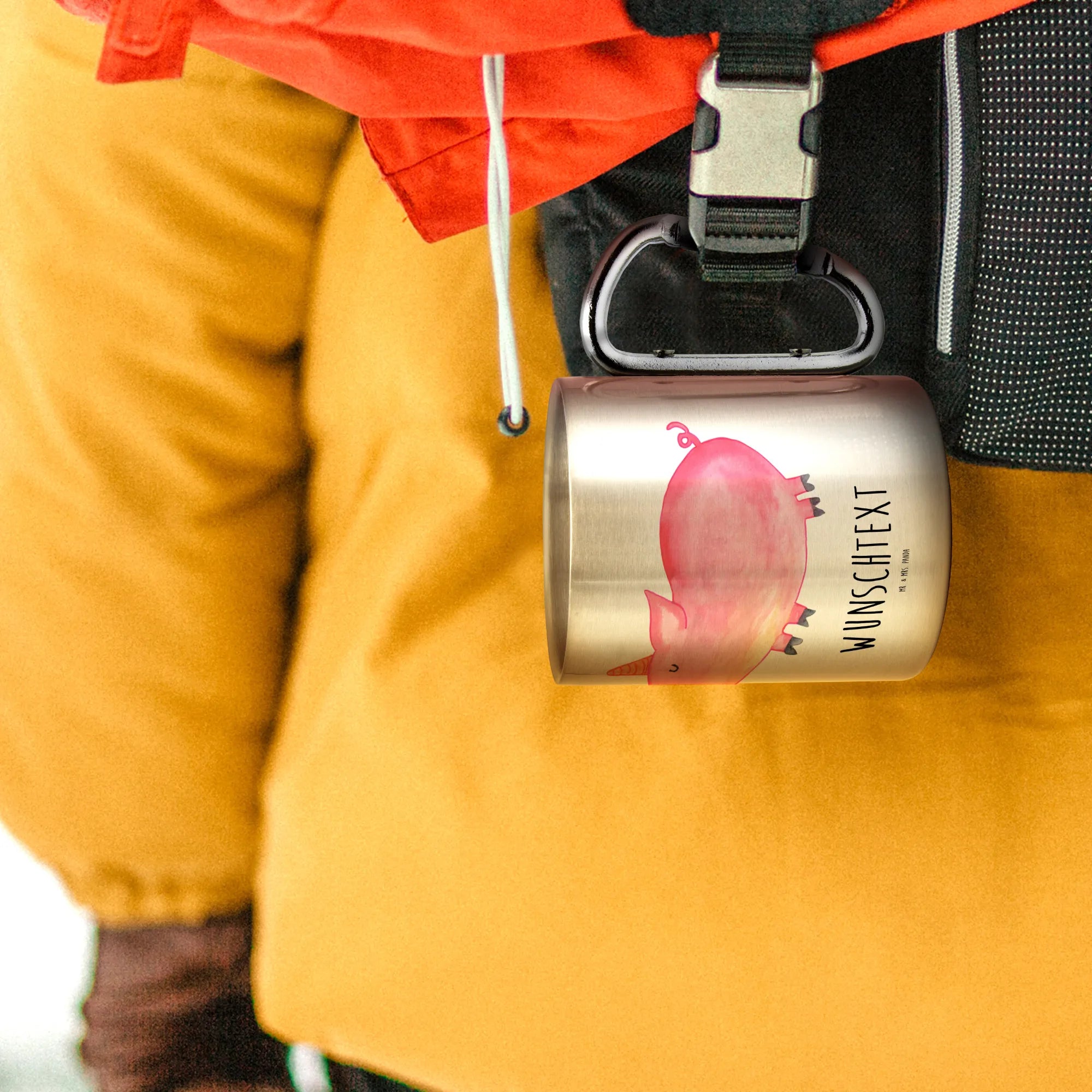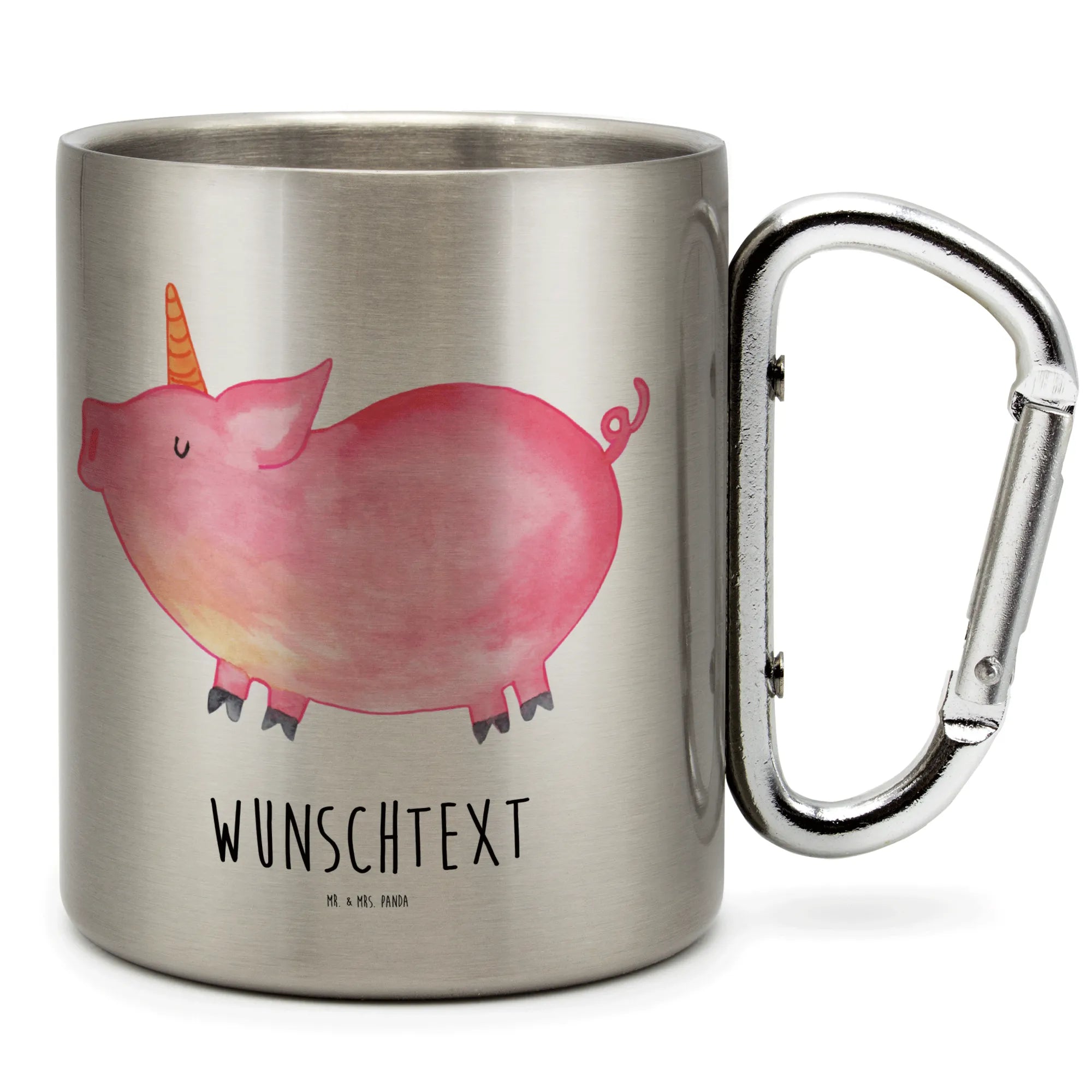 Der personalisierte Edelstahlbecher von Mr. & Mrs. Panda mit dem witzigen Einhorn Schweinhorn-Motiv ist das perfekte Geschenk für alle, die Einhörner und Humor lieben! Diese robuste und hübsch gestaltete Tasse stellt sicher, dass Du Deinen Lieblingsdrink stilvoll genießen kannst, egal ob beim gemütlichen Frühstück, beim Wandern oder auf dem Campingplatz. Der Becher hat eine Füllmenge von 330 ml und ist aus hochwertigem, rostfreiem Edelstahl gefertigt.