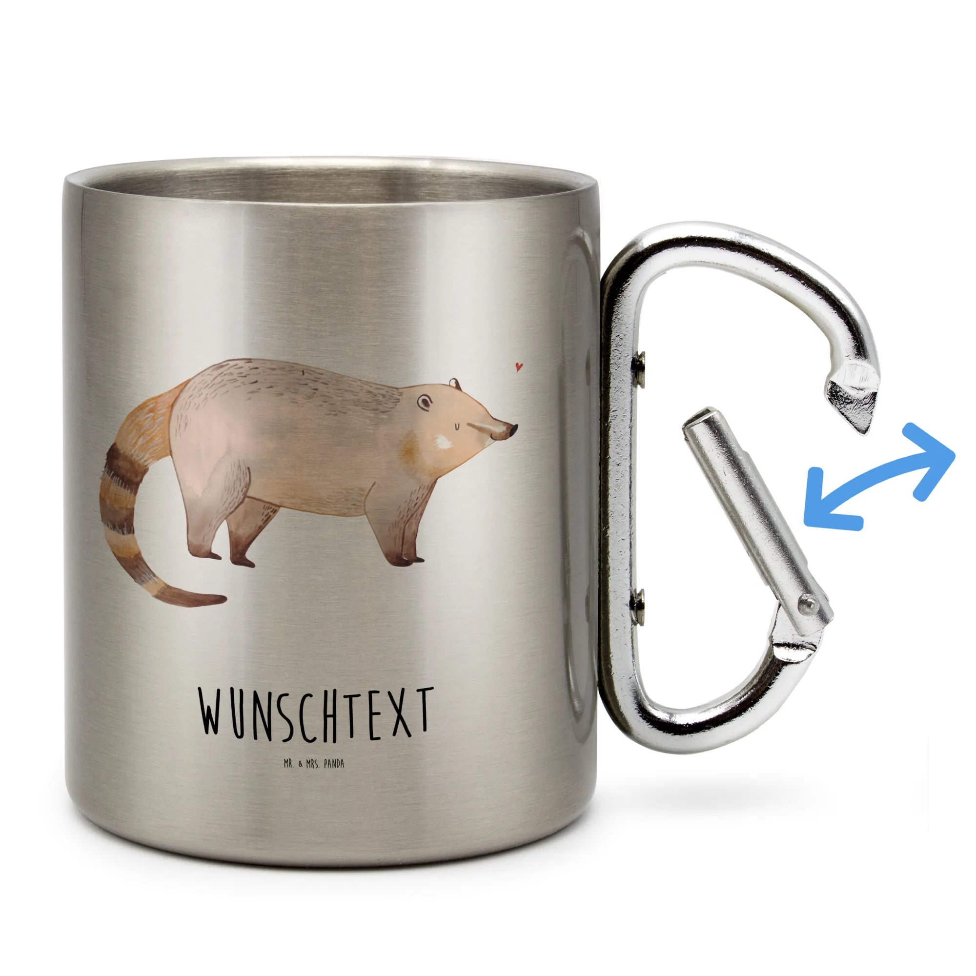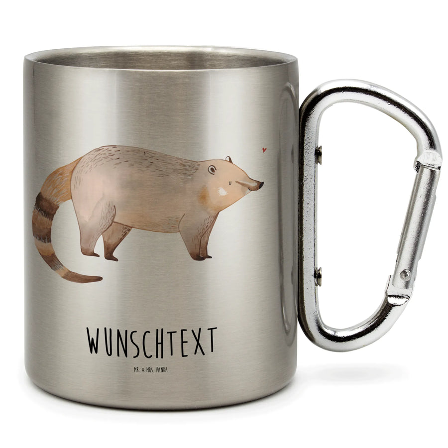 Wenn Du nach dem perfekten Geschenk für einen Tierliebhaber suchst, dann ist der personalisierte Edelstahlbecher mit dem süßen Nasenbär-Motiv aus der Small World Kollektion von Mr. & Mrs. Panda genau das Richtige!
