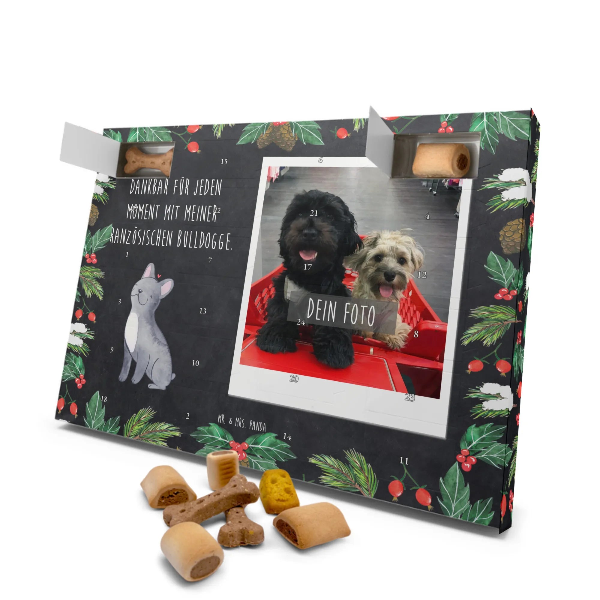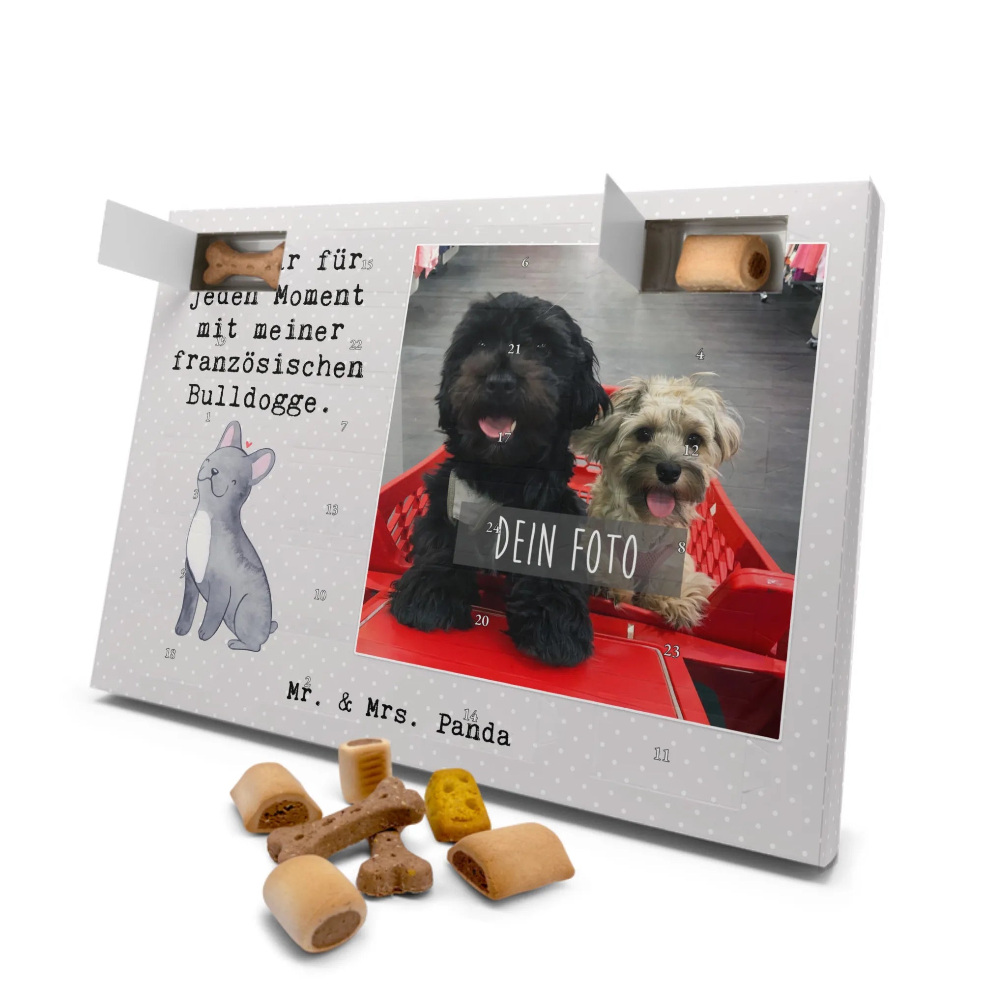 Der personalisierte Hunde Foto Adventskalender von Mr. & Mrs. Panda ist das perfekte Geschenk für jeden Hundeliebhaber, besonders für Liebhaber von Französischen Bulldoggen. Stell dir vor, wie aufregend es für dich und deinen geliebten Vierbeiner ist, jeden Tag im Dezember ein neues Türchen zu öffnen!