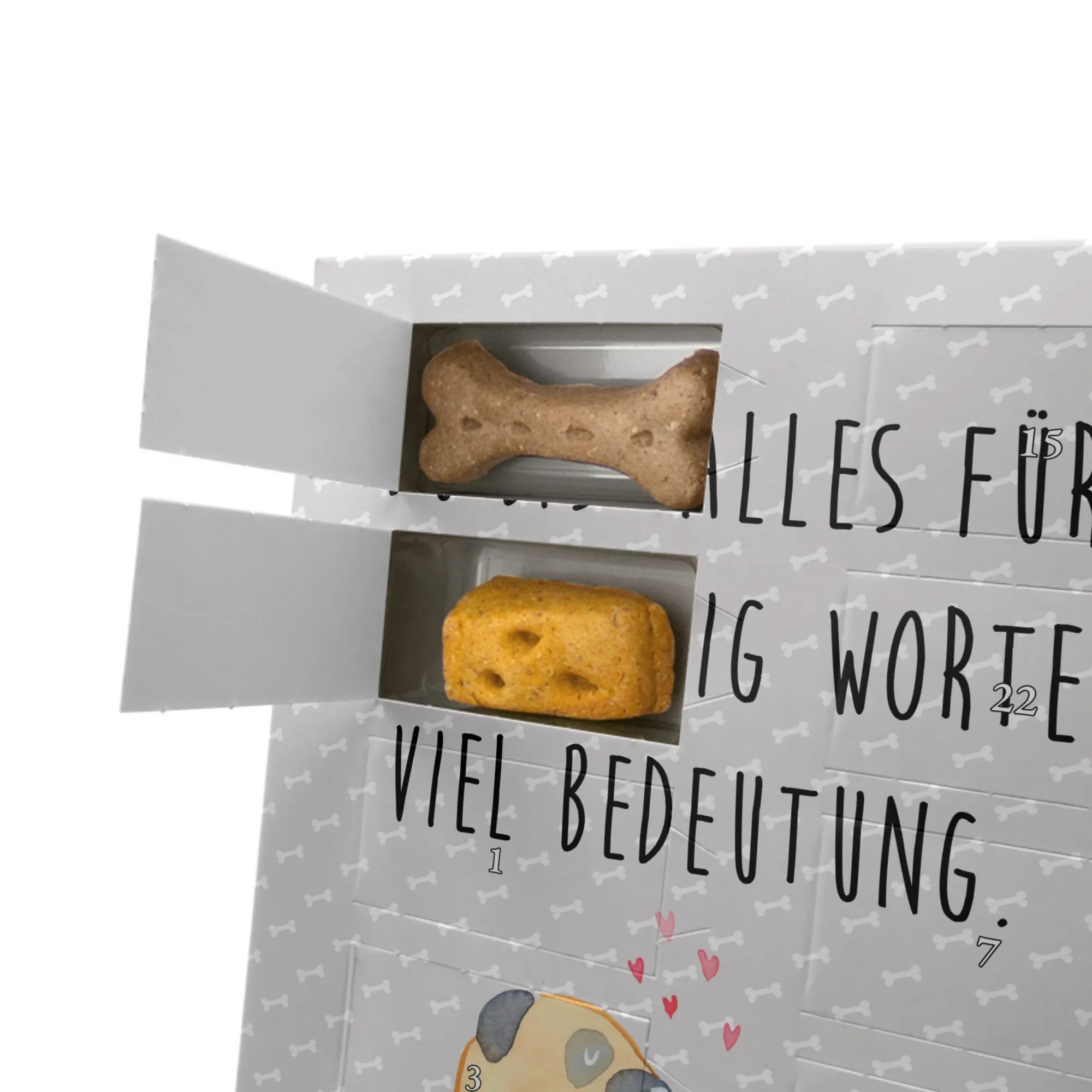 Er ist nicht nur ein Hingucker, sondern auch voller Überraschungen für deinen vierbeinigen Freund. Der Adventskalender wurde liebevoll mit einem einzigartigen Mops-Motiv, das zwei niedliche Möpse zeigt, die sich verliebt anblicken, gestaltet. Während einer der Mops dem anderen eine Blume überreicht, vermittelt das Design das Gefühl von Liebe und Zuneigung.