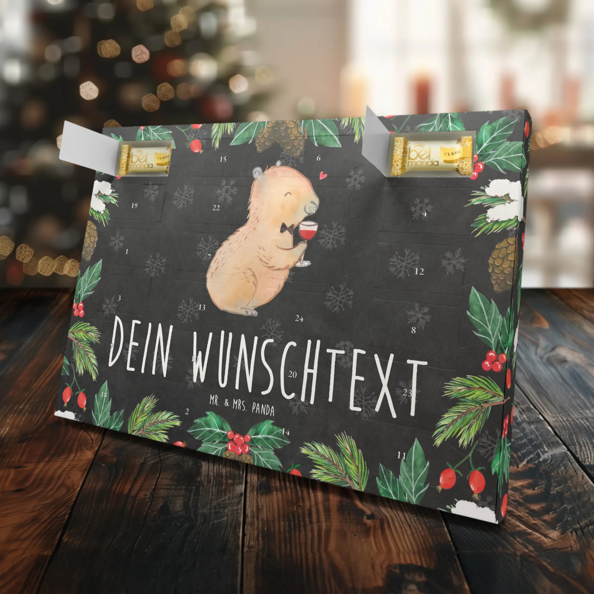 Der personalisierte Marzipan Adventskalender mit dem charmanten Capybara-Wein-Motiv aus der Small World Kollektion von Mr. & Mrs. Panda ist das perfekte Geschenk für Weinliebhaber! 🎁 Dieser Adventskalender ist nicht nur eine süße Überraschung, sondern auch ein stilvoller Hingucker, der eine große Portion gute Laune mit sich bringt.