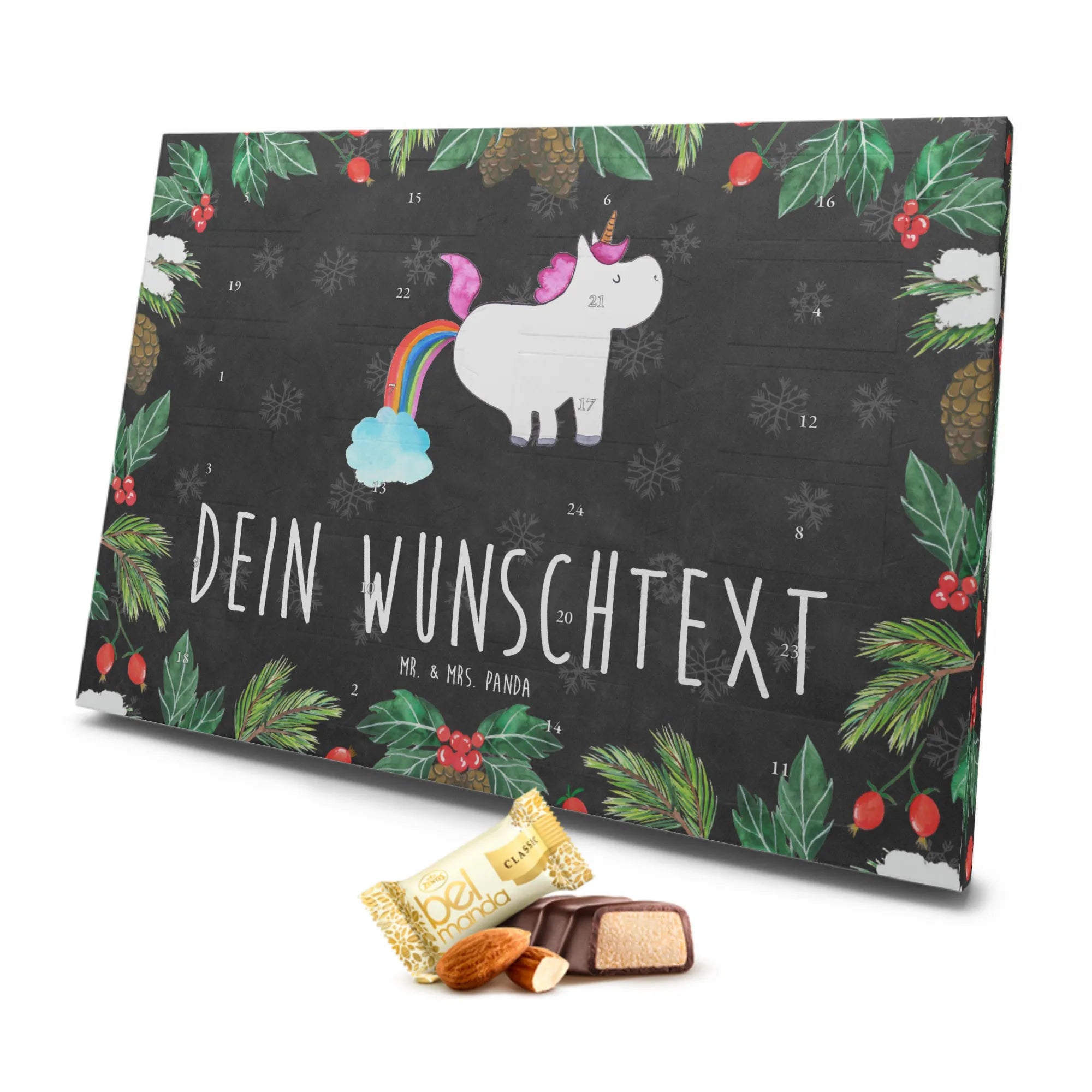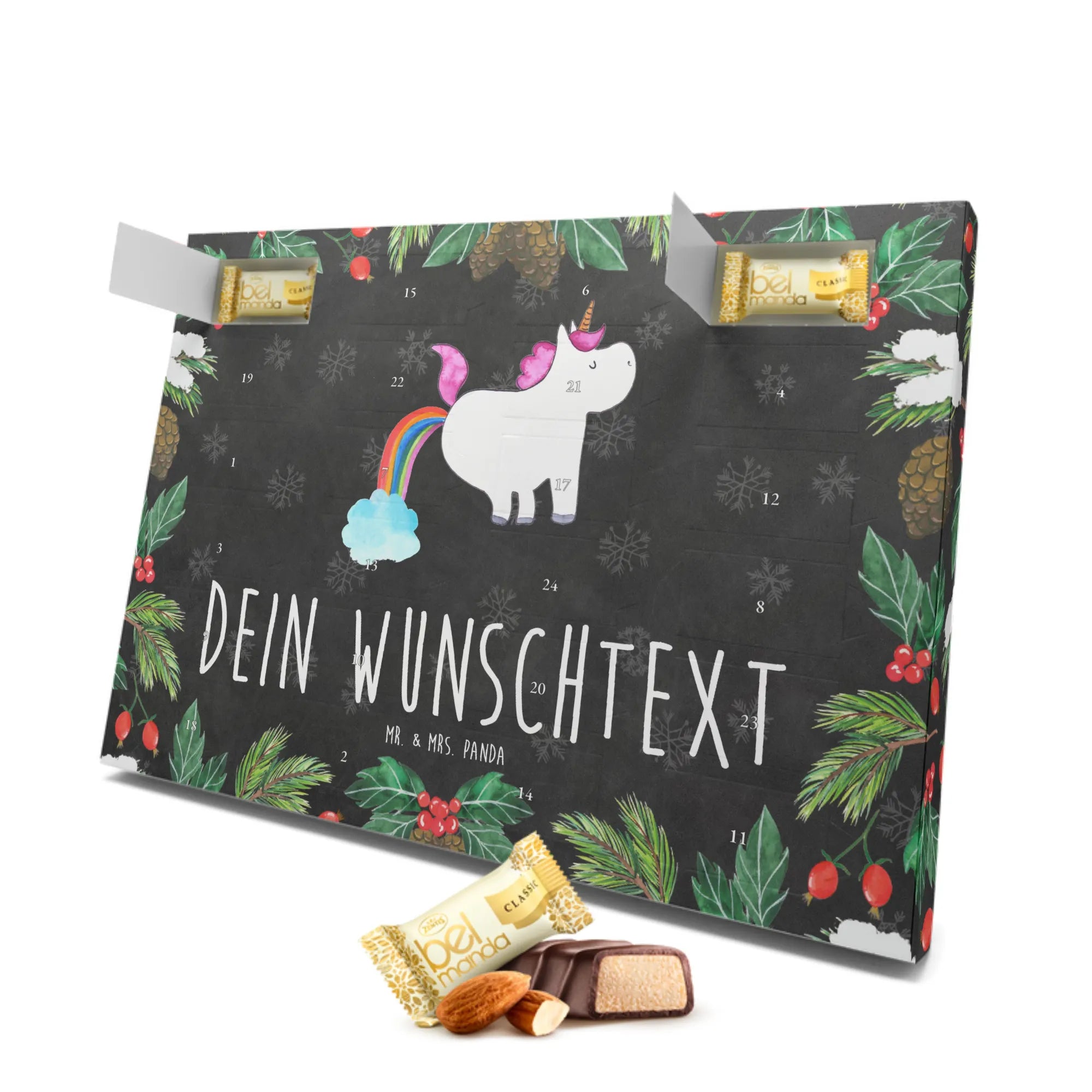 Der personalisierte Marzipan Adventskalender von Mr. & Mrs. Panda mit dem süßen Motiv "Einhorn Pupsend" ist das perfekte Geschenk für alle, die den Glitzer und die Freude der Einhornwelt lieben! Dieser Kalender bringt nicht nur die Vorfreude auf Weihnachten, sondern auch jede Menge Spaß und Lächeln in die dunklen Wintertage.