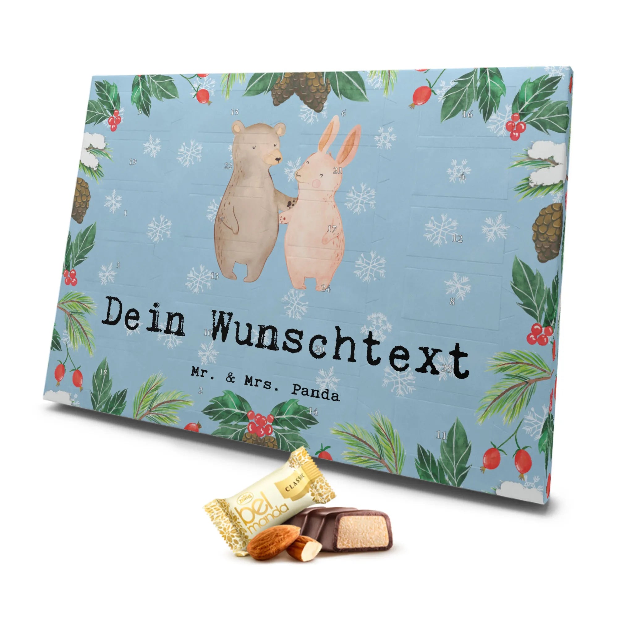 Der personalisierte Marzipan Adventskalender mit dem süßen Motiv 'Hase Beste Freundschaft der Welt' von Mr. & Mrs. Panda ist das perfekte Geschenk für all deine besten Freunde, für die Clique oder die liebste Freundin. Jeder Türchen des Kalenders birgt eine köstliche Überraschung – 24 einzeln verpackte Edelmarzipan Pralinés, die nicht nur den Gaumen erfreuen, sondern auch das Herz erwärmen.