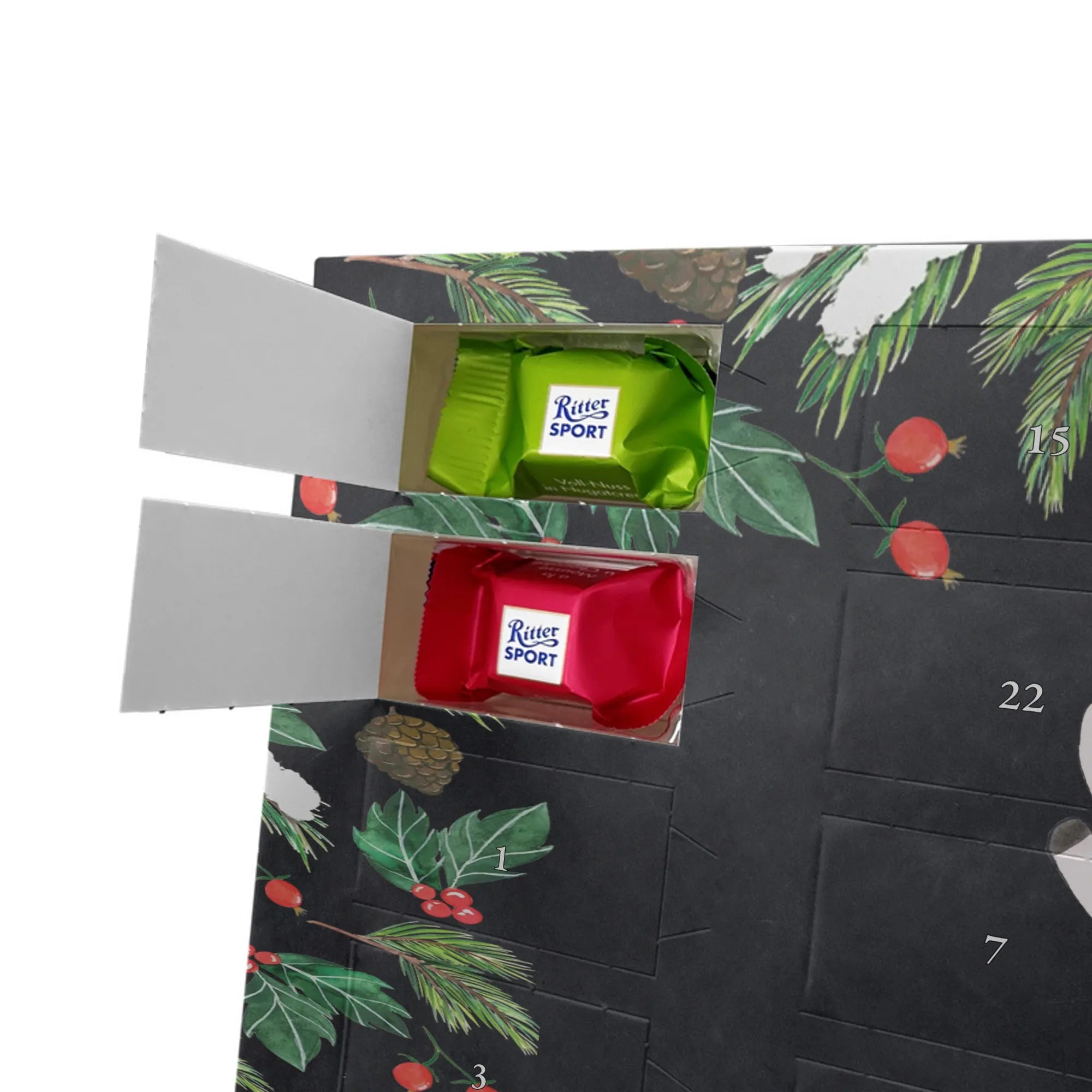 Suchst du einen besonderen Adventskalender, der persönlich und hochwertig ist? Unser Adventskalender mit Namen von Mr. & Mrs. Panda ist genau das – individualisierbar mit dem Namen deiner Liebsten oder einem kurzen Spruch und bedruckt mit unseren beliebten, charmanten Motiven. Die Druckqualität ist brillant, die seidenmatte Oberflächenveredelung verleiht dem Kalender eine elegante Haptik. Auch die Seitenflächen sind liebevoll bedruckt, sodass das Design rundum überzeugt. Du kannst den Kalender aufstellen oder an einer Stelle aufhängen, die du magst – die besondere Form macht beides möglich. Gefüllt ist der Kalender mit Ritter Sport Schokowürfeln in sechs beliebten Sorten: Mousse au Chocolat, Schoko Crisp, Voll-Nuss in Nougatcreme, Karamell Duo, Joghurt und Erdbeer-Joghurt. So gibt es hinter jedem Türchen eine kleine, leckere Überraschung. Maße: 325 mm x 225 mm x 27 mm – kompakt genug, um überall Platz zu finden, groß genug für 24 sorgfältig verpackte Schokowürfel.