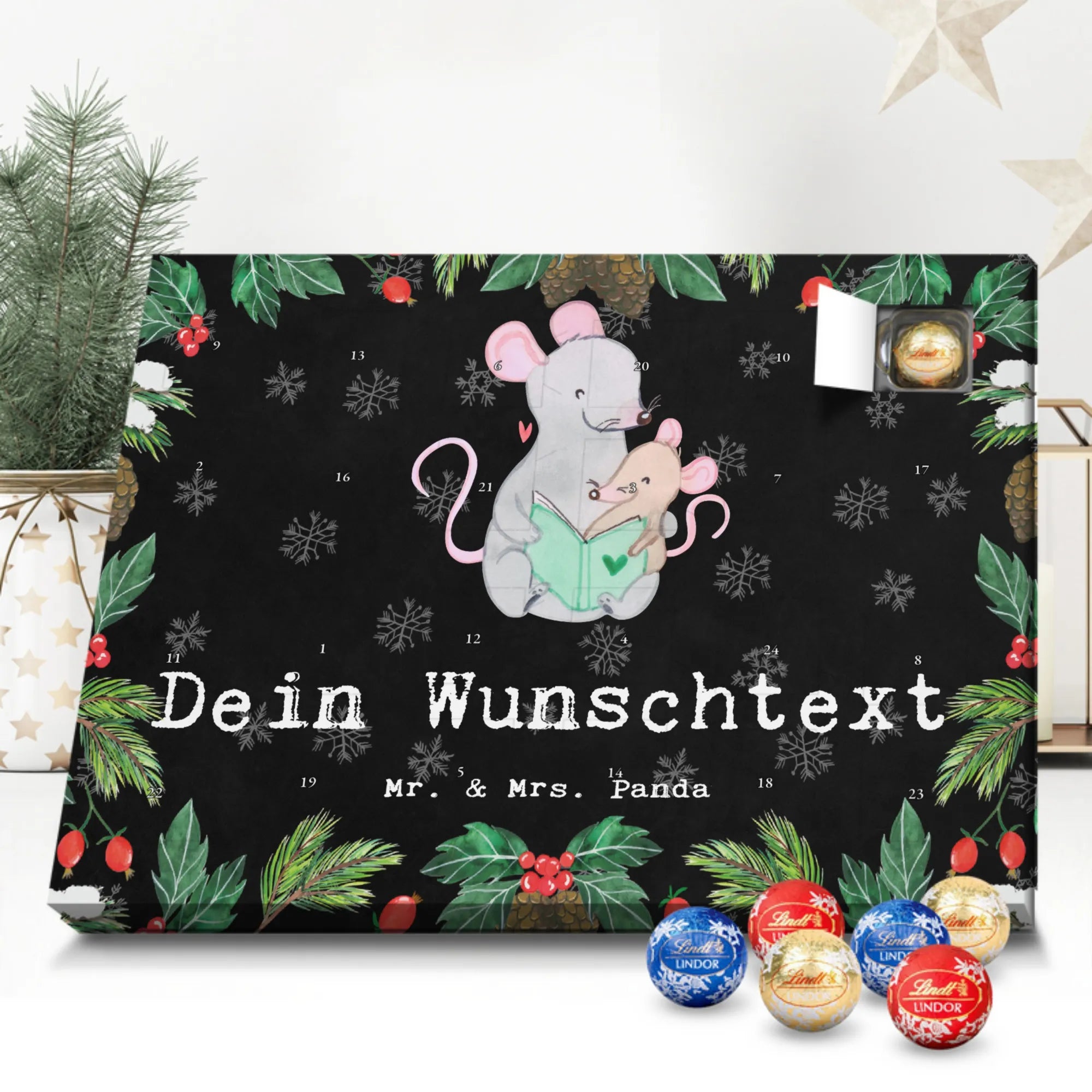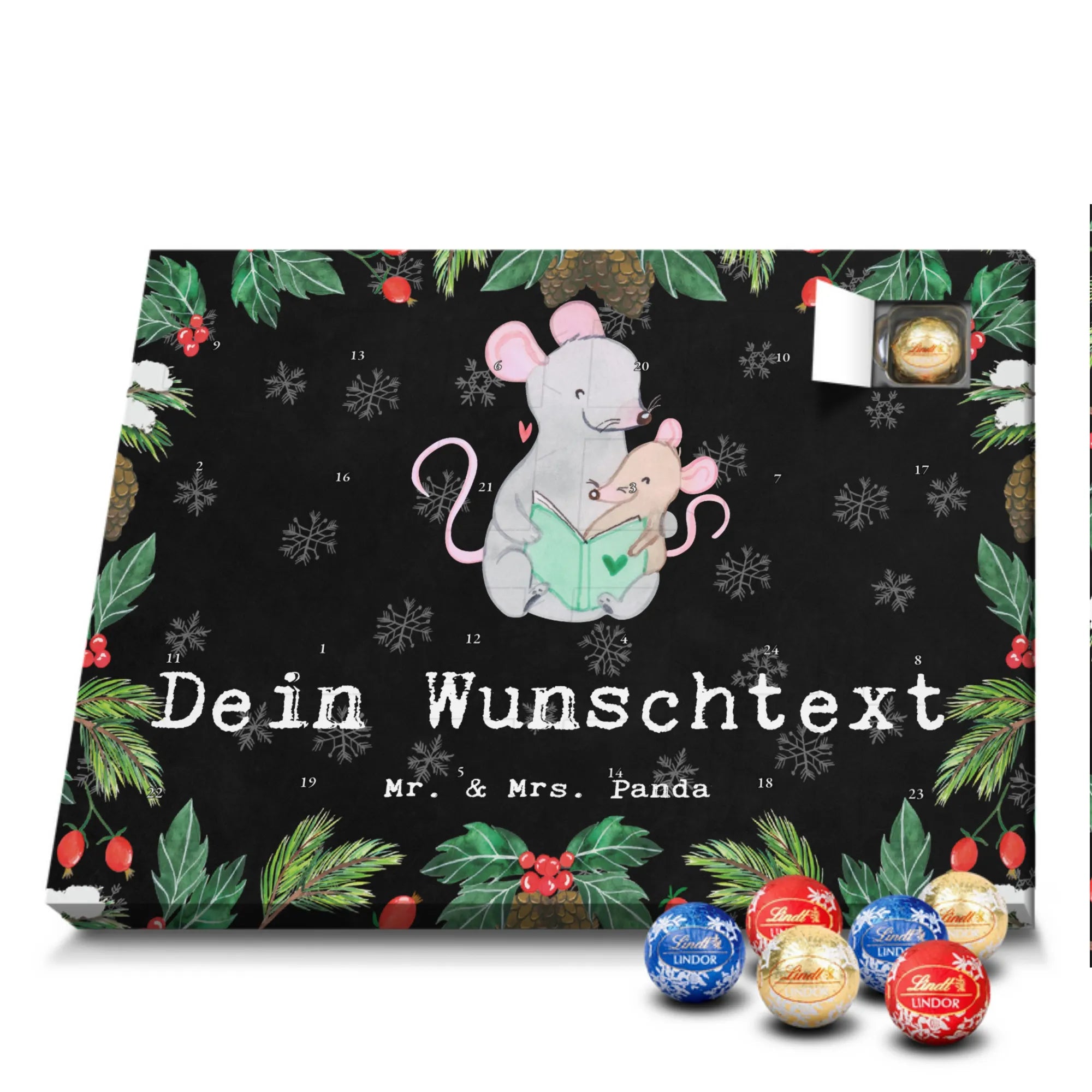 Personalisierter Schoko Adventskalender von Mr. & Mrs. Panda – der süße Countdown für dich oder deine Liebsten! Unser liebevoll gestalteter Adventskalender ist bedruckt mit wunderschönen Motiven und fröhlichen Sprüchen von Mr. & Mrs. Panda und lässt sich mit deinem Wunschnamen oder Wunschtext personalisieren. Die brillante Druckqualität kombiniert mit einer seidenmatten Oberflächenveredelung sorgt für ein edles Finish, zusätzlich sind die Seitenflächen bedruckt für ein durchgängiges Design. Maße: 233 mm x 178 mm x 24 mm. Der Kalender ist besonders praktisch: du kannst ihn entweder aufstellen oder an der Wand aufhängen – so passt er überall hin und verbreitet vorweihnachtliche Stimmung. Gefüllt mit Lindt Lindor Schokolade: 24 einzeln verpackte Markenschokoladen Kugeln in drei verschiedenen Sorten. Geschmacksrichtungen: Vollmilch, Feinherb und Weiße Schokolade. Zutaten: Zucker, pflanzliches Fett (Kokosnuss, Palmkern), Kakaobutter, Vollmilchpulver, Kakaomasse, Milchzucker, Magermilchpulver, Butterreinfett, Emulgator (Sojalecithin), Gerstenmalzextrakt, Aromen. Besondere Hinweise: Kann Haselnüsse und Mandeln enthalten. Dieser Adventskalender ist das perfekte Geschenk für Familien, Paare, Freunde oder für dich selbst – ein kleines tägliches Verwöhnmoment im Dezember. Bestell jetzt deinen personalisierten Schoko Adventskalender und zaubere ein Lächeln unter den Tannenbaum!