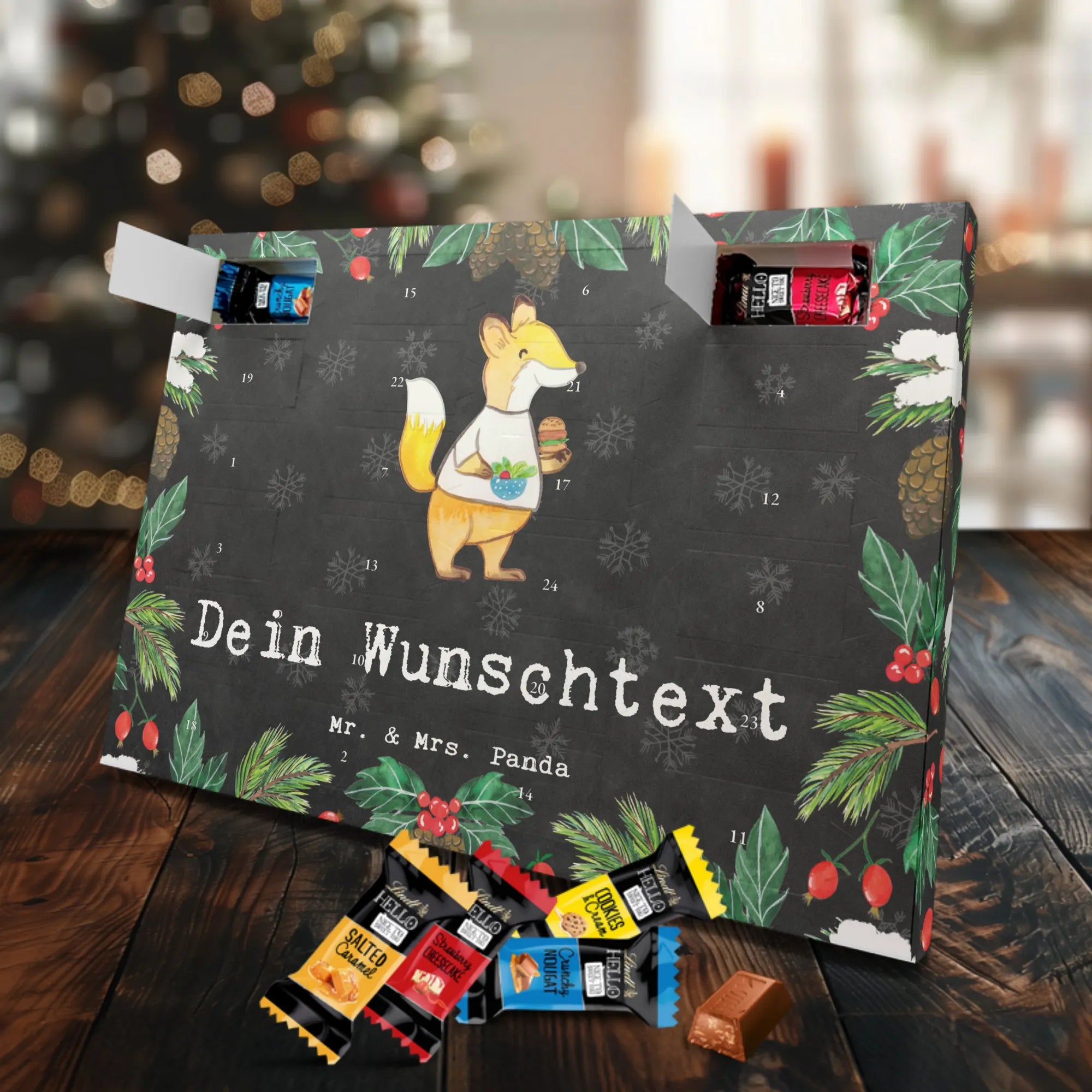 Unser Personalisierter Schoko-Adventskalender von Mr. & Mrs. Panda bringt Freude ins Adventsfenster und zaubert jedem ein Lächeln aufs Gesicht. Du gestaltest ihn ganz individuell: wähle deinen Wunschtext oder Namen und wir drucken ihn auf den Kalender – inklusive bedruckter Seitenflächen für ein rundum schönes Ergebnis. Die seidenmatte Oberflächenveredelung sorgt für eine elegante Haptik, während die brillante Druckqualität die Motive zum Strahlen bringt. Der Kalender ist flexibel einsetzbar, denn er kann aufgehängt oder einfach aufgestellt werden. Gefüllt mit Lindt Hello: 24 einzelne Schokoladen Mini Sticks in vier leckeren Geschmacksrichtungen (Karamell-Schokoladenkuchen, Kekse, Knuspriger Nougat, Erdbeer-Cheesecake). Zutaten und Allergene (Milcheiweiß, Milchzucker, Soja, Weizen, Haselnüsse; kann Mandeln und andere Schalenfrüchte enthalten) sind ausgewiesen. Ideal als persönliches Geschenk für Familienmitglieder, Freundinnen oder für dich selbst – mit viel Liebe gestaltet von Mr. & Mrs. Panda. Maße: 325 mm x 225 mm x 27 mm, praktische Größe für Regal oder Wand.