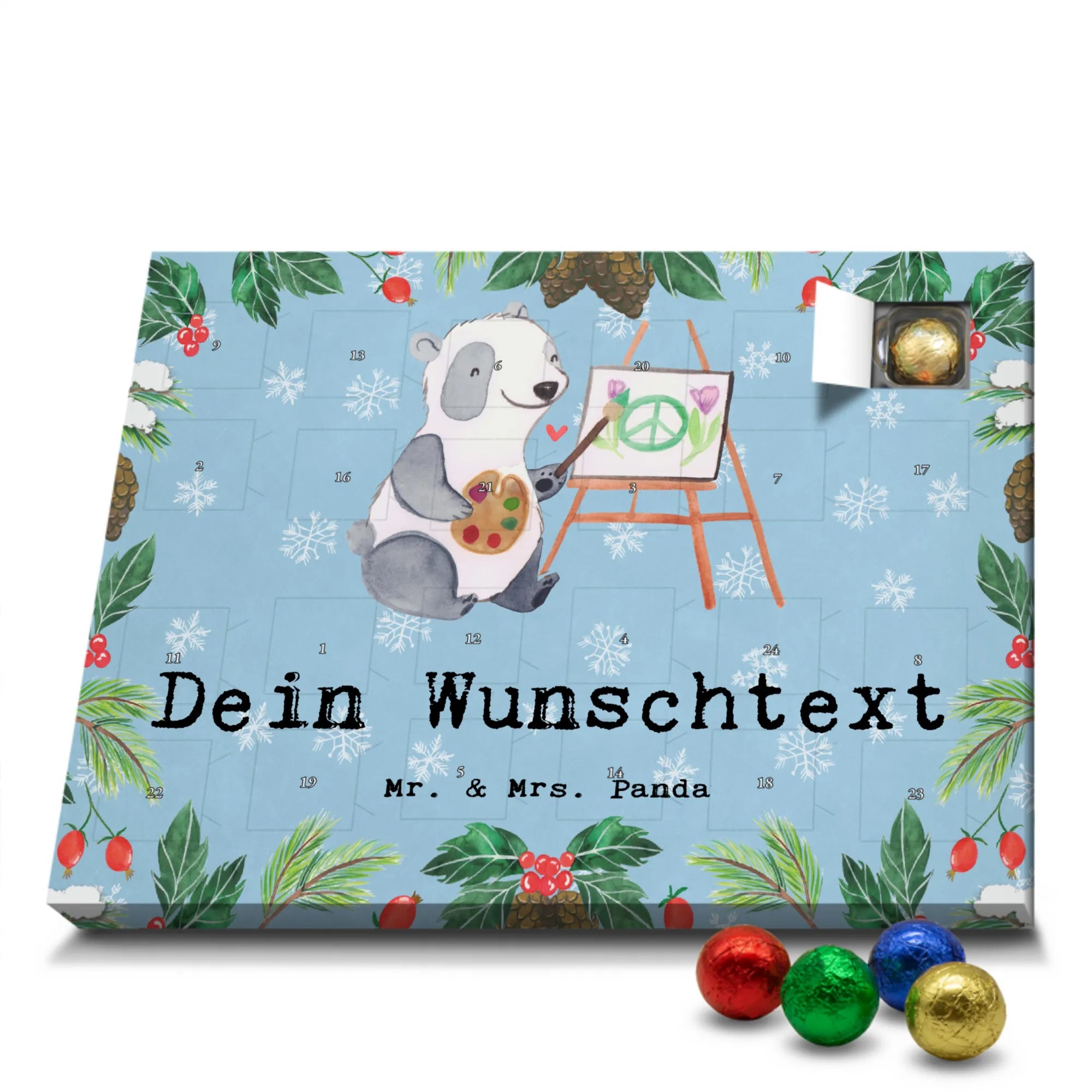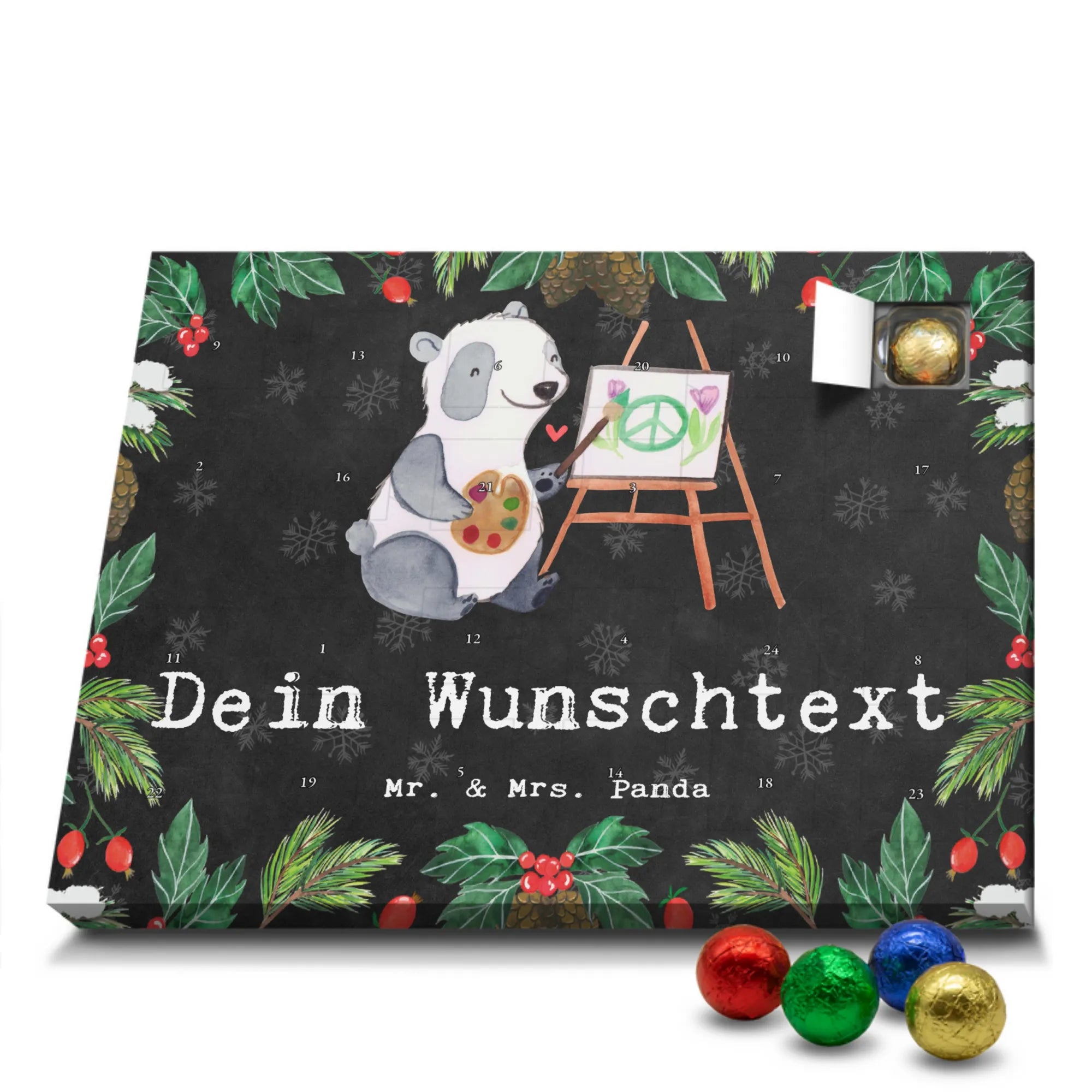 🐼 Personalisierter Adventskalender mit Wunschtext, seidenmatte Oberfläche, bedruckte Seitenflächen.