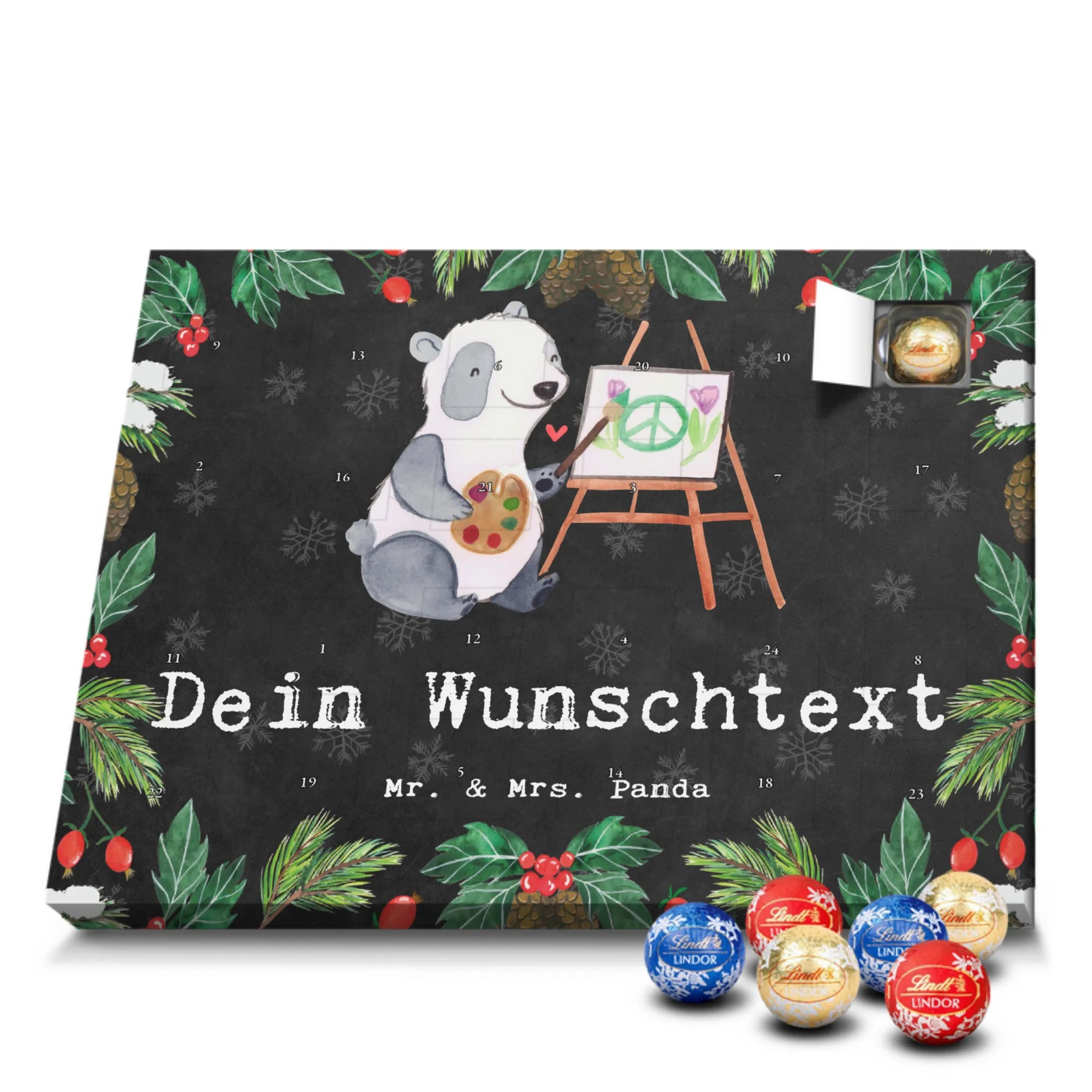 Individueller Schoko Adventskalender von Mr. & Mrs. Panda – das perfekte, persönliche Geschenk für die Adventszeit! Dieser Kalender wurde liebevoll gestaltet, mit fröhlichen Motiven und charmanten Sprüchen bedruckt und lässt sich mit deinem Wunschnamen oder einem individuellen Text versehen. Die brillante Druckqualität gepaart mit seidenmatter Oberflächenveredelung verleiht dem Kalender einen edlen Look; auch die Seitenflächen sind bedruckt, damit das Design rundum stimmig ist. Maße: 233 mm x 178 mm x 24 mm. Praktisch: Du kannst den Kalender aufstellen oder an der Wand aufhängen – ganz nach deinem Geschmack. Gefüllt mit Lindt Lindor Schokolade: 24 einzeln verpackte Markenschokoladen Kugeln in drei verführerischen Sorten. Geschmacksrichtungen: Vollmilch, Feinherb und Weiße Schokolade. Zutaten: Zucker, pflanzliches Fett (Kokosnuss, Palmkern), Kakaobutter, Vollmilchpulver, Kakaomasse, Milchzucker, Magermilchpulver, Butterreinfett, Emulgator (Sojalecithin), Gerstenmalzextrakt, Aromen. Besondere Hinweise: Kann Haselnüsse und Mandeln enthalten. Überrasche deine Liebsten mit einem persönlichen Adventskalender voller kleiner Schoko-Momente und viel Vorfreude.