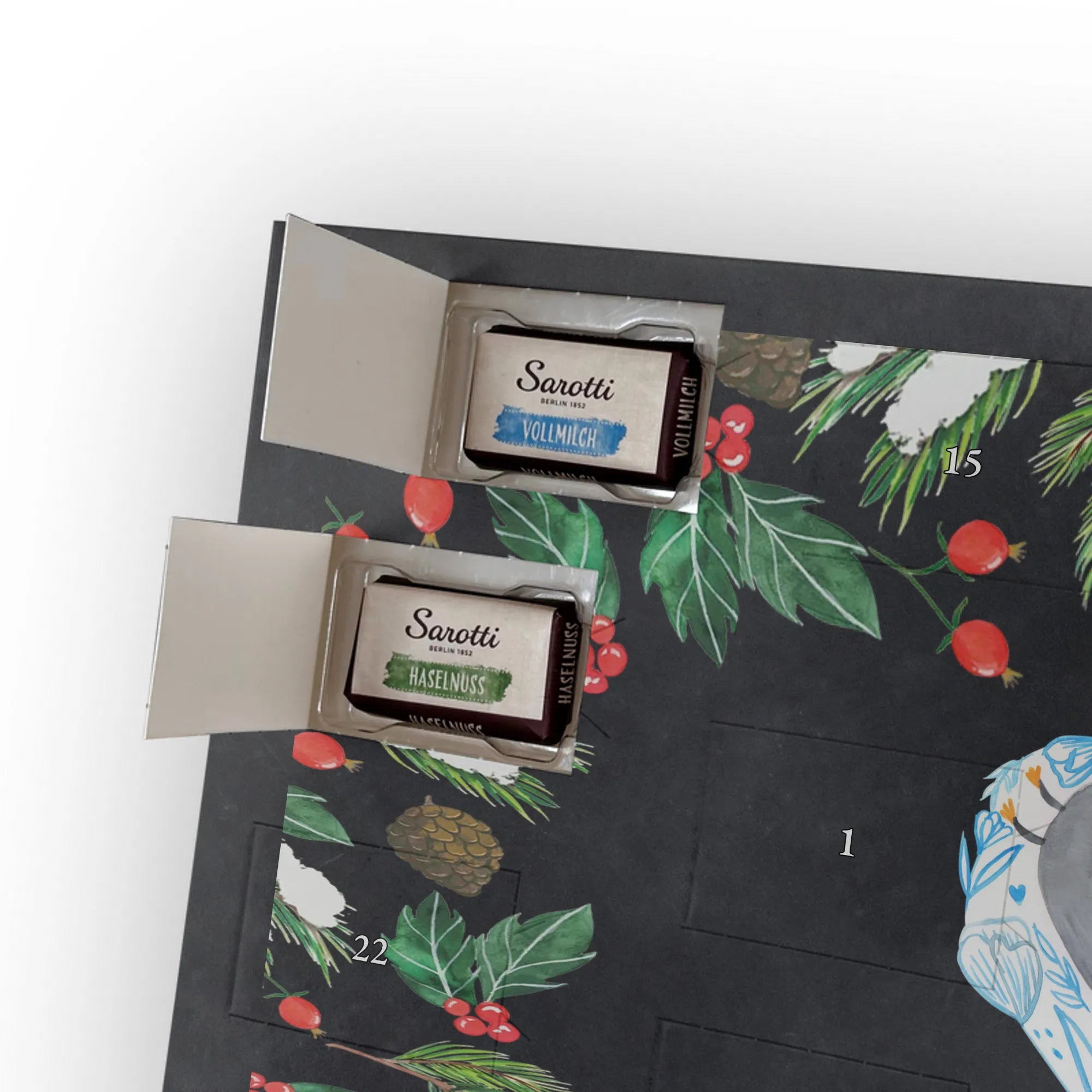 Suchst du einen besonderen Adventskalender, der persönlich und hochwertig ist? Unser Adventskalender mit Namen von Mr. & Mrs. Panda ist genau das – individualisierbar mit dem Namen deiner Liebsten oder einem kurzen Spruch und bedruckt mit unseren beliebten, charmanten Motiven. Die Druckqualität ist brillant, die seidenmatte Oberflächenveredelung verleiht dem Kalender eine elegante Haptik. Auch die Seitenflächen sind liebevoll bedruckt, sodass das Design rundum überzeugt. Du kannst den Kalender aufstellen oder an einer Stelle aufhängen, die du magst – die besondere Form macht beides möglich. Gefüllt ist der Kalender mit Ritter Sport Schokowürfeln in sechs beliebten Sorten: Mousse au Chocolat, Schoko Crisp, Voll-Nuss in Nougatcreme, Karamell Duo, Joghurt und Erdbeer-Joghurt. So gibt es hinter jedem Türchen eine kleine, leckere Überraschung. Maße: 325 mm x 225 mm x 27 mm – kompakt genug, um überall Platz zu finden, groß genug für 24 sorgfältig verpackte Schokowürfel.