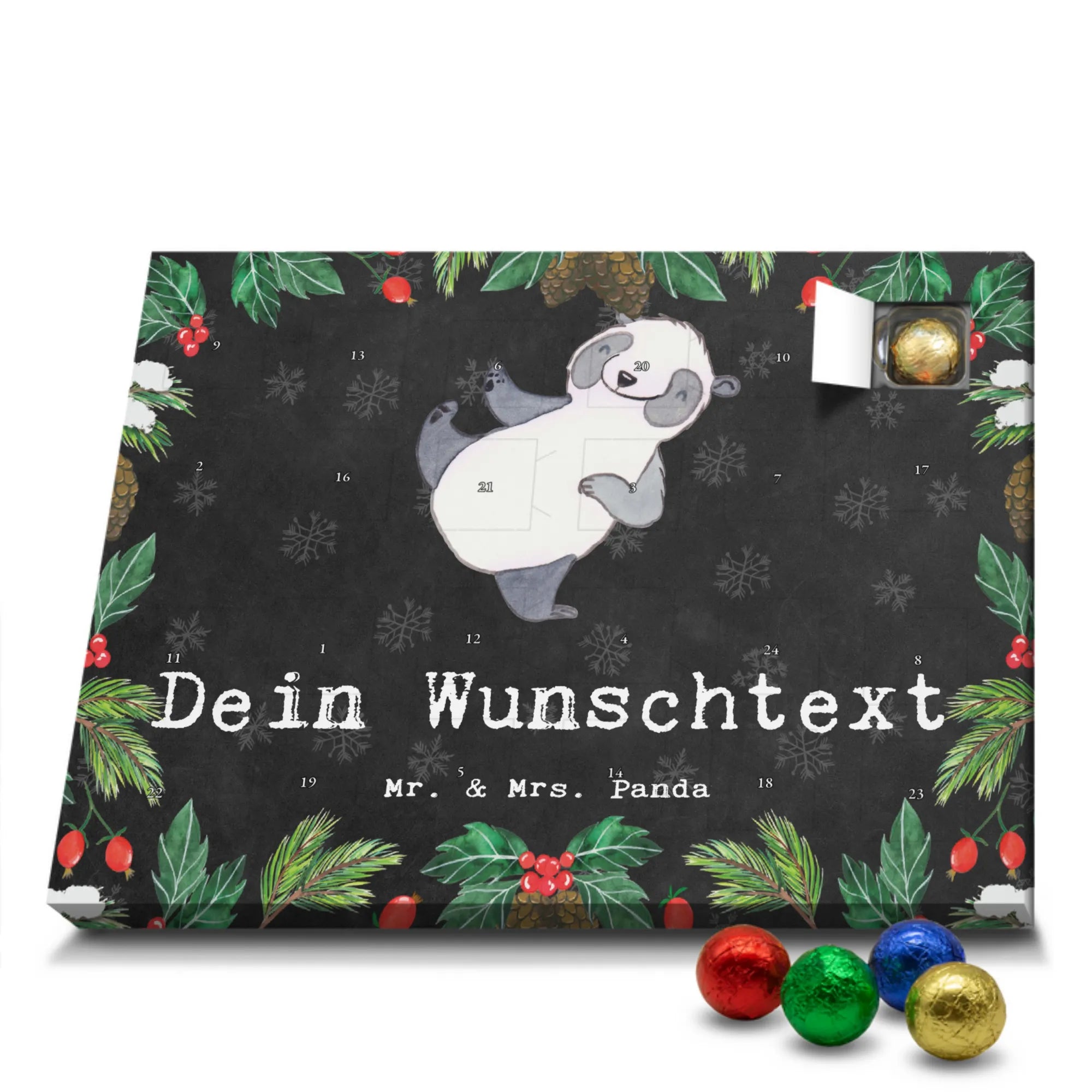 🐼 PERSONALISIERTER SCHOKO-ADVENTSKALENDER: Mit Wunschtext, bedruckt mit Mr. & Mrs. Panda Motiven, gefüllt mit MARKENNAMEN Schokolade.