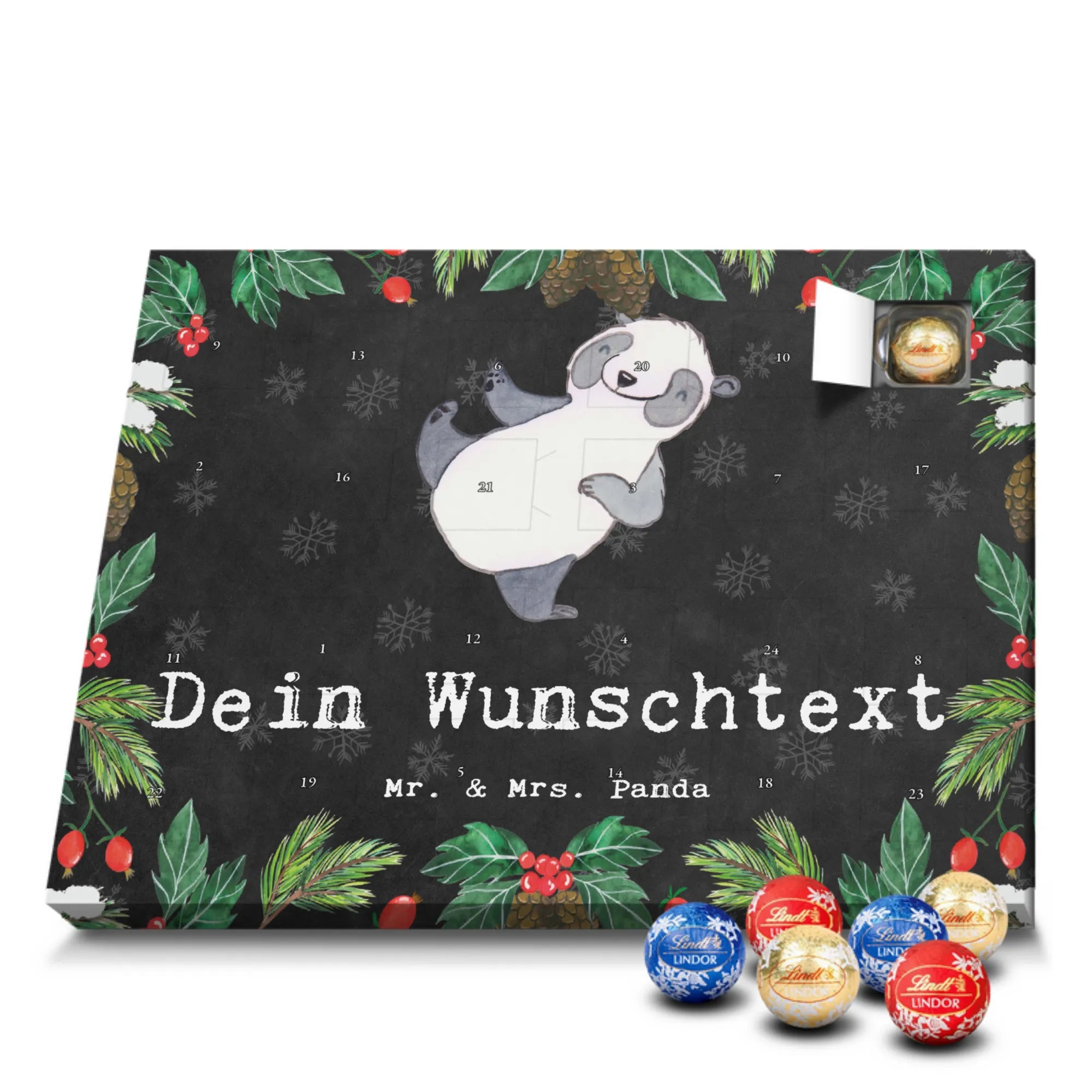 Personalisierter Schoko Adventskalender von Mr. & Mrs. Panda – der süße Countdown für dich oder deine Liebsten! Unser liebevoll gestalteter Adventskalender ist bedruckt mit wunderschönen Motiven und fröhlichen Sprüchen von Mr. & Mrs. Panda und lässt sich mit deinem Wunschnamen oder Wunschtext personalisieren. Die brillante Druckqualität kombiniert mit einer seidenmatten Oberflächenveredelung sorgt für ein edles Finish, zusätzlich sind die Seitenflächen bedruckt für ein durchgängiges Design. Maße: 233 mm x 178 mm x 24 mm. Der Kalender ist besonders praktisch: du kannst ihn entweder aufstellen oder an der Wand aufhängen – so passt er überall hin und verbreitet vorweihnachtliche Stimmung. Gefüllt mit Lindt Lindor Schokolade: 24 einzeln verpackte Markenschokoladen Kugeln in drei verschiedenen Sorten. Geschmacksrichtungen: Vollmilch, Feinherb und Weiße Schokolade. Zutaten: Zucker, pflanzliches Fett (Kokosnuss, Palmkern), Kakaobutter, Vollmilchpulver, Kakaomasse, Milchzucker, Magermilchpulver, Butterreinfett, Emulgator (Sojalecithin), Gerstenmalzextrakt, Aromen. Besondere Hinweise: Kann Haselnüsse und Mandeln enthalten. Dieser Adventskalender ist das perfekte Geschenk für Familien, Paare, Freunde oder für dich selbst – ein kleines tägliches Verwöhnmoment im Dezember. Bestell jetzt deinen personalisierten Schoko Adventskalender und zaubere ein Lächeln unter den Tannenbaum!