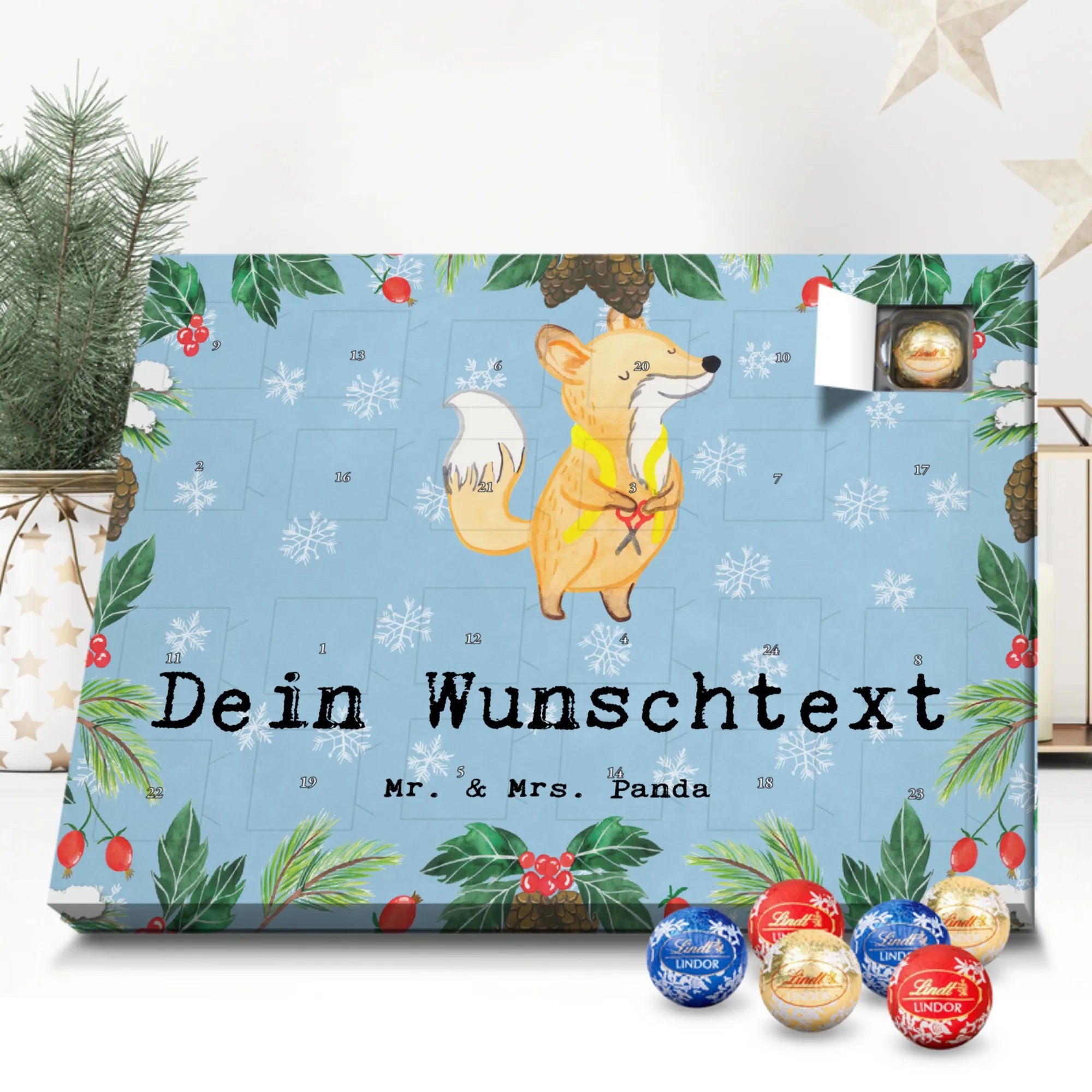Personalisierter Schoko Adventskalender von Mr. & Mrs. Panda – der süße Countdown für dich oder deine Liebsten! Unser liebevoll gestalteter Adventskalender ist bedruckt mit wunderschönen Motiven und fröhlichen Sprüchen von Mr. & Mrs. Panda und lässt sich mit deinem Wunschnamen oder Wunschtext personalisieren. Die brillante Druckqualität kombiniert mit einer seidenmatten Oberflächenveredelung sorgt für ein edles Finish, zusätzlich sind die Seitenflächen bedruckt für ein durchgängiges Design. Maße: 233 mm x 178 mm x 24 mm. Der Kalender ist besonders praktisch: du kannst ihn entweder aufstellen oder an der Wand aufhängen – so passt er überall hin und verbreitet vorweihnachtliche Stimmung. Gefüllt mit Lindt Lindor Schokolade: 24 einzeln verpackte Markenschokoladen Kugeln in drei verschiedenen Sorten. Geschmacksrichtungen: Vollmilch, Feinherb und Weiße Schokolade. Zutaten: Zucker, pflanzliches Fett (Kokosnuss, Palmkern), Kakaobutter, Vollmilchpulver, Kakaomasse, Milchzucker, Magermilchpulver, Butterreinfett, Emulgator (Sojalecithin), Gerstenmalzextrakt, Aromen. Besondere Hinweise: Kann Haselnüsse und Mandeln enthalten. Dieser Adventskalender ist das perfekte Geschenk für Familien, Paare, Freunde oder für dich selbst – ein kleines tägliches Verwöhnmoment im Dezember. Bestell jetzt deinen personalisierten Schoko Adventskalender und zaubere ein Lächeln unter den Tannenbaum!