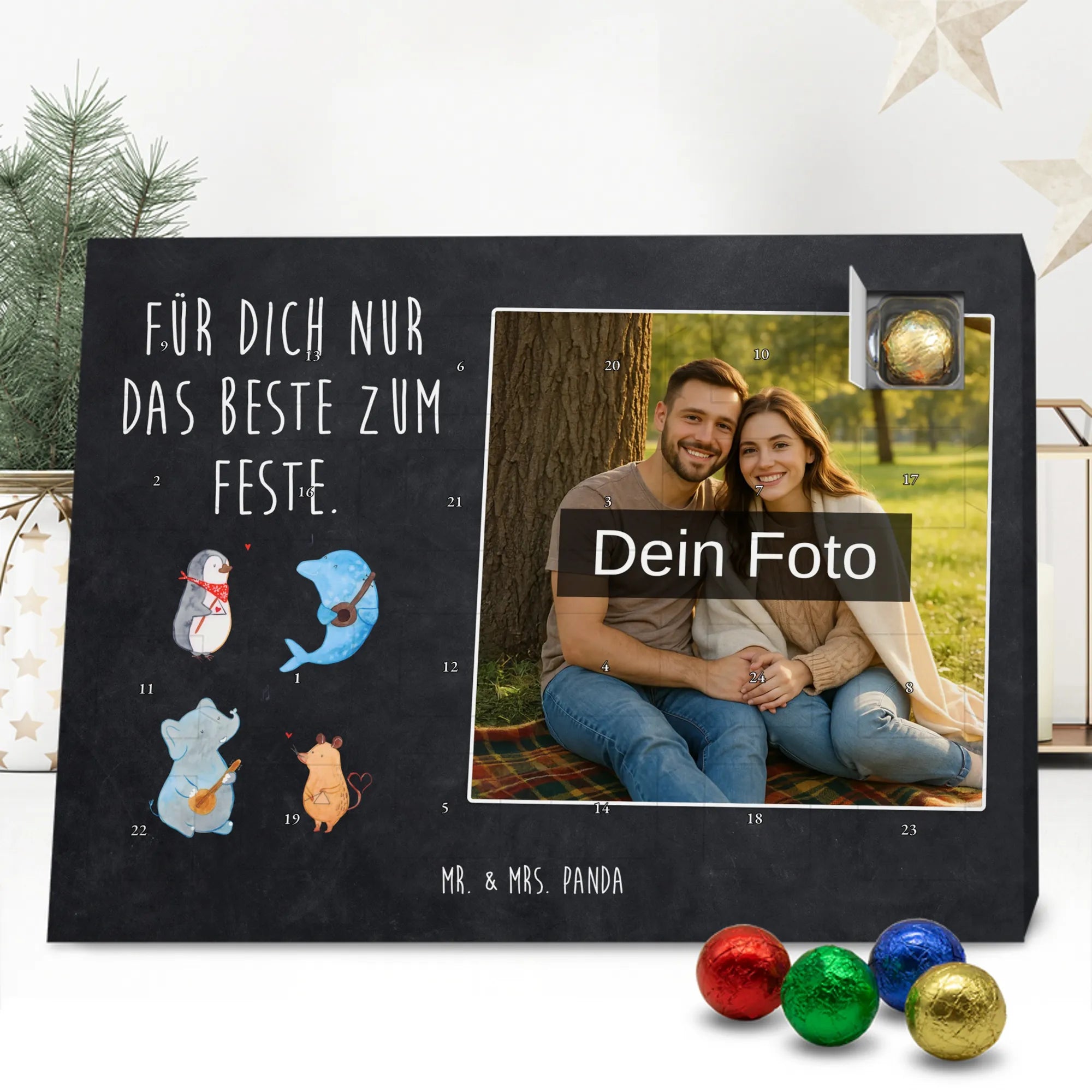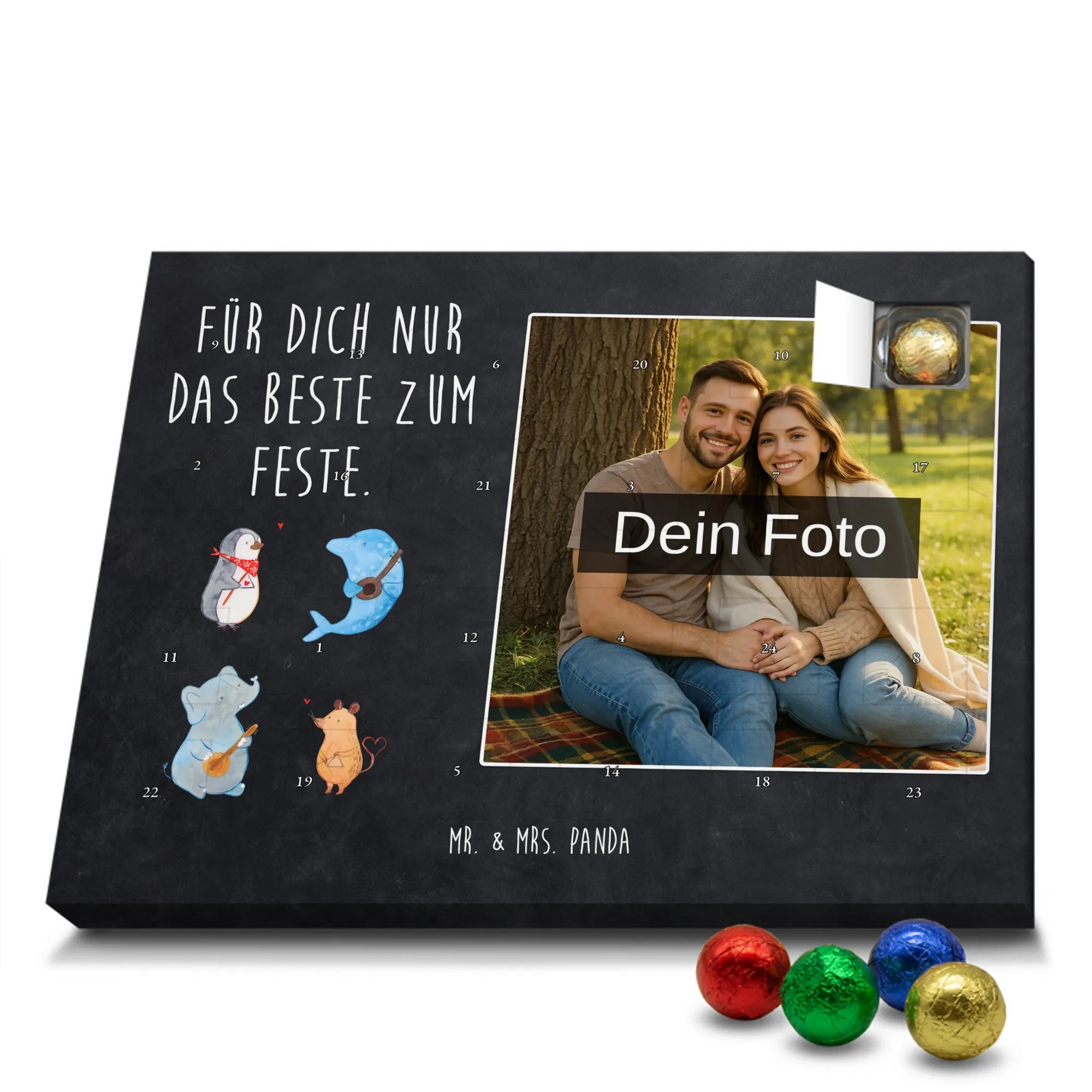 Liebevoller Foto Adventskalender personalisiert von Mr. & Mrs. Panda – der perfekte Begleiter durch die Adventszeit. Bedruckt mit unseren beliebten Motiven & Sprüchen, kannst du den Kalender mit einem persönlichen Foto versehen. Achte auf hohe Auflösung und einen passenden Bildausschnitt, damit das Motiv optimal zur Geltung kommt. Verwende nur Bilder, für die du die Rechte besitzt, um rechtliche Probleme zu vermeiden. Der Kalender bietet brillante Druckqualität, eine seidenmatte Oberflächenveredelung und bedruckte Seitenflächen. Maße: 233 mm x 178 mm x 24 mm. Besonderheit: Er lässt sich sowohl aufstellen als auch aufhängen. Bitte beachte: Die Fotos werden weder aufbereitet noch zugeschnitten, daher ist eine Rücknahme bei personalisierten Foto-Artikeln ausgeschlossen. Gefüllt mit MARKENNAMEN Schokolade und leckeren Schokoladenkugeln. Hinweis: Kann Spuren von Haselnüssen, Mandeln, Gluten und Soja enthalten. Kühl und trocken lagern. Schenke persönliche Vorfreude – jeden Tag ein kleines Highlight mit Schokolade und Erinnerungen.