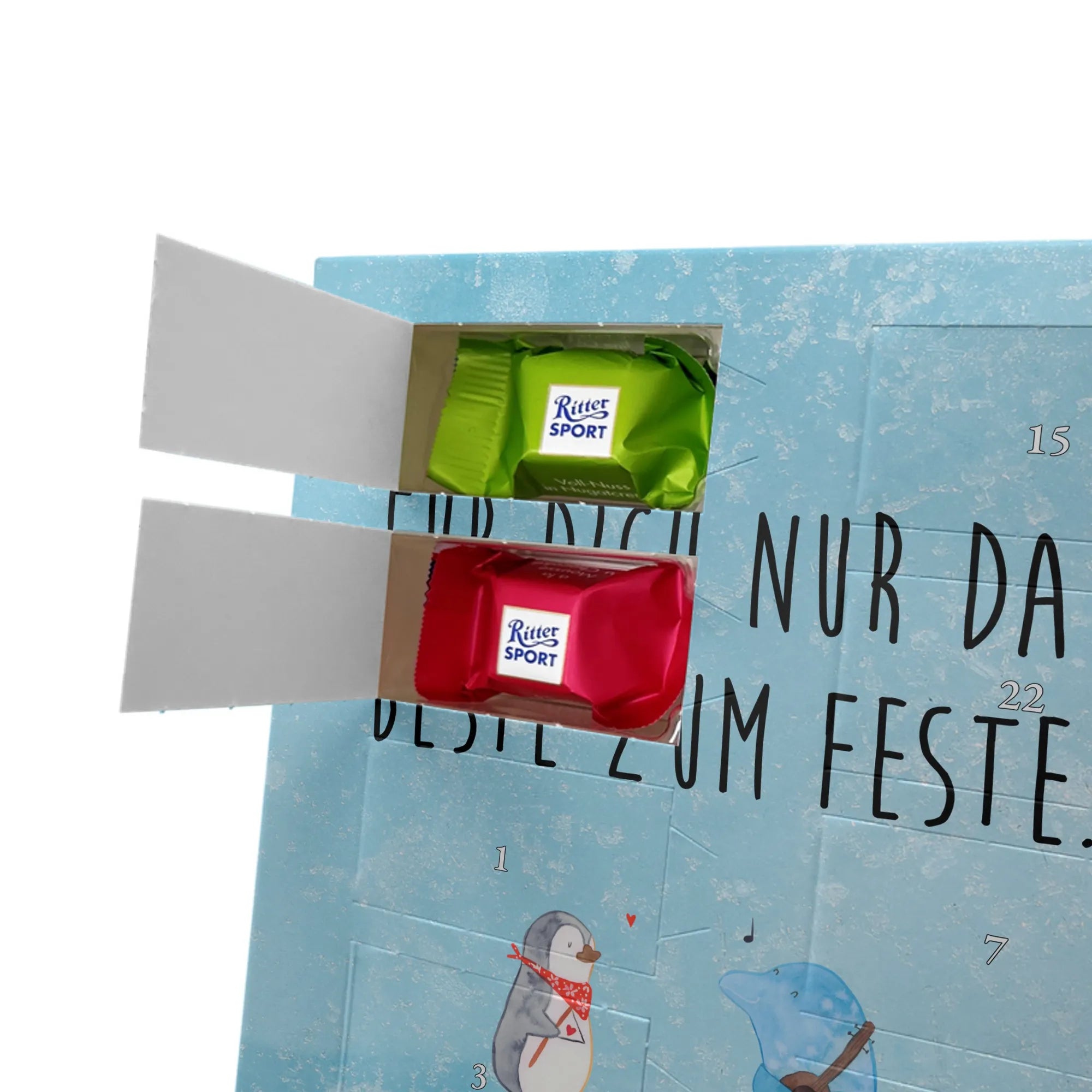 Schoko Foto Adventskalender personalisiert – ein fröhlicher Hingucker von Mr. & Mrs. Panda, der Adventszeit und Erinnerungen verbindet. Der Kalender ist bedruckt mit zauberhaften Motiven & Sprüchen von Mr. & Mrs. Panda und lässt sich ganz leicht mit einem Foto deiner Wahl personalisieren. Achtung Bildqualität: Für ein scharfes Druckbild solltest du ein Foto in hoher Auflösung verwenden. Kontrolliere den Bildausschnitt, damit wichtige Gesichter oder Details nicht verloren gehen. Verwende nur Fotos, für die du die Rechte besitzt oder die frei nutzbar sind. Bitte beachte: Die Fotos werden weder nachbearbeitet noch zugeschnitten und personalisierte Foto Artikel sind vom Umtausch ausgeschlossen. Die Verarbeitung überzeugt mit seidenmatter Oberflächenveredelung und bedruckten Seitenflächen für ein edles Finish. Maße: 325 mm x 225 mm x 27 mm. Besonderheit: Du kannst den Kalender aufhängen oder aufstellen – ganz flexibel. Gefüllt ist der Kalender mit Ritter Sport Schokowürfeln in leckeren Geschmacksrichtungen wie Mousse au Chocolat, Schoko Crisp, Voll-Nuss in Nougatcreme, Karamell Duo, Joghurt und Erdbeer-Joghurt. Ein liebevolles Geschenk, das jeden Tag im Advent versüßt.