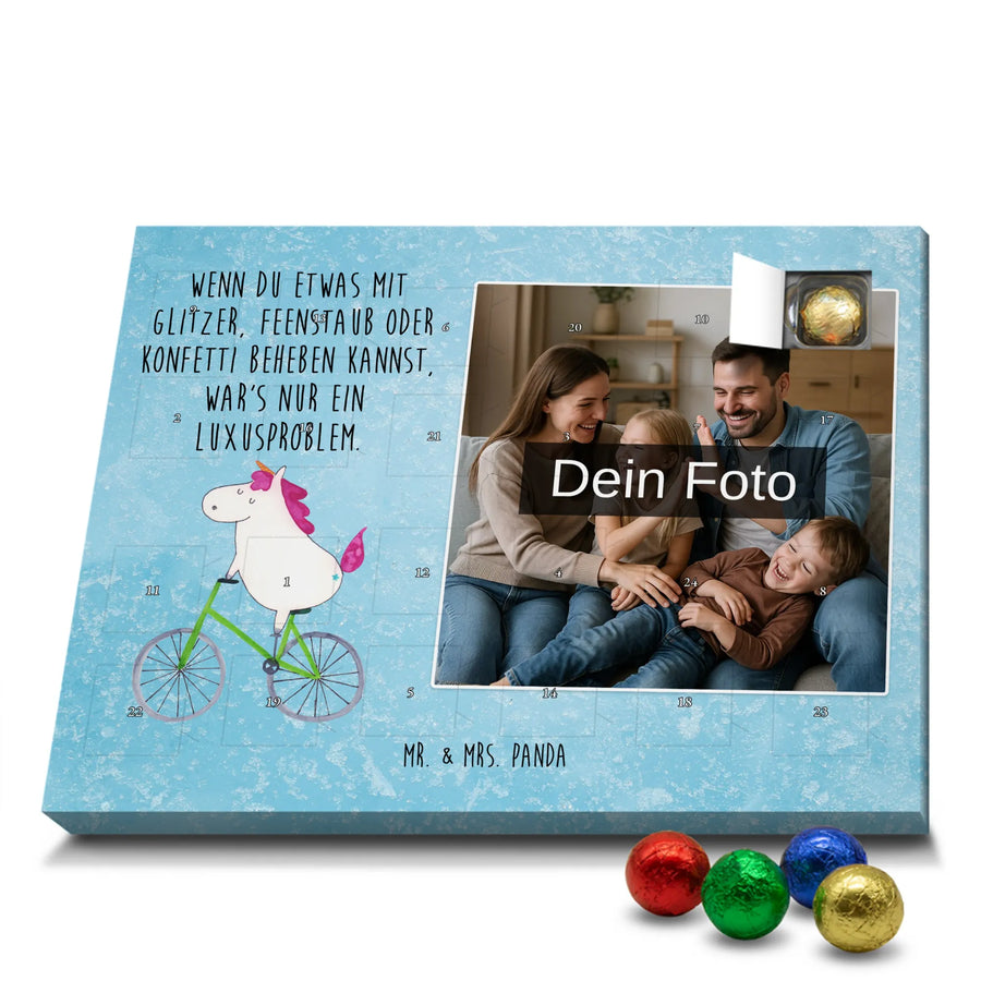 Personalisierter Schoko Foto Adventskalender Einhorn Radfahrer - Classic - Eisblau