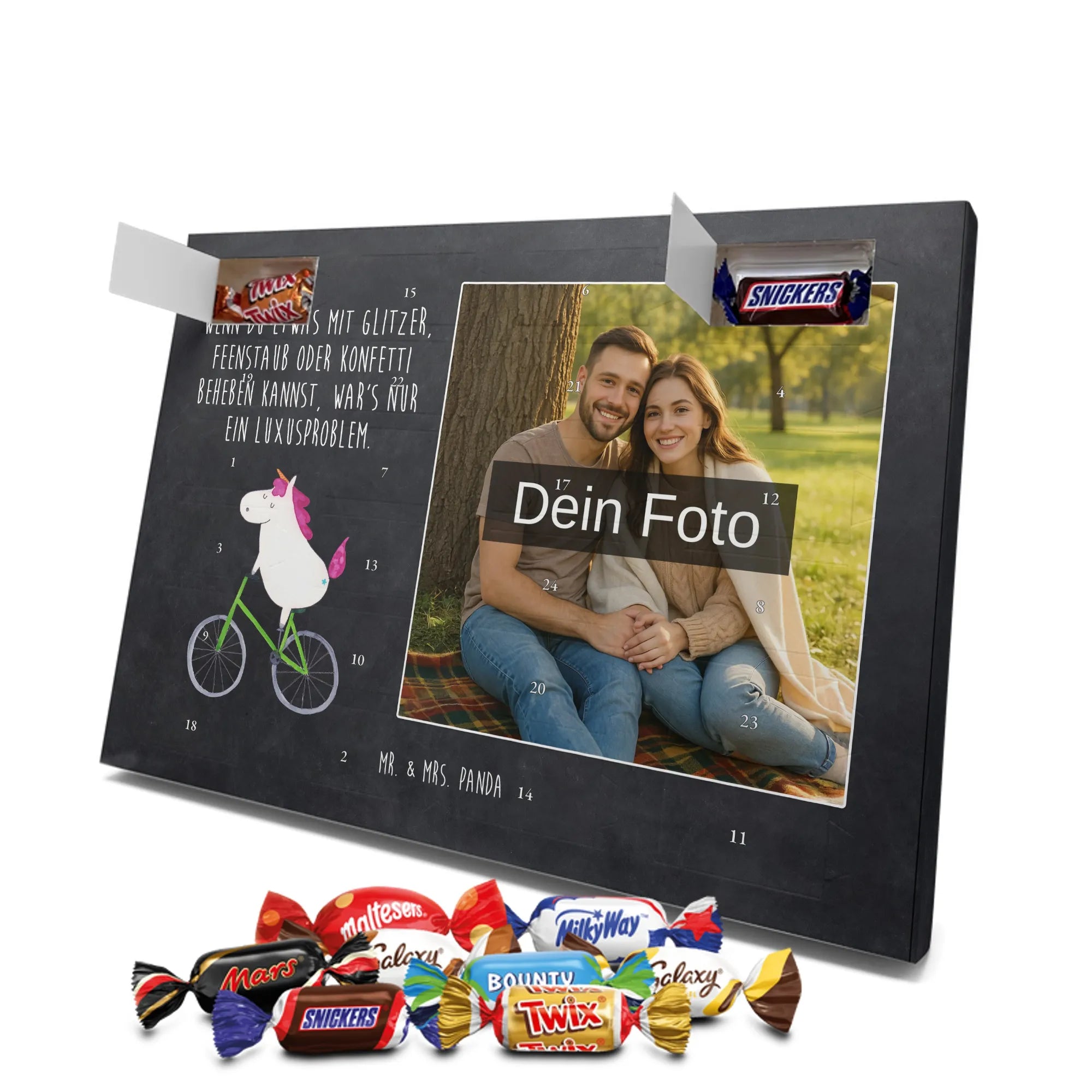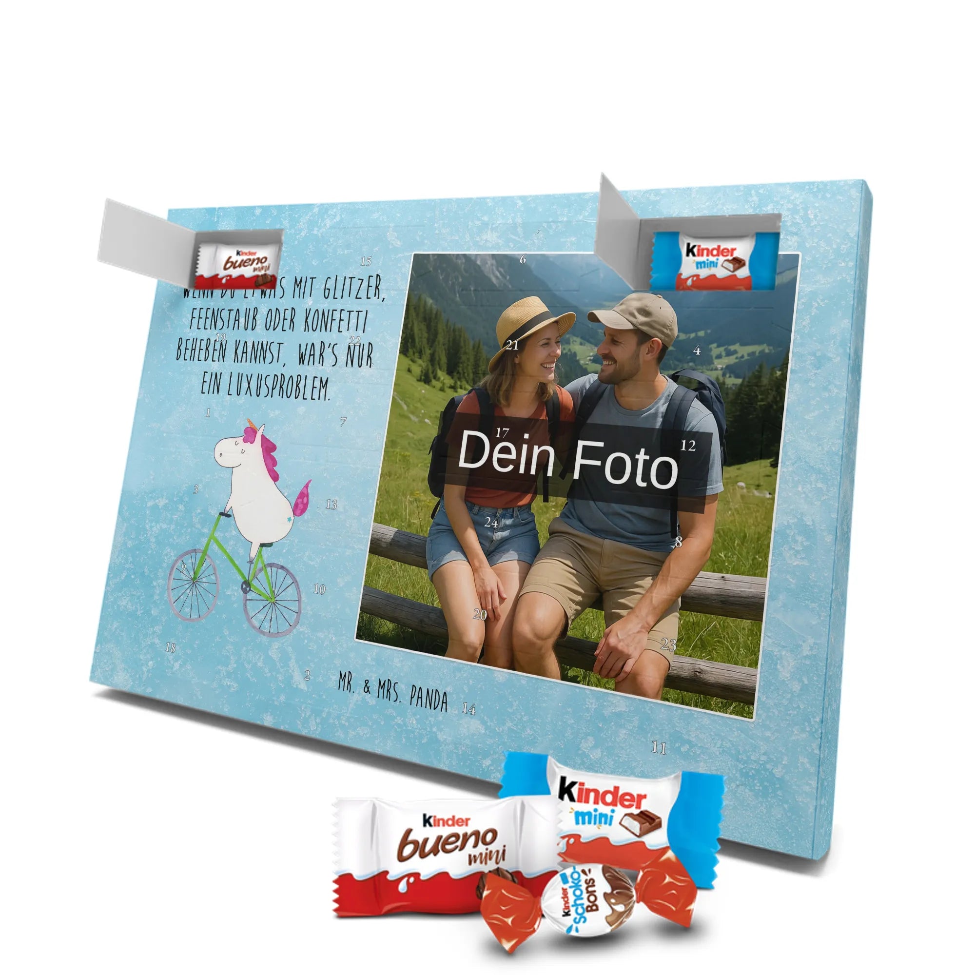 Personalisierter Schoko-Foto-Adventskalender von Mr. & Mrs. Panda – perfekt, wenn du ein einzigartiges, herzhaft-süßes Geschenk suchst. Du lädst ein Foto hoch, das wir auf der Vorderseite platzieren; der Rest des Kalenders ist mit unseren liebevollen Illustrationen und frechen Sprüchen gestaltet. Achte bitte darauf, dass das Bild eine hohe Auflösung hat und der Bildausschnitt passt, damit das Druckbild schön und scharf wird. Lade nur Fotos hoch, an denen du die Rechte besitzt oder für die du die Erlaubnis hast. Wichtig: Wir bearbeiten oder kürzen die Fotos nicht und personalisierte Artikel sind vom Rückgaberecht ausgeschlossen. Die hochwertige, seidenmatte Oberflächenveredelung sorgt für edle Optik, die bedruckten Seitenflächen geben dem Kalender eine liebevolle Note. Maße: 355 mm x 245 mm x 11 mm. Du kannst den Kalender aufstellen oder aufhängen – ganz wie du möchtest. Gefüllt ist er mit kinder® Schokolade: enthalten sind kinder® Schoko-Bons, kinder® Bueno mini und kinder® Schokolade mini. Wir empfehlen, vor dem Hochladen den Bildausschnitt am Bildschirm zu prüfen, damit Gesichter und wichtige Details nicht abgeschnitten werden. Dieser Adventskalender ist ideal für Paare, Familien und als persönliches Mitbringsel – mit ganz viel Mr. & Mrs. Panda Herz.