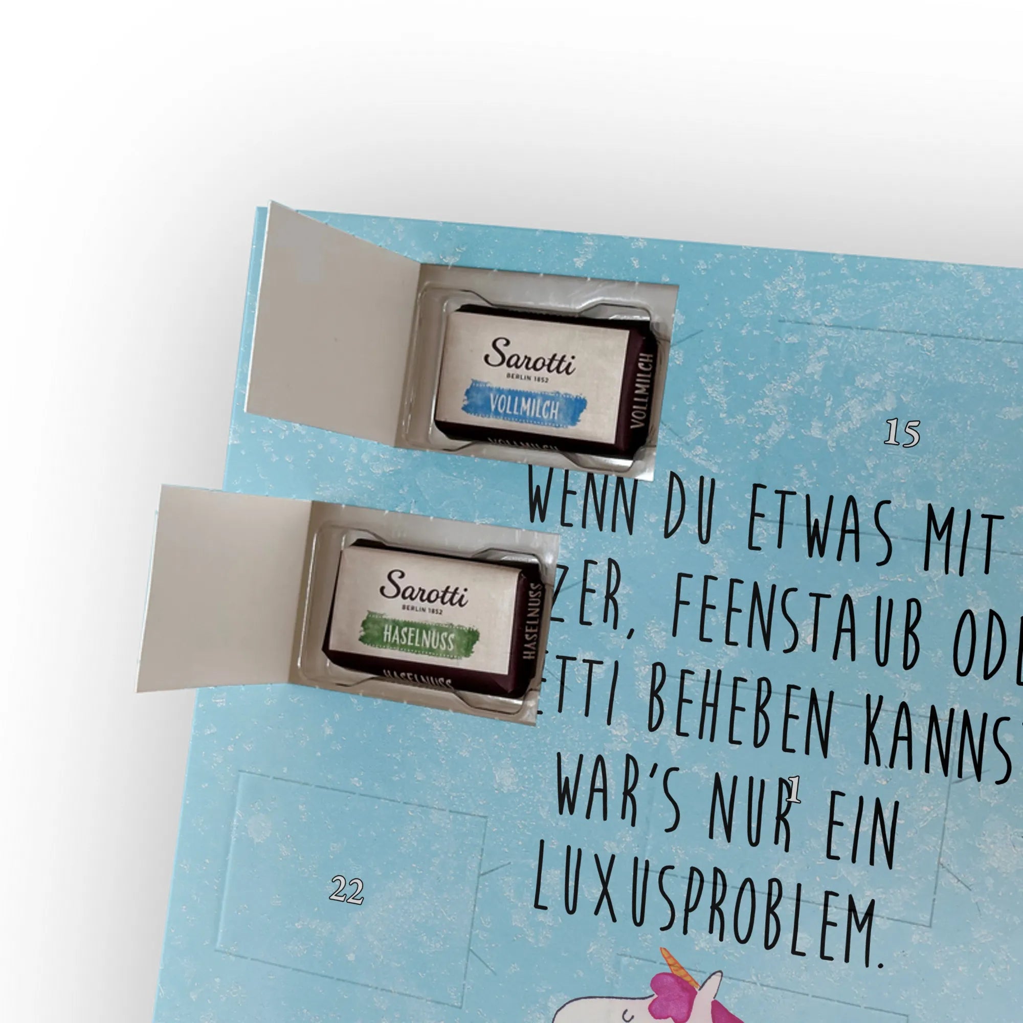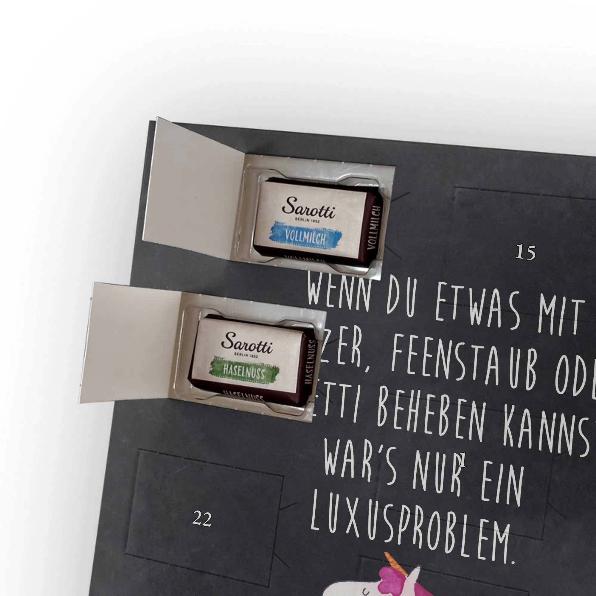 Personalisierter Schoko-Adventskalender mit Foto – das kleine Weihnachtswunder von Mr. & Mrs. Panda! Verschenke jeden Tag Vorfreude: Der Kalender ist liebevoll gestaltet mit unseren herzlichen Illustrationen und Sprüchen, während dein Foto die persönliche Mitte bildet. Bitte lade ein hochauflösendes Foto hoch und prüfe den Bildausschnitt, damit nichts Wichtiges verloren geht. Nutze nur Bilder, für die du die Rechte hast. Die hochwertige, seidenmatte Veredelung und die bedruckten Seitenflächen garantieren ein edles Erscheinungsbild. Maße: 355 mm x 245 mm x 11 mm; lässt sich sowohl aufhängen als auch aufstellen. Achtung: Fotos werden nicht nachbearbeitet oder zugeschnitten; personalisierte Artikel sind vom Rückgaberecht ausgeschlossen. Gefüllt mit 24 einzeln verpackten Schokoladentäfelchen aus den vier Geschmacksrichtungen Vollmilch, Nougat, Zartbitter und Haselnuss – von Sarotti® und Confiserie Heidel®. Insgesamt enthält der Kalender 107 g Markenschokolade. Ein persönliches Geschenk mit süßem Inhalt, ideal für Partner, Familie und Freunde, verpackt mit der typischen Mr. & Mrs. Panda Liebe zum Detail.