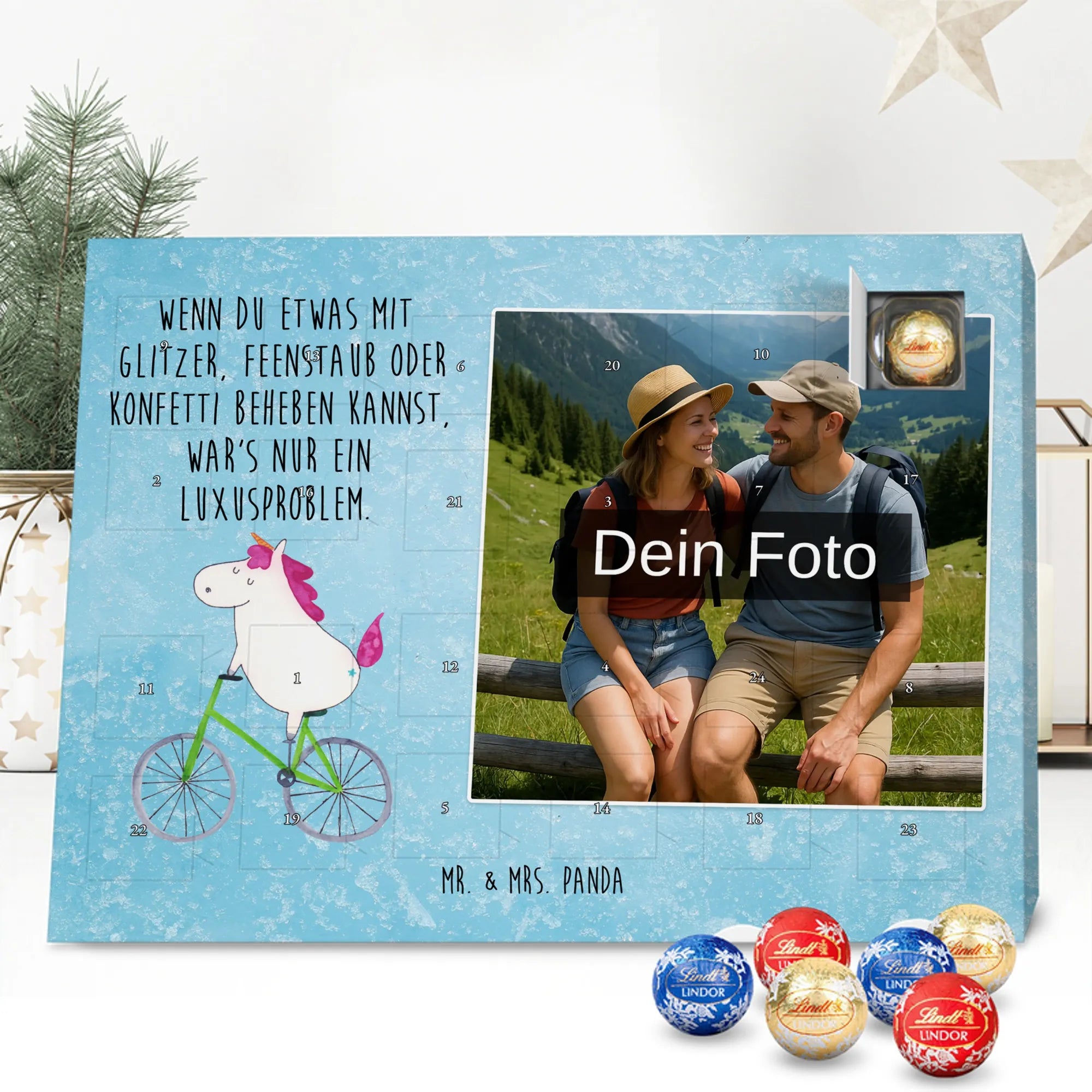 Mach die Adventszeit persönlich mit unserem Personalisiertes Schoko Foto-Adventskalender von Mr. & Mrs. Panda. Dieser Kalender kombiniert dein Lieblingsfoto mit unseren fröhlichen Illustrationen und liebevollen Sprüchen – perfekt als Geschenk für Partner, Familie oder Freunde. Für ein optimales Druckergebnis bitte ein hochauflösendes Bild verwenden und den Bildausschnitt so wählen, dass wichtige Details nicht verloren gehen. Beachte, dass wir Fotos nicht nachbearbeiten oder zuschneiden; lade nur Bilder hoch, für die du die Rechte besitzt. Die hochwertige Verarbeitung beinhaltet eine seidenmatte Oberflächenveredelung und bedruckte Seitenflächen, außerdem ist der Kalender robust und kann aufgehängt oder aufgestellt werden. Maße: 233 mm x 178 mm x 24 mm. Gefüllt mit Lindt Lindor Markenschokolade: 24 einzeln verpackte Kugeln in den Sorten Vollmilch, Feinherb und Weiße Schokolade. Inhaltsstoffe und Allergene sind angegeben; es kann Haselnüsse und Mandeln enthalten. Hinweis: Personalisierte Foto-Artikel sind vom Umtausch ausgeschlossen. Ein süßer, persönlicher Adventsgruß von Mr. & Mrs. Panda.