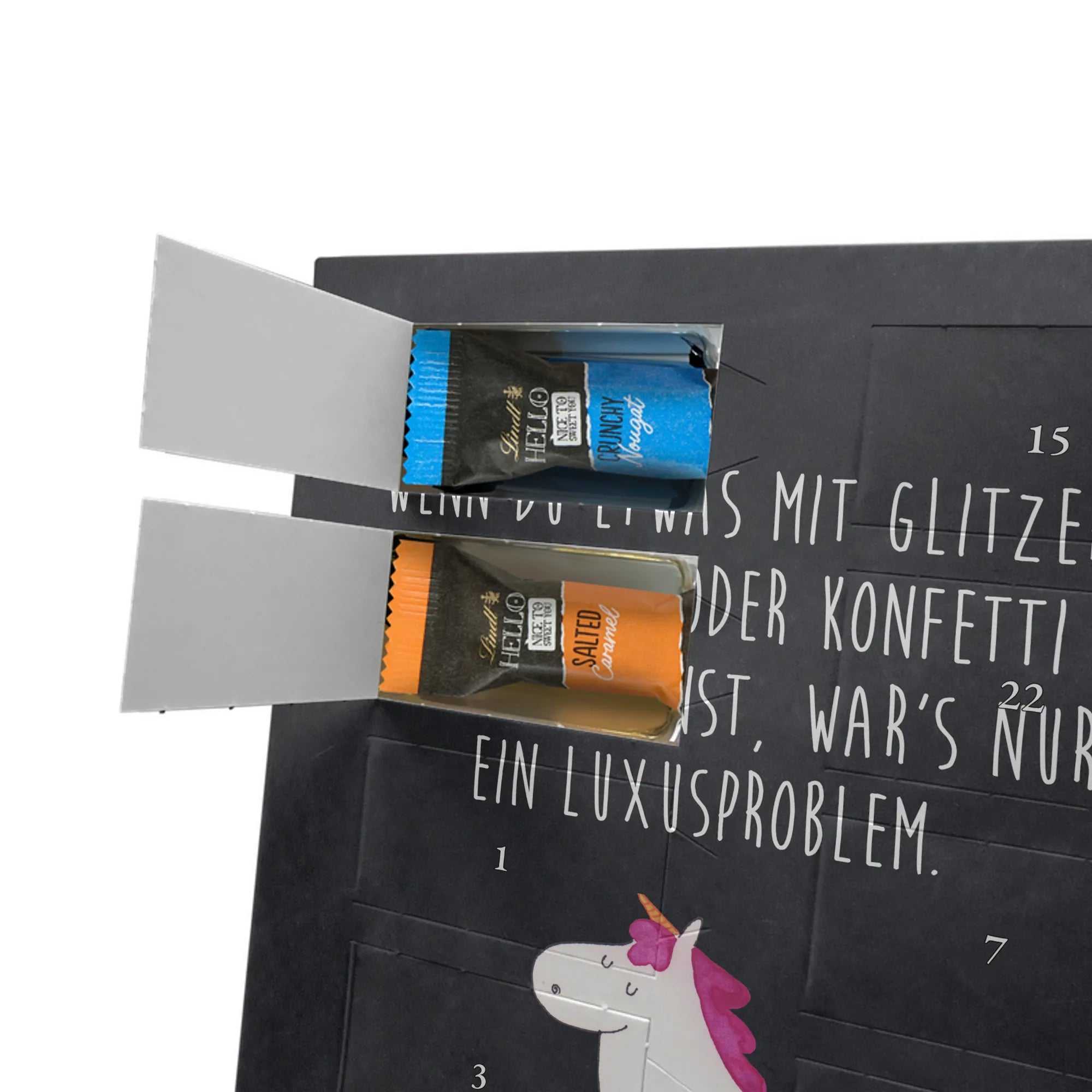 Verschenke Vorfreude: Unser individueller Foto-Adventskalender mit Schokolade von Mr. & Mrs. Panda macht jeden Dezembertag zum kleinen Fest. Der Kalender kombiniert bezaubernde Illustrationen und Sprüche von Mr. & Mrs. Panda mit deinem eigenen Foto – so entsteht ein ganz persönliches Geschenk. Achte auf Bildqualität und Bildausschnitt, damit das Foto optimal zur Geltung kommt, und nutze nur Bilder, für die du die Rechte besitzt. Die hochwertige seidenmatte Oberfläche mit bedruckten Seitenflächen veredelt das Design. Maße: 325 mm x 225 mm x 27 mm. Gefüllt mit Lindt Hello Schokolade: 24 einzeln verpackte Mini Sticks in den Sorten Karamell-Schokoladenkuchen, Kekse, Knuspriger Nougat und Erdbeer-Cheesecake. Zutaten und Allergene findest du auf der Verpackung; enthalten sind z. B. Milcheiweiß, Milchzucker, Soja, Weizen und Haselnüsse. Besonderheit: Du kannst den Kalender aufstellen oder an der Wand aufhängen. Bitte beachten: Die Fotos werden weder aufbereitet noch zugeschnitten – personalisierte Foto-Artikel sind vom Rückgaberecht ausgeschlossen. Hol dir ein Stück Adventszauber mit deinem persönlichen Foto-Adventskalender!