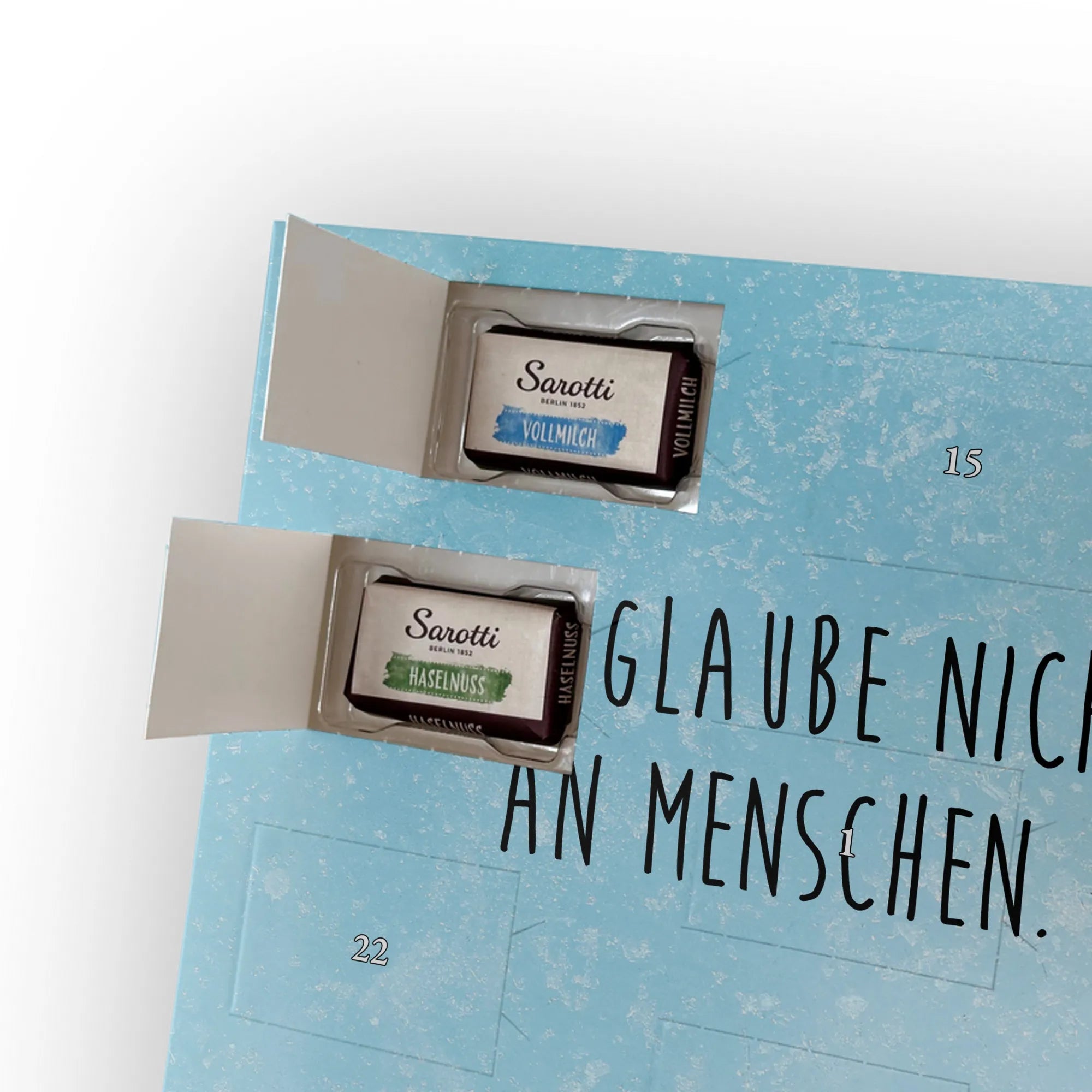 Personalisierter Schoko Foto Adventskalender – die süße, individuelle Adventsüberraschung von Mr. & Mrs. Panda! Jeder Kalender ist bedruckt mit unseren liebevollen Motiven und Sprüchen und kann mit deinem persönlichen Foto gestaltet werden. Für ein perfektes Druckergebnis achte bitte auf eine hohe Auflösung des Fotos und auf einen passenden Bildausschnitt; lade nur Bilder hoch, für die du die Rechte besitzt. Der Kalender überzeugt durch brillante Druckqualität, seidenmatte Oberflächenveredelung und bedruckte Seitenflächen. Maße: 355 mm x 245 mm x 11 mm – ideal zum Hinstellen oder Aufhängen. Hinweis: Die Fotos werden weder aufbereitet noch zugeschnitten; personalisierte Foto Artikel sind vom Rückgaberecht ausgeschlossen. Gefüllt mit einer hochwertigen Auswahl: 24 einzeln verpackte Schokoladentäfelchen in den Geschmacksrichtungen Vollmilch, Nougat, Zartbitter und Haselnuss von Sarotti® und Confiserie Heidel®. Insgesamt 107 g Markenschokolade sorgen für köstliche Adventsmomente. Verschenke Erinnerungen und Schokolade – ein persönliches Statement unter dem Weihnachtsbaum, mit ganz viel Mr. & Mrs. Panda Herz.