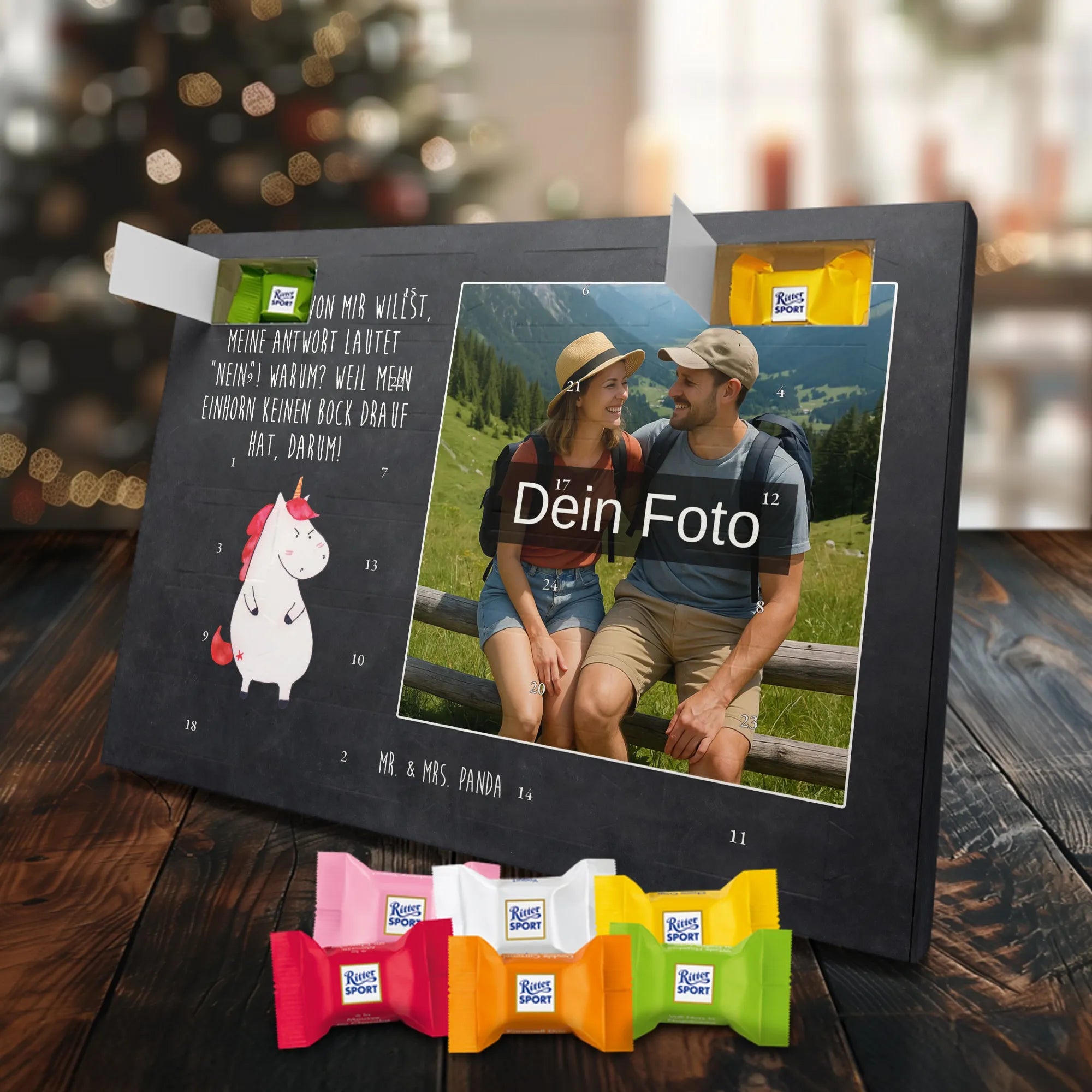 🐼 Personalisierter Schoko Foto Adventskalender mit deinem Foto, Mr. & Mrs. Panda Sprüchen und kinder® Schokolade.