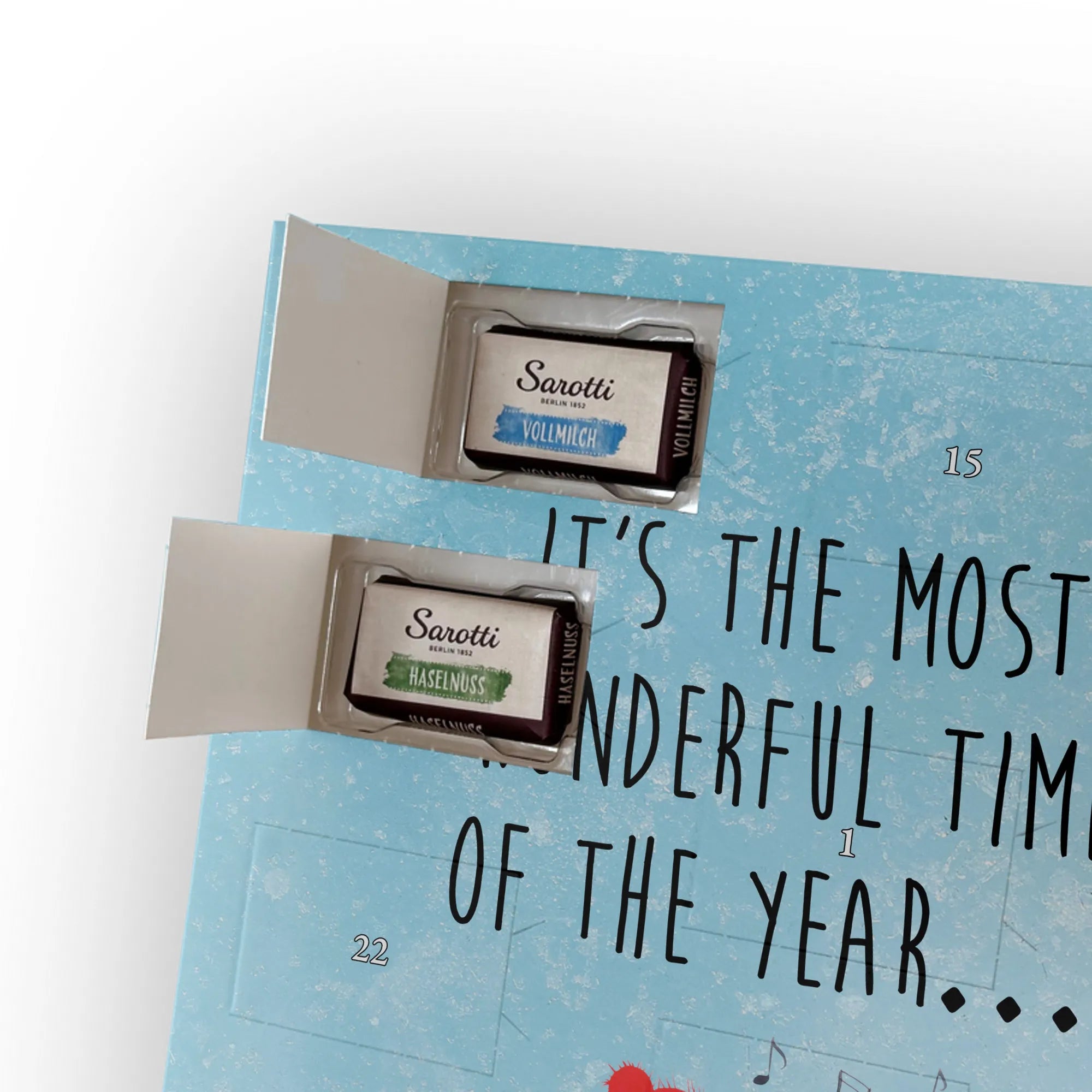 Schoko Foto Adventskalender personalisiert – ein zauberhaftes Geschenk, das Erinnerungen und Geschmack vereint. Mr. & Mrs. Panda haben liebevolle Motive und Sprüche gestaltet, die den Kalender umrahmen; dein Foto setzt die persönliche Note. Für ein optimales Druckbild lade bitte ein Foto mit hoher Auflösung hoch und achte auf einen passenden Bildausschnitt, damit wichtige Details nicht abgeschnitten werden. Bitte nur Bilder verwenden, für die du die Rechte besitzt. Die seidenmatte Oberflächenveredelung sorgt für edle Haptik und die bedruckten Seitenflächen für ein rundum gelungenes Design. Maße: 355 mm x 245 mm x 11 mm – kann aufgehängt oder aufgestellt werden. Wichtiger Hinweis: Wir bearbeiten oder schneiden die Fotos nicht nach; eine Rücknahme personalisierter Foto Artikel ist ausgeschlossen. Gefüllt mit 24 einzeln verpackten Schokoladentäfelchen in den Geschmacksrichtungen Vollmilch, Nougat, Zartbitter und Haselnuss von Sarotti® und Confiserie Heidel®. Insgesamt enthält der Kalender 107 g Markenschokolade. Ideal als Geschenk für Partner, Familie oder Freunde – persönlich, süß und liebevoll verpackt von Mr. & Mrs. Panda.