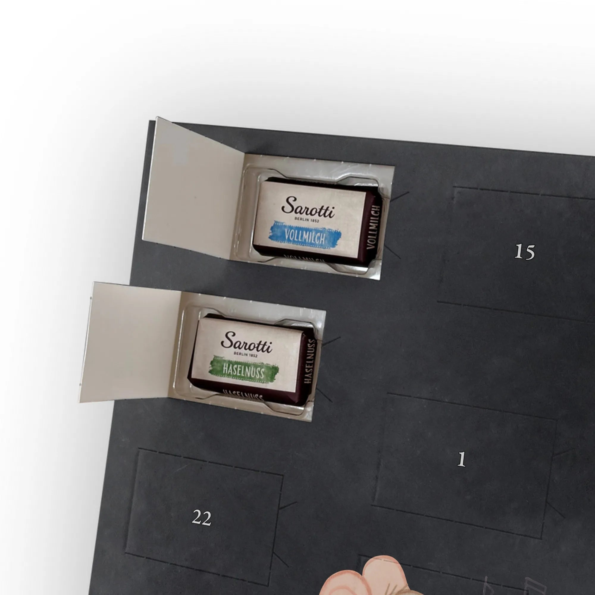 🐼 LECKERE FÜLLUNG: 24 Täfelchen, 107 g Markenschokolade (Sarotti® & Confiserie Heidel®) in vier Sorten.