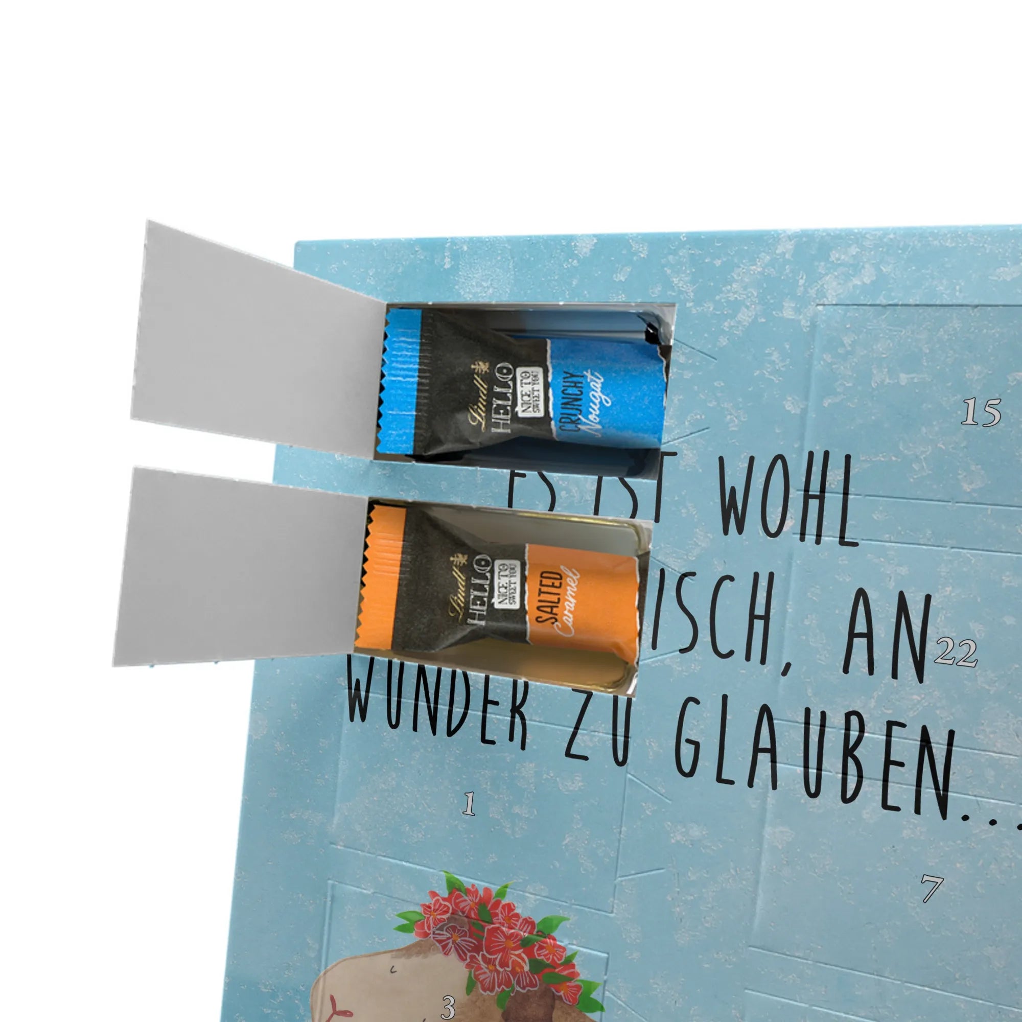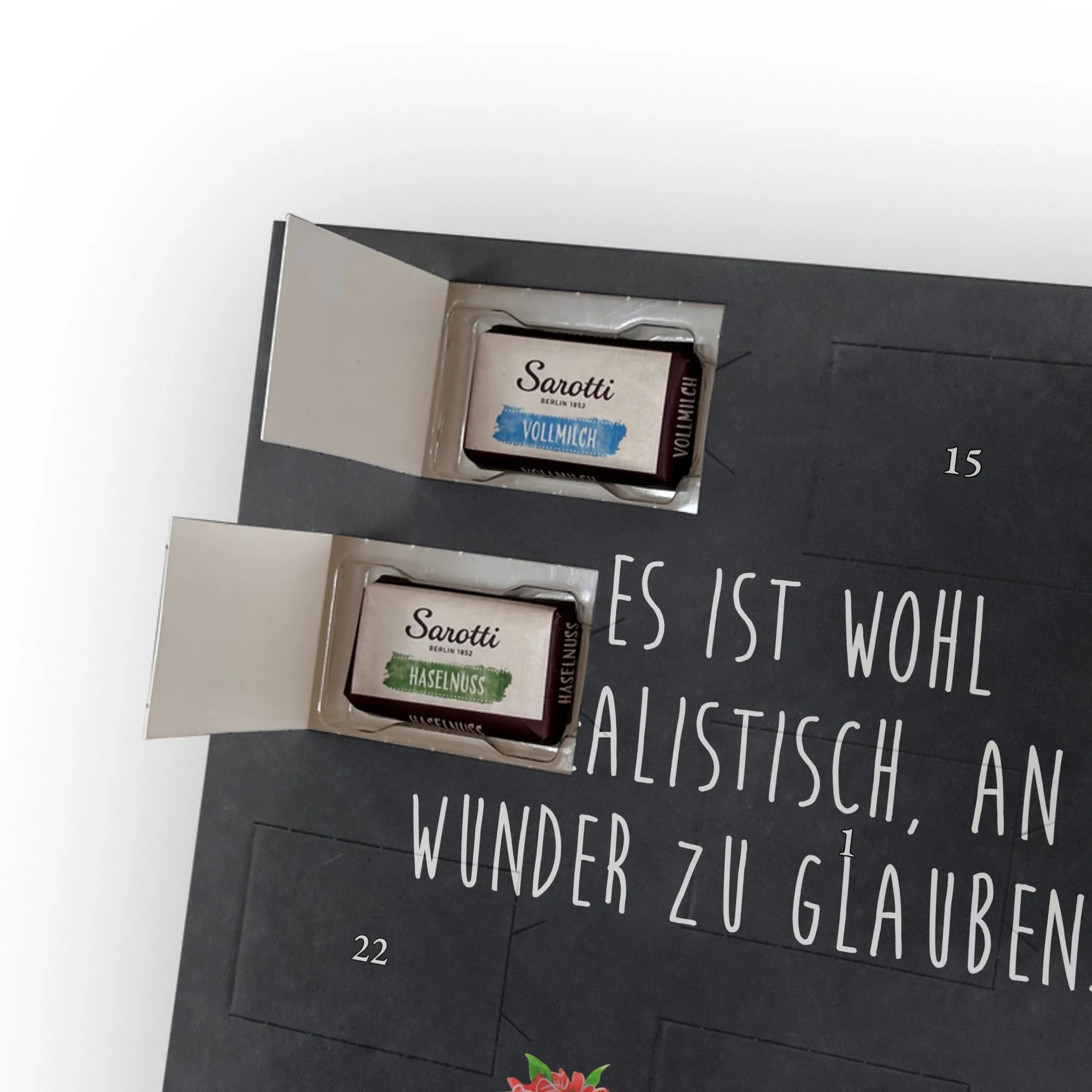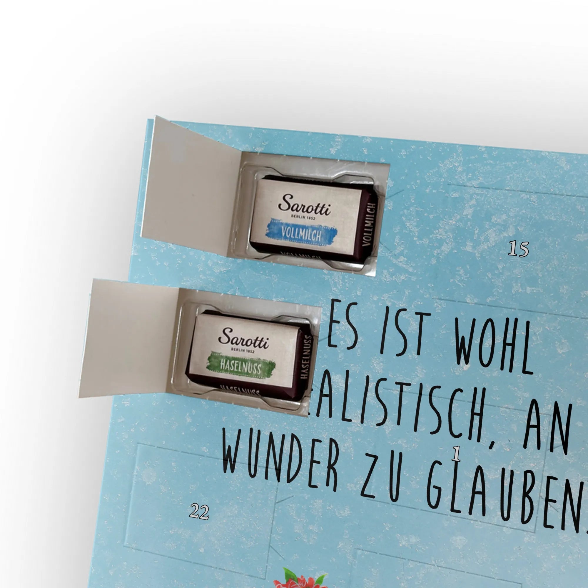 Unser Adventskalender verbindet süße Schokoladenmomente mit persönlicher Erinnerung und liebevollem Design. Das Motiv „Meerschweinchen weise“ aus der Small World-Kollektion zeigt ein nachdenkliches Meerschweinchen und den zauberhaften Spruch: „Es ist wohl realistisch, an Wunder zu glauben...“ – genau das richtige für alle, die Advent als Zeit der kleinen Wunder sehen.