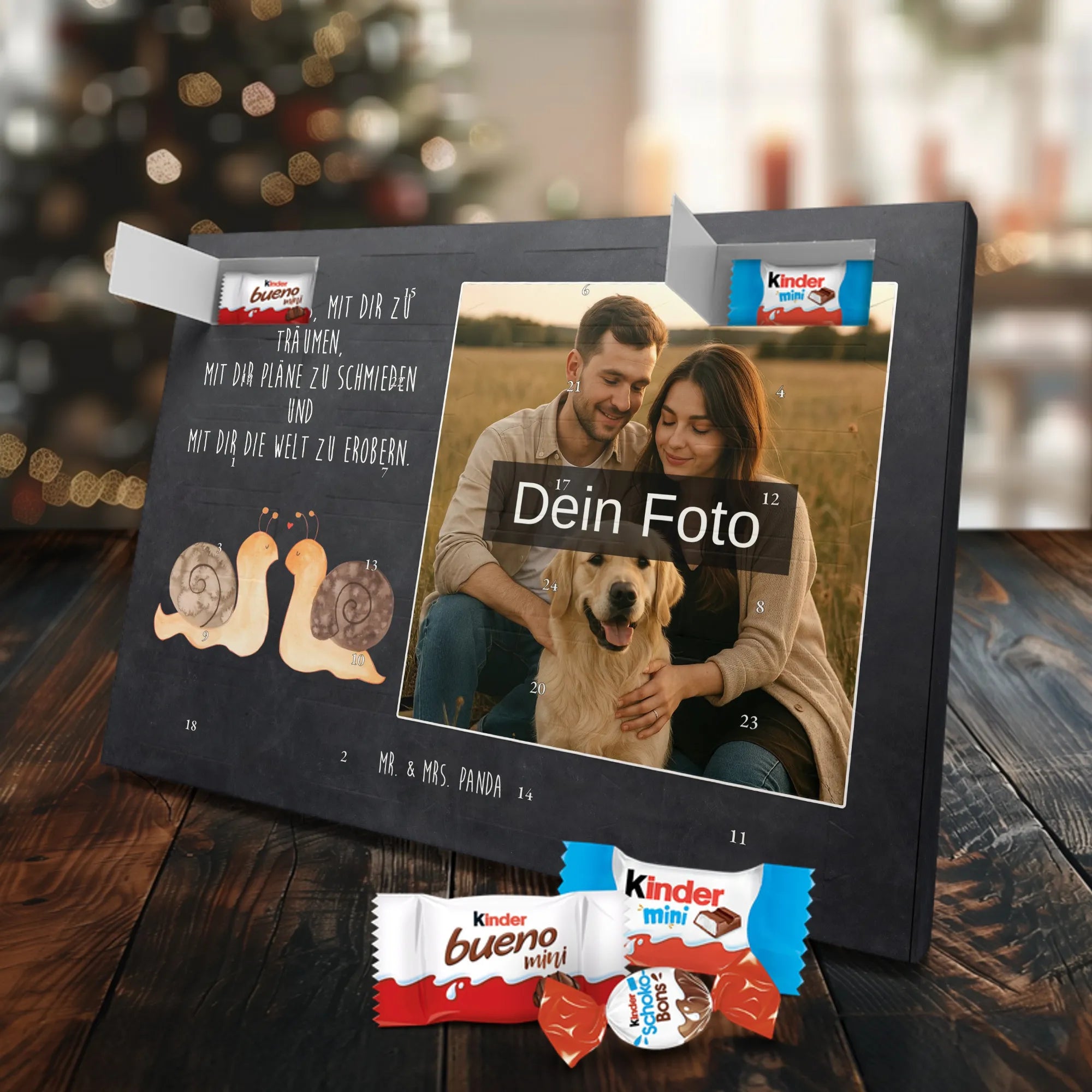 Personalisierter Schoko Foto Adventskalender von Mr. & Mrs. Panda – ein liebevoll gestaltetes Geschenk, das Vorfreude und Genuss vereint. In diesem personalisierten Schoko Foto Adventskalender kannst du dein Lieblingsfoto einsetzen und so jeden Tag im Dezember mit einem kleinen Lächeln öffnen. Der Kalender ist bedruckt mit unseren typischen Mr. & Mrs. Panda Motiven und süßen Sprüchen, die perfekt zu deinem Foto passen. Achte bitte bei der Bildauswahl auf hohe Auflösung, damit der Druck klar und brillant wird. Wähle einen passenden Bildausschnitt, damit keine wichtigen Details abgeschnitten werden. Lade nur Bilder hoch, bei denen du die Bildrechte besitzt oder die Zustimmung der abgebildeten Personen vorliegt. Die Fotos werden weder nachbearbeitet noch zugeschnitten; Rücknahme bei personalisierten Foto-Artikeln ist ausgeschlossen. Die Druckqualität ist brillant mit einer seidenmatten Oberflächenveredelung und bedruckten Seitenflächen für ein rundum schönes Erscheinungsbild. Maße: 355 mm x 245 mm x 11 mm. Praktisch: Du kannst den Adventskalender entweder aufstellen oder an die Wand hängen. Gefüllt ist der Kalender mit kinder® Schokolade – genauer: kinder® Schoko-Bons, kinder® Bueno mini und kinder® Schokolade mini. Bitte beachte: Um das beste Druckergebnis zu erzielen, lade ein hochwertiges Foto hoch und kontrolliere vor dem Bestellen den Bildausschnitt. Dieser Adventskalender ist das perfekte, persönliche Geschenk für Familie, Freunde oder für dich selbst – voller Liebe, süßer Überraschungen und dem unverwechselbaren Mr. & Mrs. Panda Charme.
