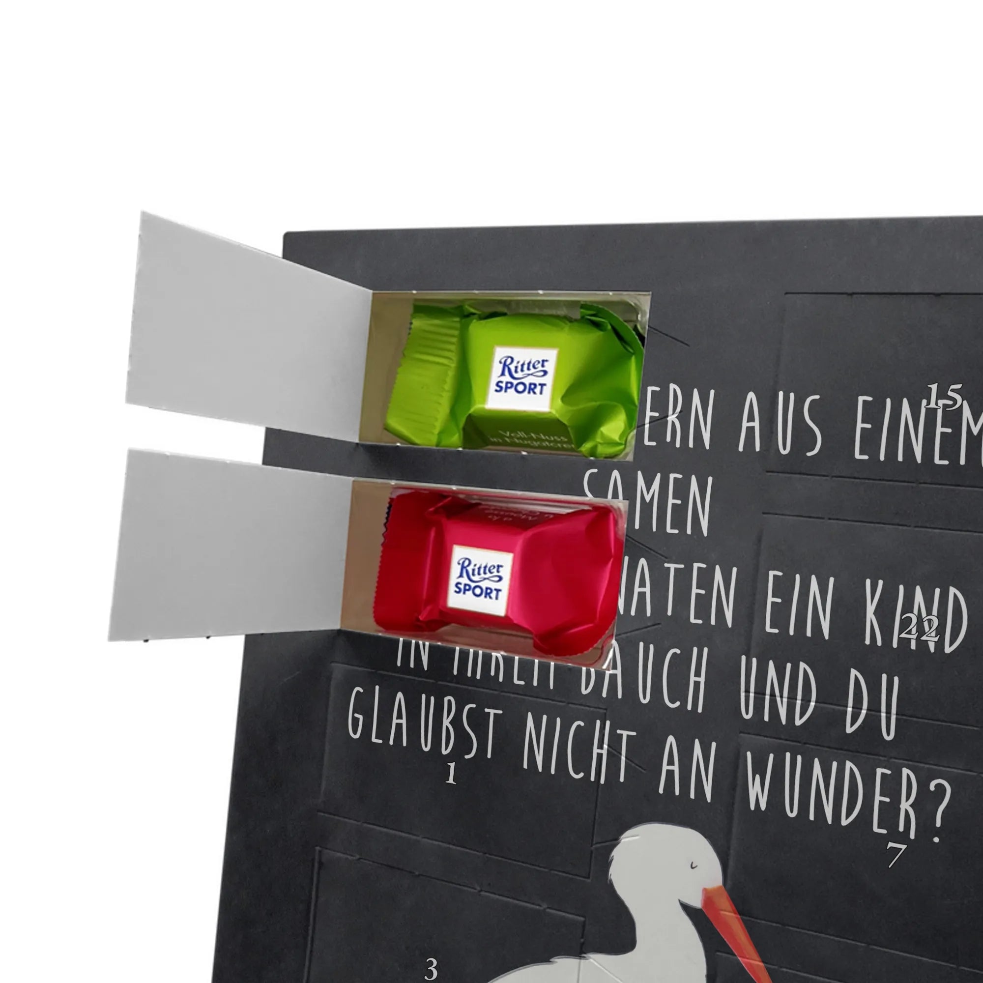 Schoko Foto Adventskalender personalisiert – ein fröhlicher Hingucker von Mr. & Mrs. Panda, der Adventszeit und Erinnerungen verbindet. Der Kalender ist bedruckt mit zauberhaften Motiven & Sprüchen von Mr. & Mrs. Panda und lässt sich ganz leicht mit einem Foto deiner Wahl personalisieren. Achtung Bildqualität: Für ein scharfes Druckbild solltest du ein Foto in hoher Auflösung verwenden. Kontrolliere den Bildausschnitt, damit wichtige Gesichter oder Details nicht verloren gehen. Verwende nur Fotos, für die du die Rechte besitzt oder die frei nutzbar sind. Bitte beachte: Die Fotos werden weder nachbearbeitet noch zugeschnitten und personalisierte Foto Artikel sind vom Umtausch ausgeschlossen. Die Verarbeitung überzeugt mit seidenmatter Oberflächenveredelung und bedruckten Seitenflächen für ein edles Finish. Maße: 325 mm x 225 mm x 27 mm. Besonderheit: Du kannst den Kalender aufhängen oder aufstellen – ganz flexibel. Gefüllt ist der Kalender mit Ritter Sport Schokowürfeln in leckeren Geschmacksrichtungen wie Mousse au Chocolat, Schoko Crisp, Voll-Nuss in Nougatcreme, Karamell Duo, Joghurt und Erdbeer-Joghurt. Ein liebevolles Geschenk, das jeden Tag im Advent versüßt.
