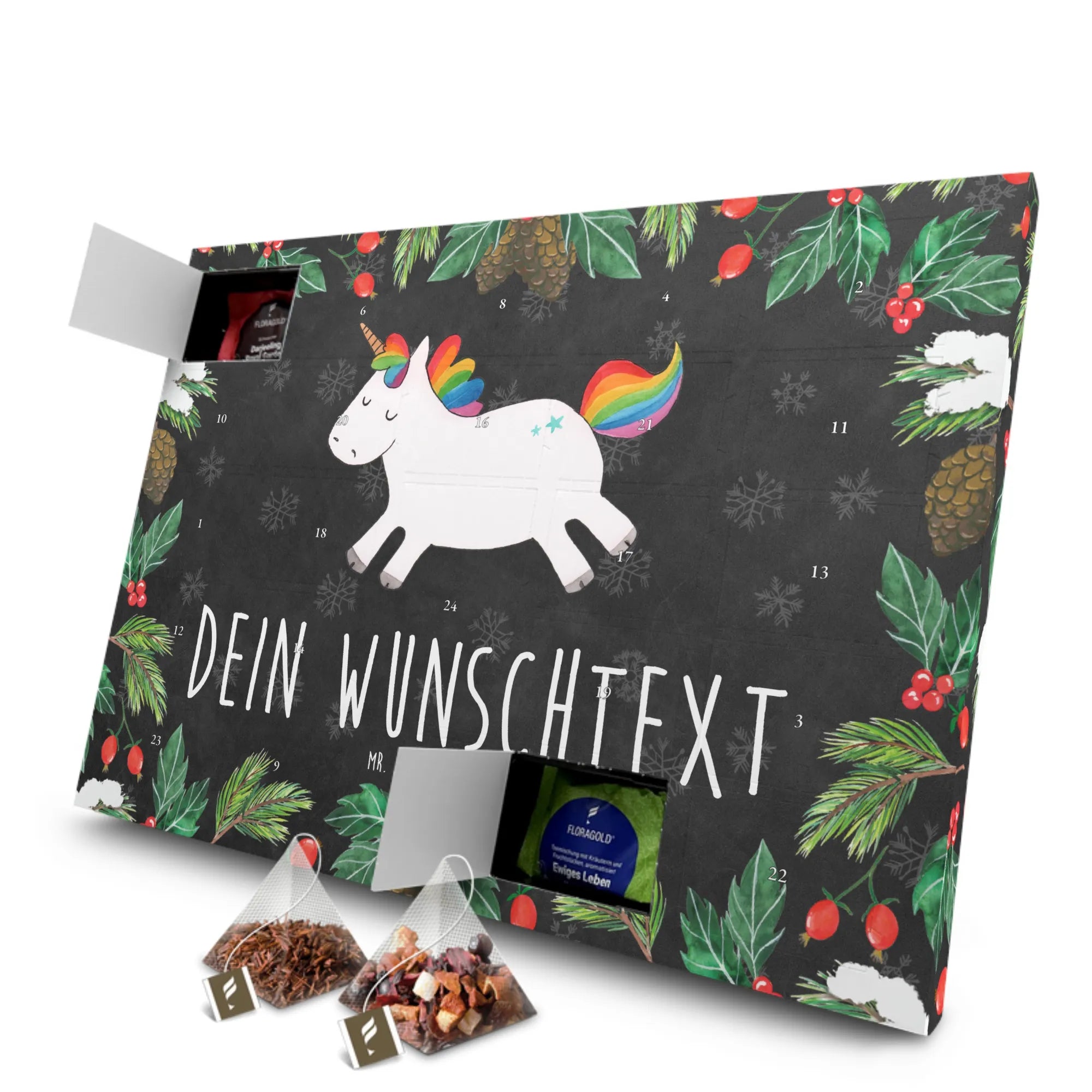 Der personalisierte Tee Adventskalender "Einhorn Happy" von Mr. & Mrs. Panda ist das perfekte Geschenk für alle, die fröhliche Momente lieben! Mit seinem zauberhaften Einhorn-Motiv bringt dieser Adventskalender Freude und Lebensfreude in die kalte Jahreszeit.