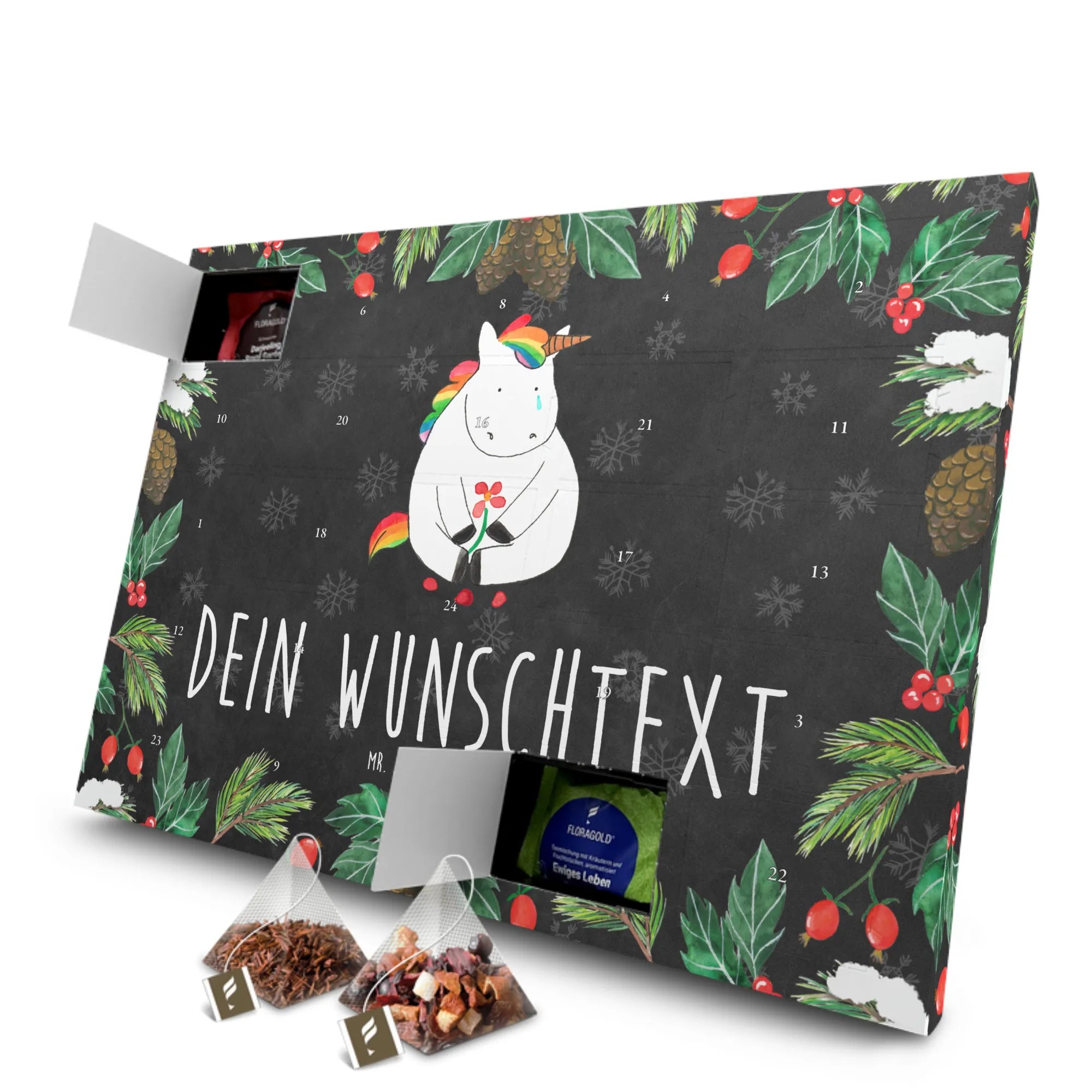 Der personalisierte Tee Adventskalender mit dem zauberhaften Motiv Einhorn Traurig ist das perfekte Geschenk für alle Einhorn-Liebhaber und Freunde, die eine besondere Aufmunterung benötigen. In Zeiten, in denen das Leben mal wieder nicht so rosig verläuft und traurig macht, kann ein kleiner Adventskalender mit Tee wahre Wunder wirken. Jedes Türchen birgt einen hochwertigen Tee in einem Pyramidenbeutel, so dass du täglich einen neuen, feinen Geschmack genießen kannst.