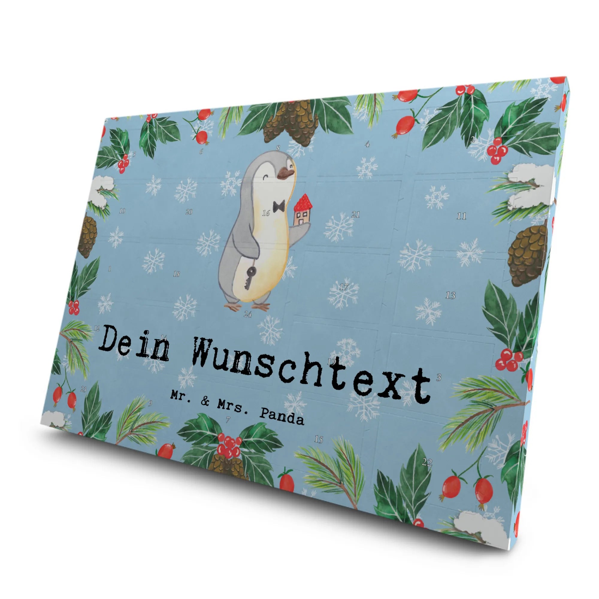 Der Kalender kann sowohl aufgehängt als auch aufgestellt werden und passt damit in jedes Büro oder jeden Wohnraum. Das süße Design mit dem Pinguin, der ein Haus und einen Schlüssel hält, symbolisiert nicht nur den Beruf des Immobilienmaklers, sondern sorgt auch für ein Lächeln in der hektischen Vorweihnachtszeit.