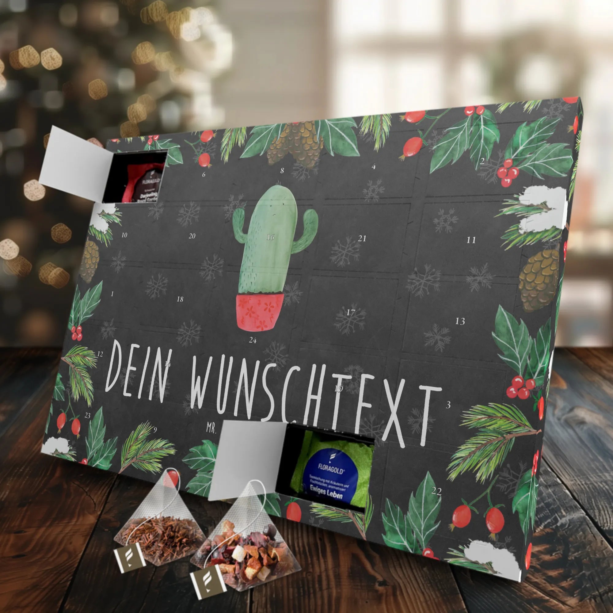 Der personalisierte Tee Adventskalender von Mr. & Mrs. Panda ist das perfekte Geschenk für alle, die im Büro oder in der Schule den Alltag mit einer Prise Spaß und Kreativität auflockern möchten. Besonders die liebevoll gestaltete Kaktus-Motivreihe bringt nicht nur gute Laune, sondern sorgt auch dafür, dass man sich inmitten von Stress und Hektik lächeln kann.