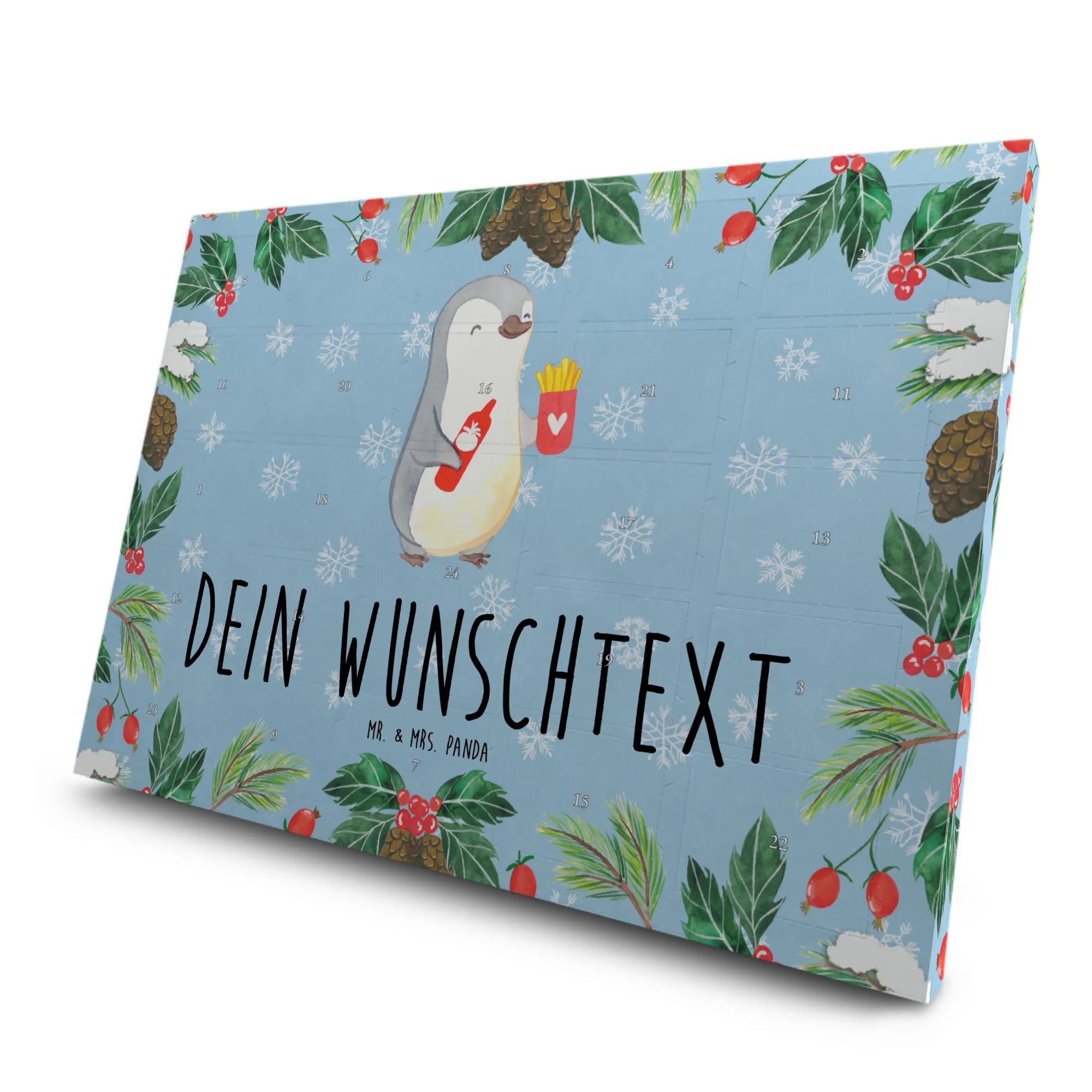 Der entzückende Pinguin, der Pommes Frites und eine Flasche Ketchup im Flügel hält, strahlt pure Freude aus und passt hervorragend zu jedem Liebesgeschenk. Die persönliche Note macht den Kalender zu einem einzigartigen Mitbringsel für die Freundin, den Partner oder Ehemann. Denn unter dem Motto "Mit dir würde ich sogar meine Pommes teilen" zeigt dieser Adventskalender, wie viel dir deine Liebsten bedeuten.