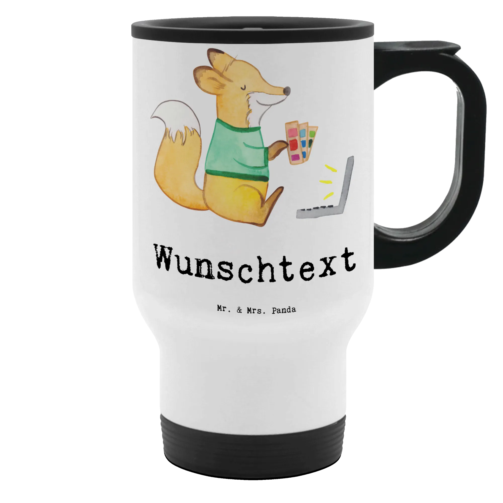 Entdecke unseren personalisierten Thermobecher "Mediengestalter mit Herz"! Dieser besonders liebevoll gestaltete Becher ist perfekt für alle kreativen Köpfe, die sich dem Design und der Mediengestaltung verschrieben haben. Mit einem fröhlichen Motiv eines süßen Fuchses, der vor einem Laptop sitzt und einen Farbfächer hält, bringt er Freude in den Alltag. Mit dem Motto "Du bist nur ein halber Mensch, wenn du kein Mediengestalter bist." drückt dieser Thermobecher nicht nur Kreativität, sondern auch ein Stück Identität aus!