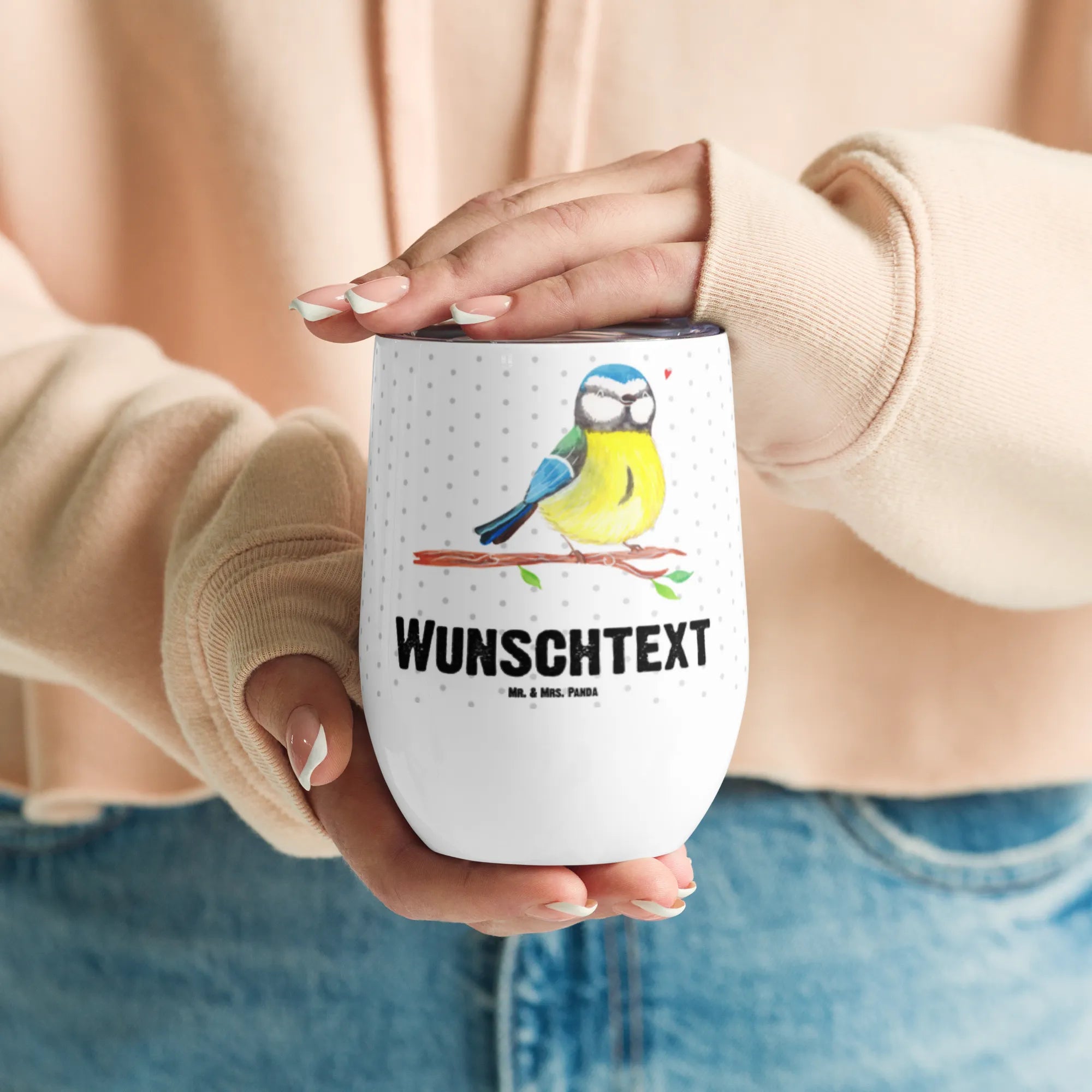 Mit der schönen Blaumeise, die auf einem Ast sitzt und symbolisch für den Frühling steht, versprüht der Weinbecher echte Frühlingsgefühle! Ob beim gemütlichen Zusammensitzen mit Freunden im Garten oder beim Piccolo am Strand, der personalisierte Glühweinbecher ist der ideale Begleiter für jeden Anlass.