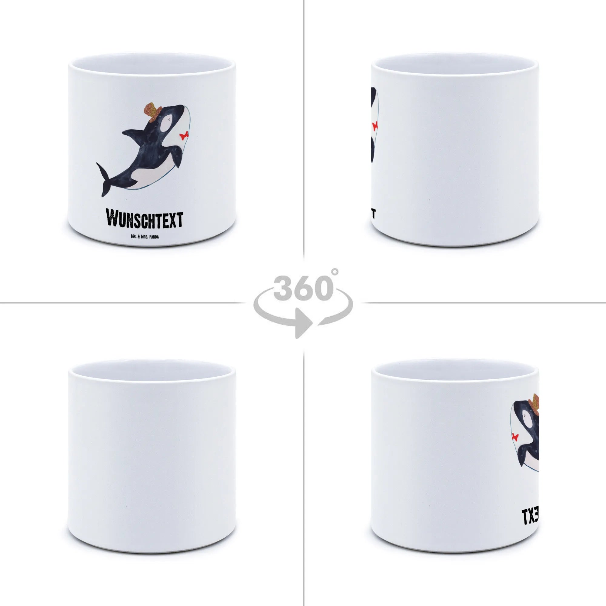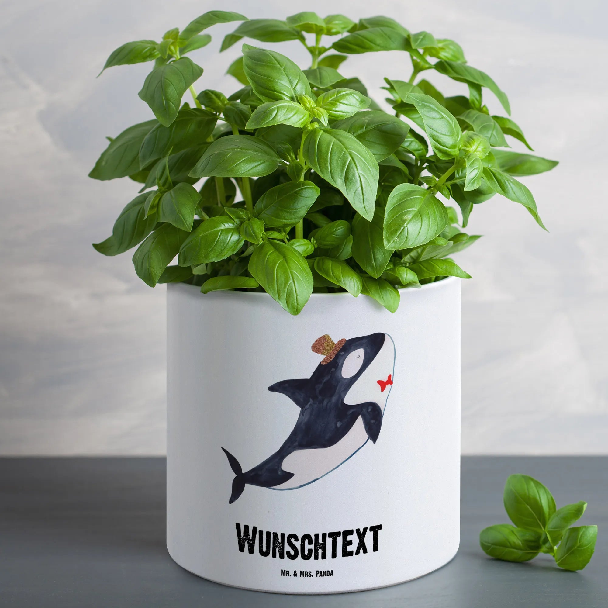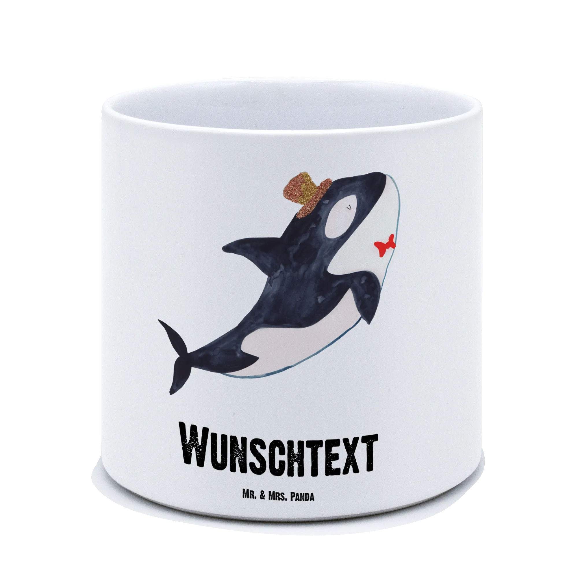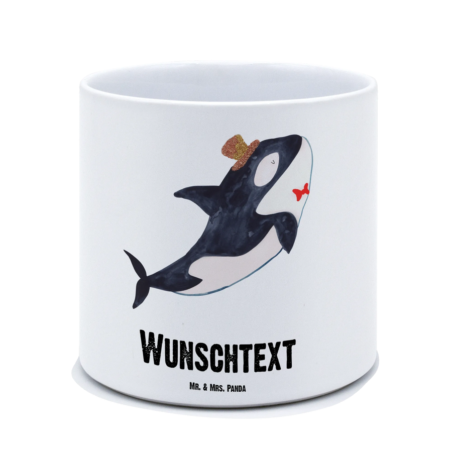 Der personalisierte XL Blumentopf mit dem romantischen Orca-Zylinder aus der Meerestiere-Kollektion ist das ideale Geschenk für alle, die das Meer und seine Bewohner lieben! Mit einer Größe von 135 mm x 142 mm und einem Durchmesser von 142 mm bietet dieser schöne Keramiktopf nicht nur Platz für Deine liebsten Pflanzen, sondern bringt auch einen Hauch von maritimer Eleganz in jedes Zuhause. Der Orca, mit seinem charmanten, schwarzen Rücken und dem weißen Bauch, trägt einen stilvollen Zylinder, der mit einer liebevollen Blumenverzierung geschmückt ist. Dieser Topf ist perfektes Wohnaccessoire für alle, die Meeresbewohner und die fröhliche Atmosphäre des Ozeans schätzen.