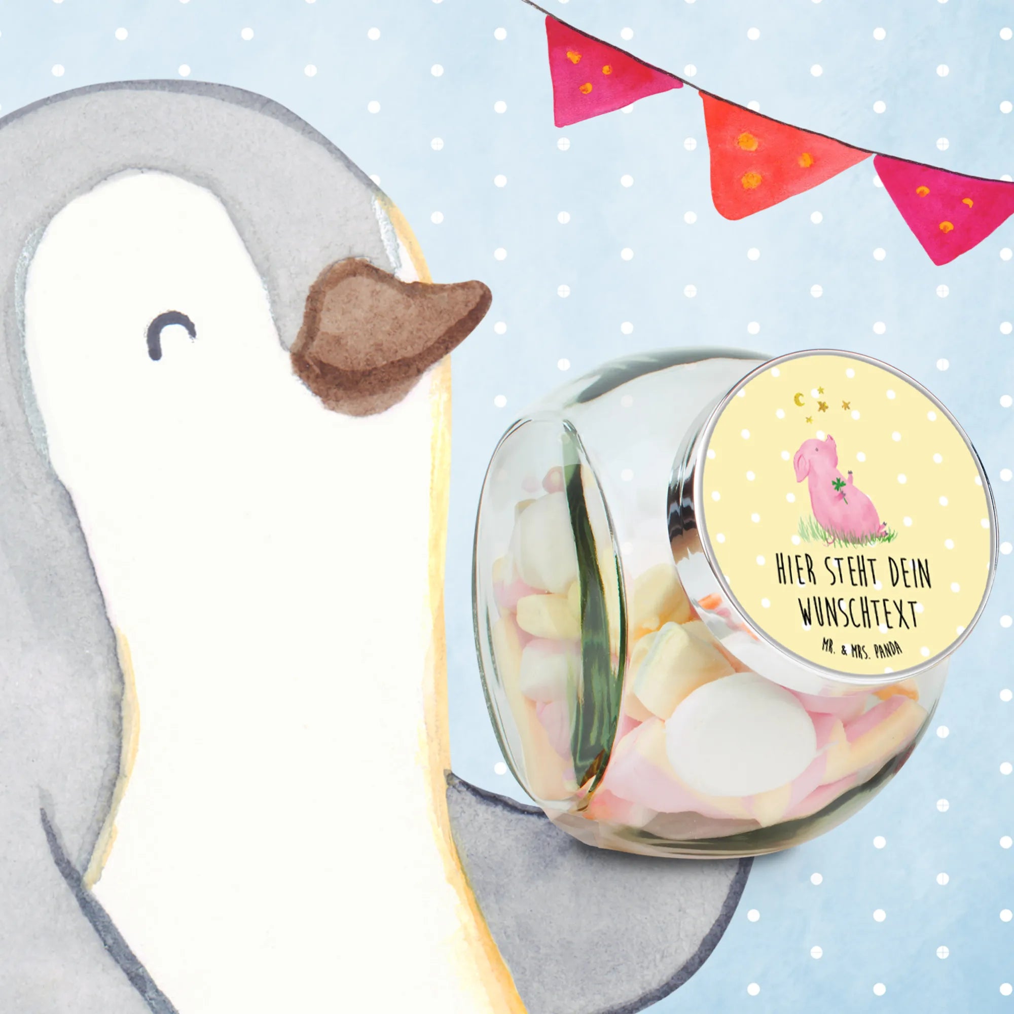Stell dir vor, du kommst nach einem langen, anstrengenden Tag nach Hause und das Erste, was dir in deiner Küche oder im Wohnzimmer entgegenstrahlt, ist ein kleines, fröhliches Glücksschwein mit einem Kleeblatt in der Hand. Genau dieses Gefühl von Wärme und Optimismus vermittelt unser personalisiertes Bonbonglas von Mr. & Mrs. Panda. 🐷🍀