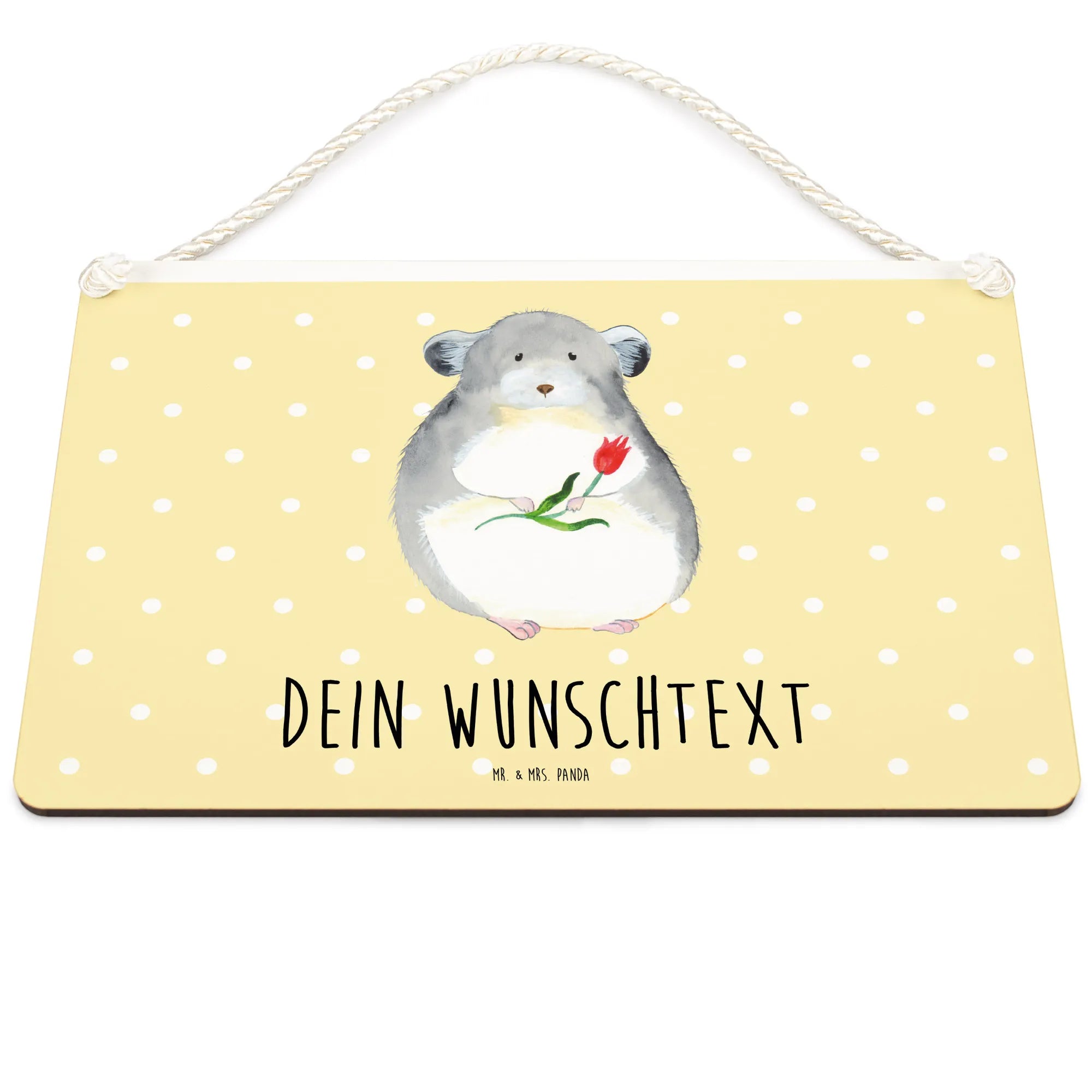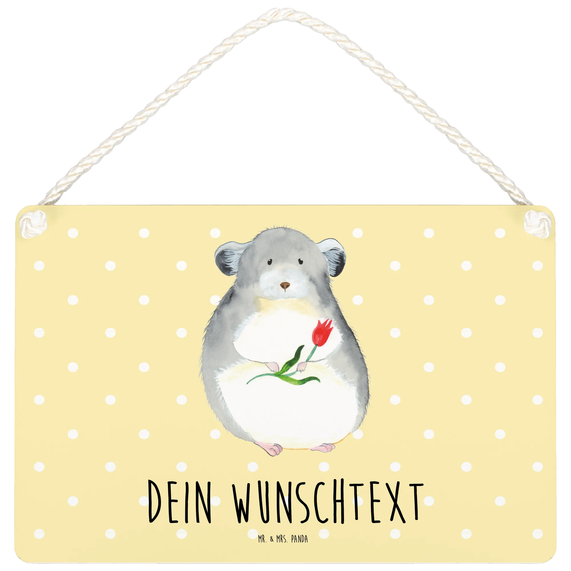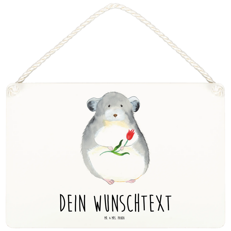 Das personalisierte Deko Schild "Chinchilla mit Blume" aus der Small World Kollektion von Mr. & Mrs. Panda ist der perfekte Glücksbringer für dein Zuhause! Es bringt nicht nur Farbe in dein Leben, sondern auch ein süßes Lächeln auf dein Gesicht. Mit hochwertigem Druck und einem liebevollen Design ist dieses Schild ideal als Wanddeko oder Türschild geeignet.