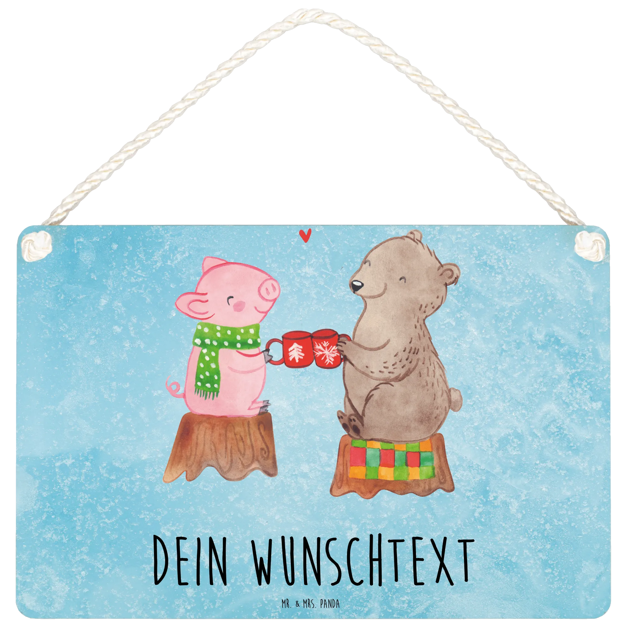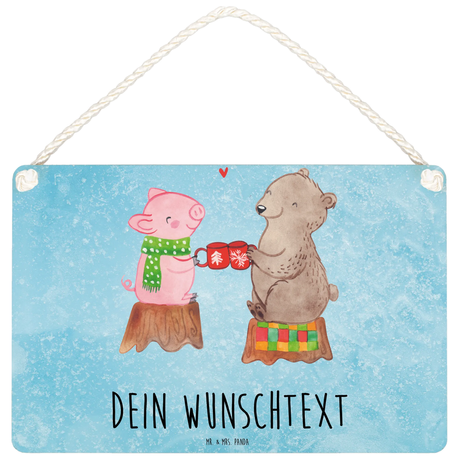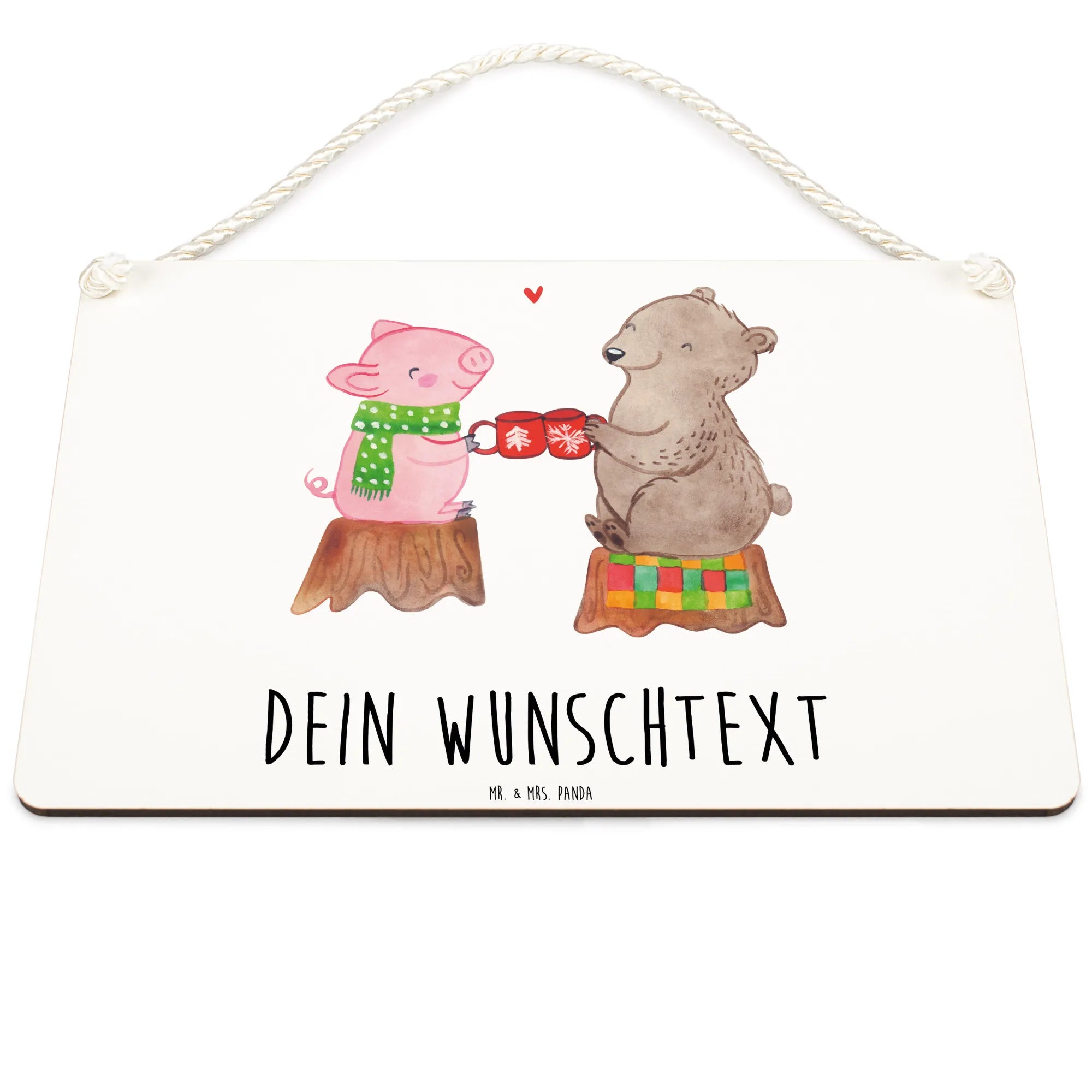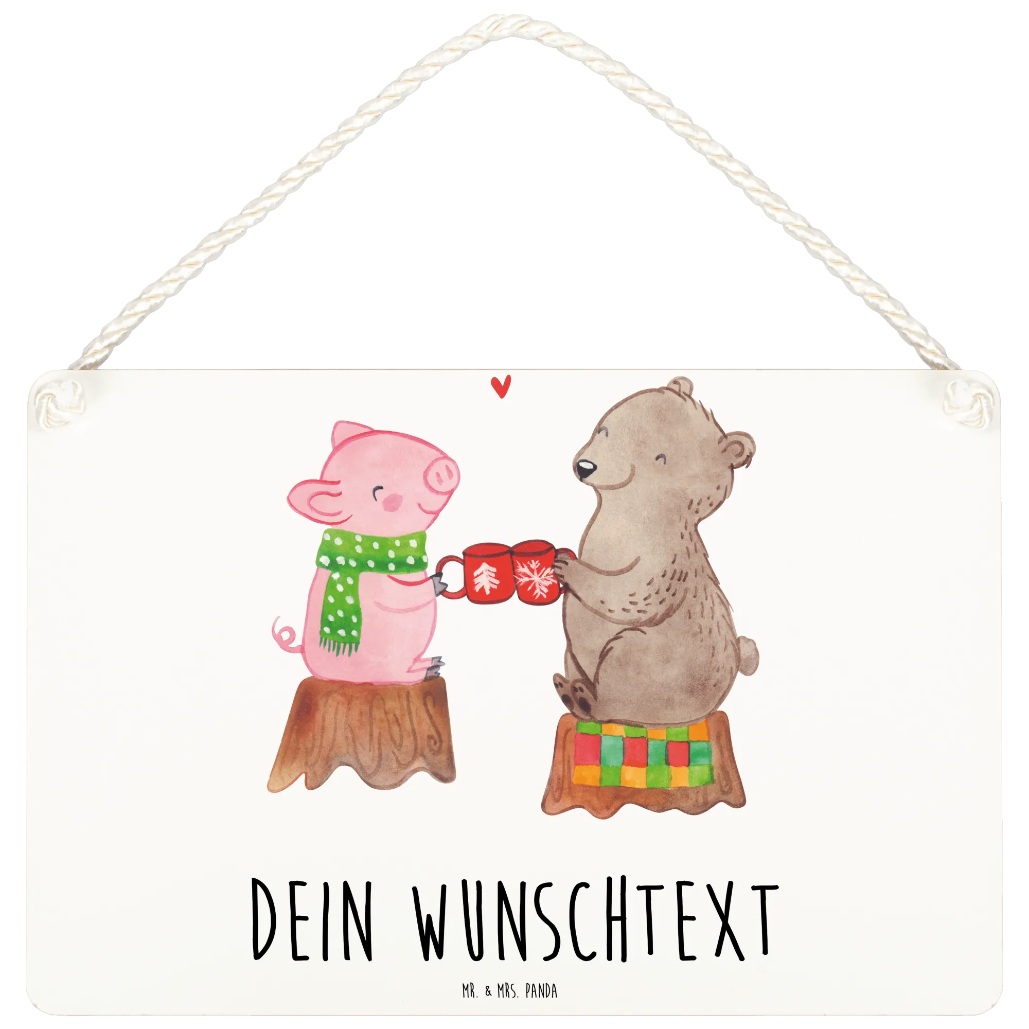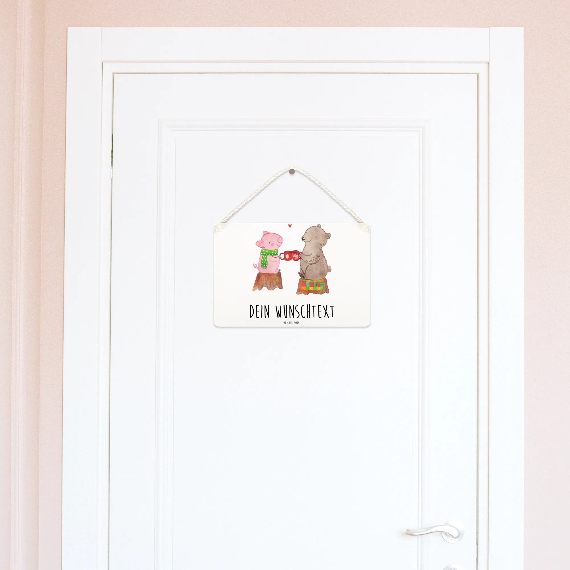 Das Schild zeigt ein niedliches Schweinchen mit einem Schal und einen fröhlichen Bären, die auf einem Baumstumpf sitzen und mit einer Tasse anstoßen. Durch das kleine Herzchen, das die beiden verbindet, wird die Botschaft, dass es um Freude und Liebe geht, perfekt unterstrichen.