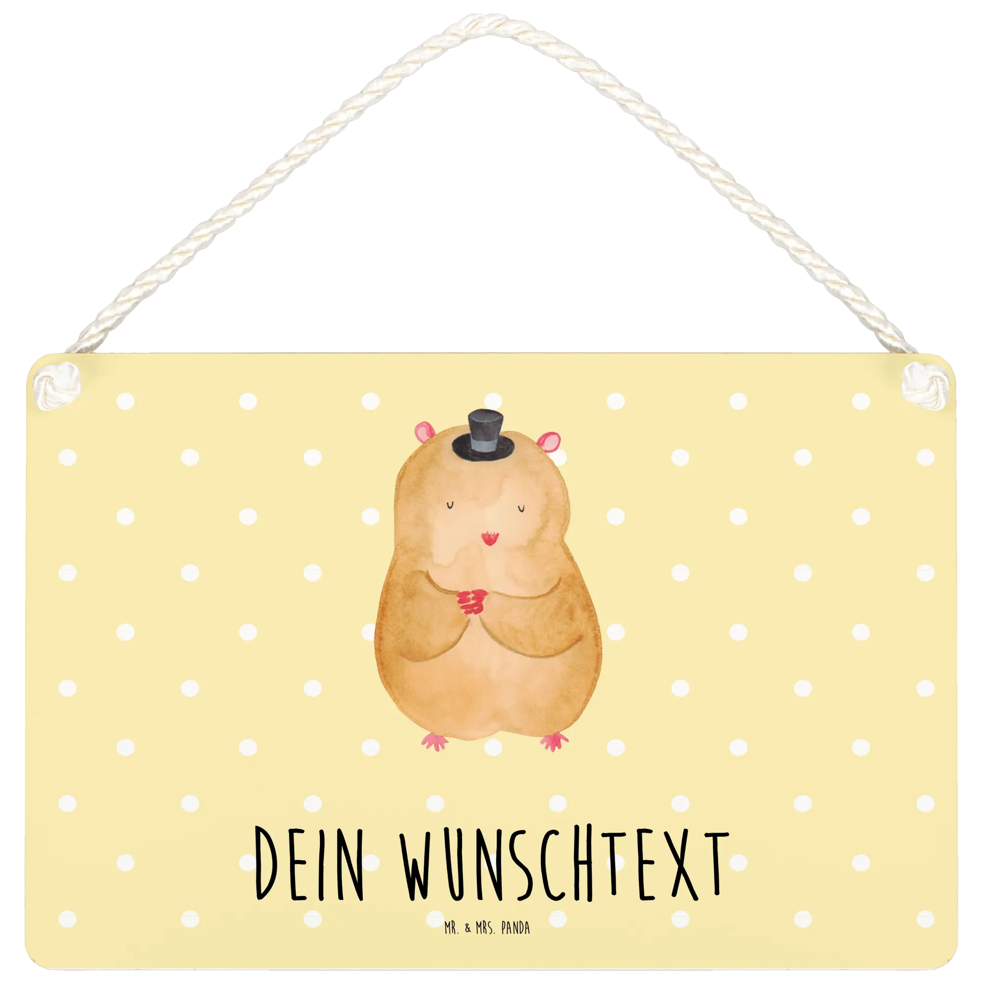 Das personalisierte Deko Schild 'Hamster mit Hut' von Mr. & Mrs. Panda ist das perfekte Geschenk für Tierliebhaber und als lustige Wanddeko geeignet! Mit einem witzigen Spruch und dem süßen Motiv eines kleinen Hamsters, der einen Zylinder trägt, sorgt es garantiert für gute Laune in jedem Zuhause.