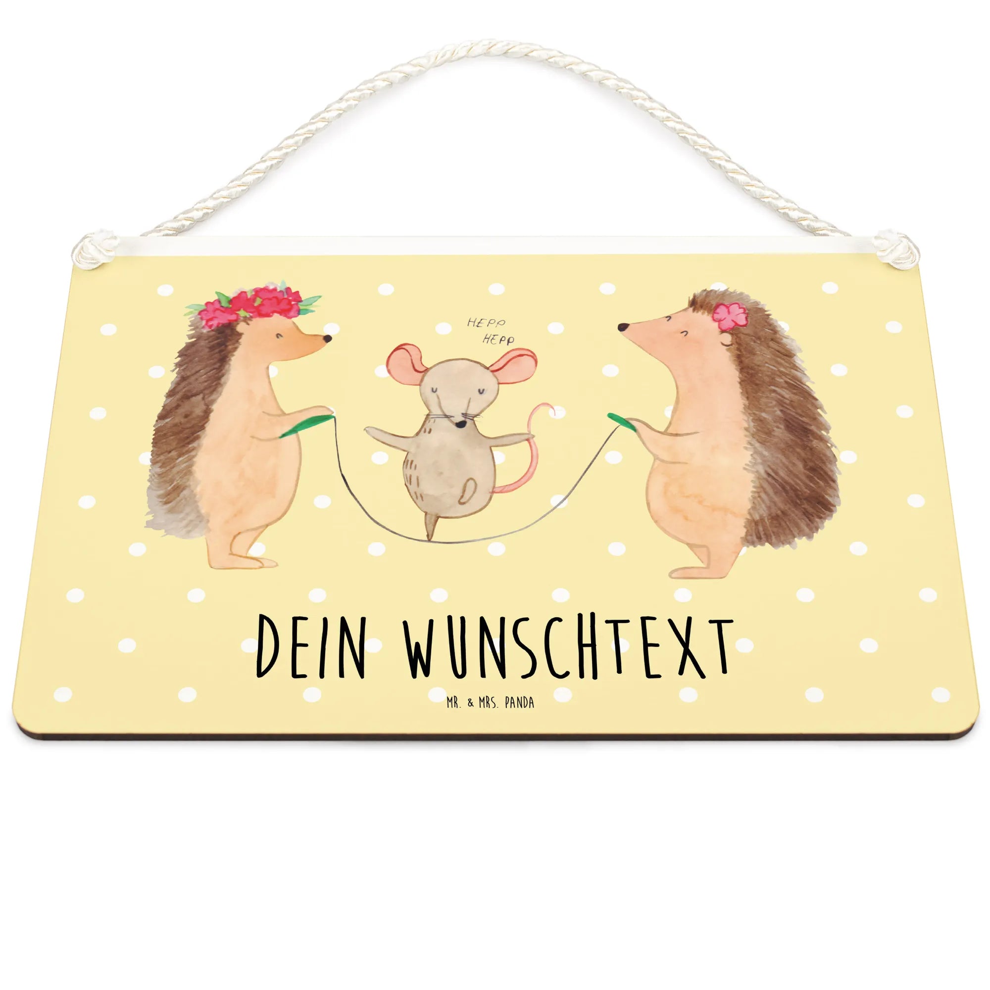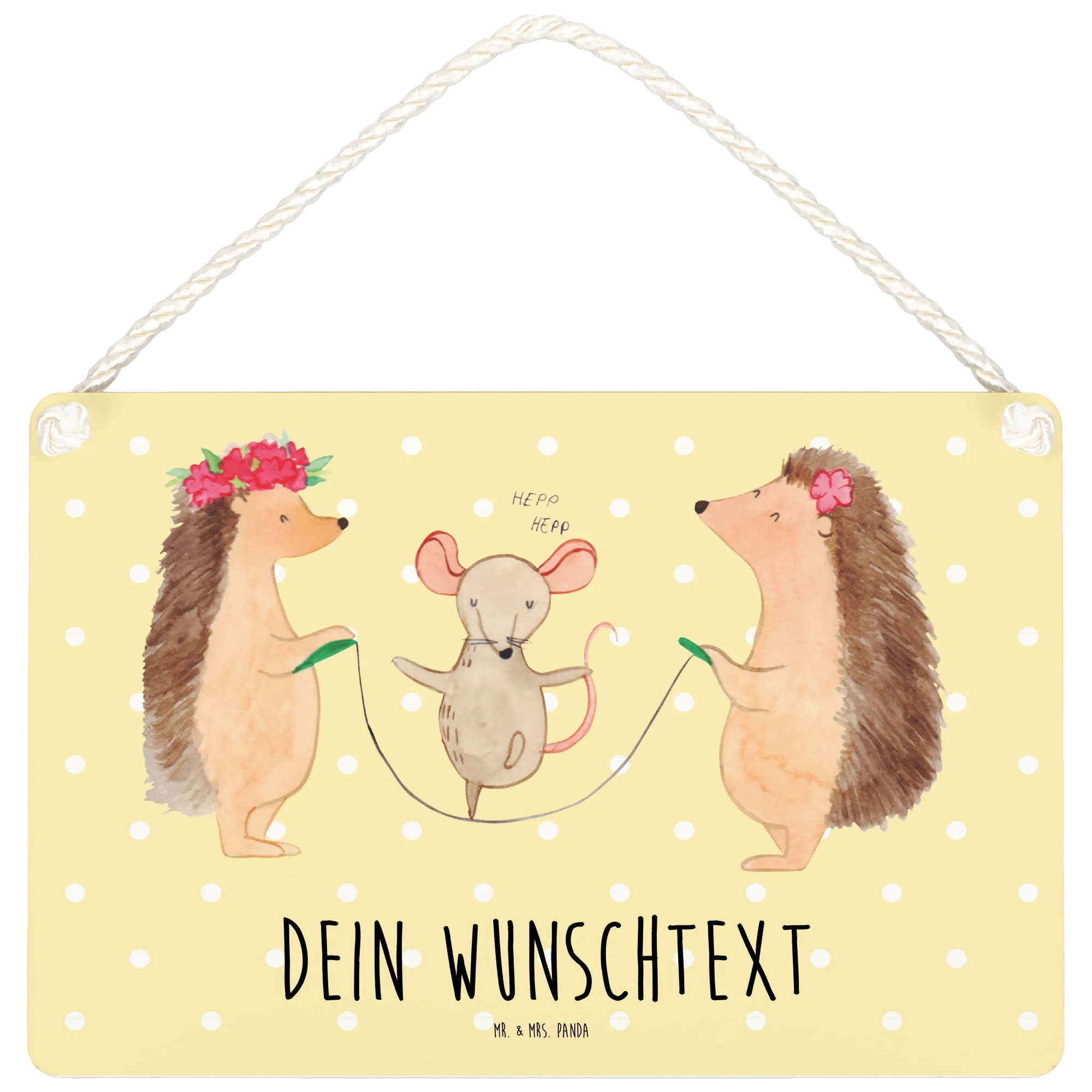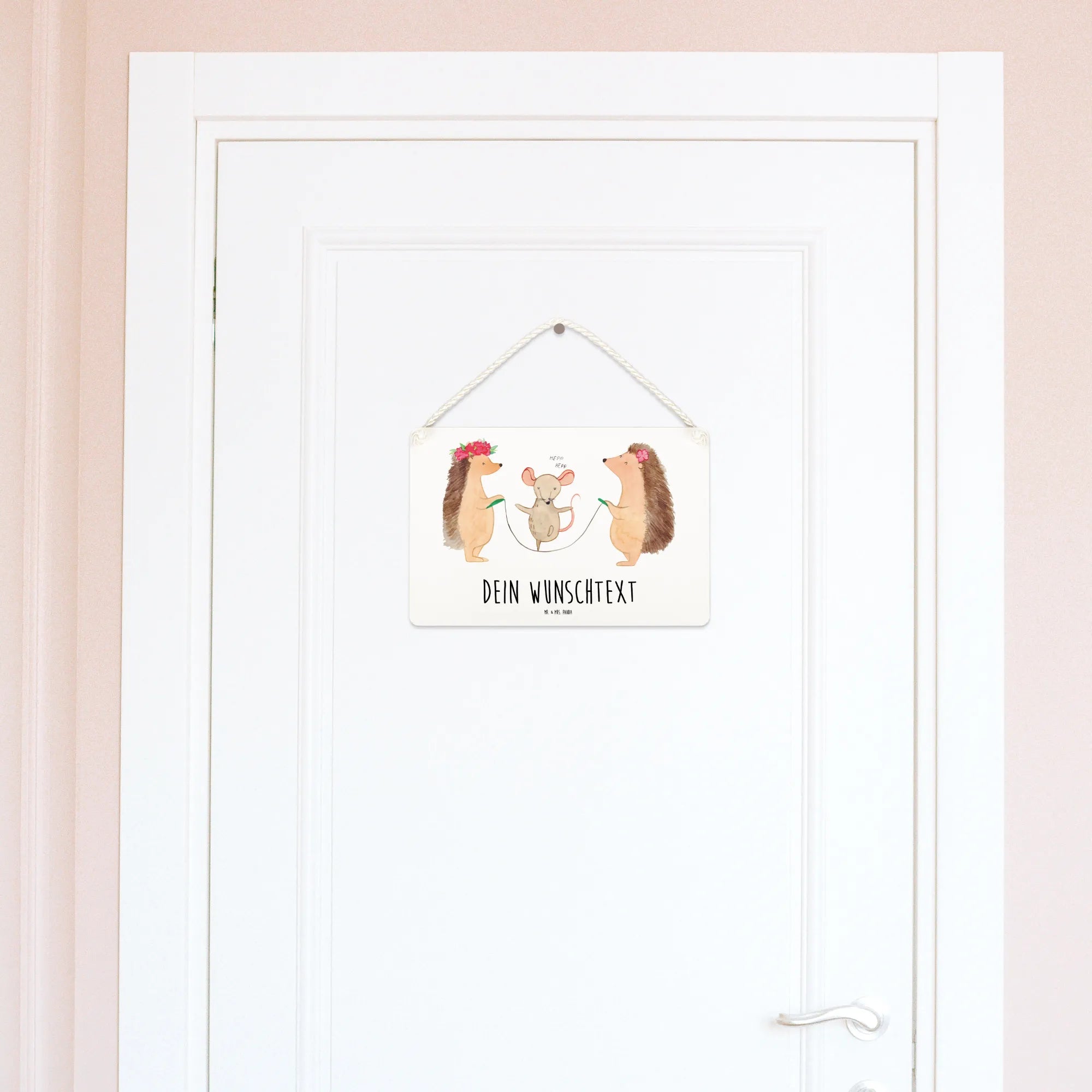 Ein wunderschönes und edles personalisiertes Deko Schild von Mr. & Mrs. Panda, das mit dem niedlichen Motiv des igeligen Seilhüpfens begeistert. Ideal für jeden Anlass, ob zum Geburtstag, zur Einschulung oder einfach als liebevolles Geschenk für beste Freunde.