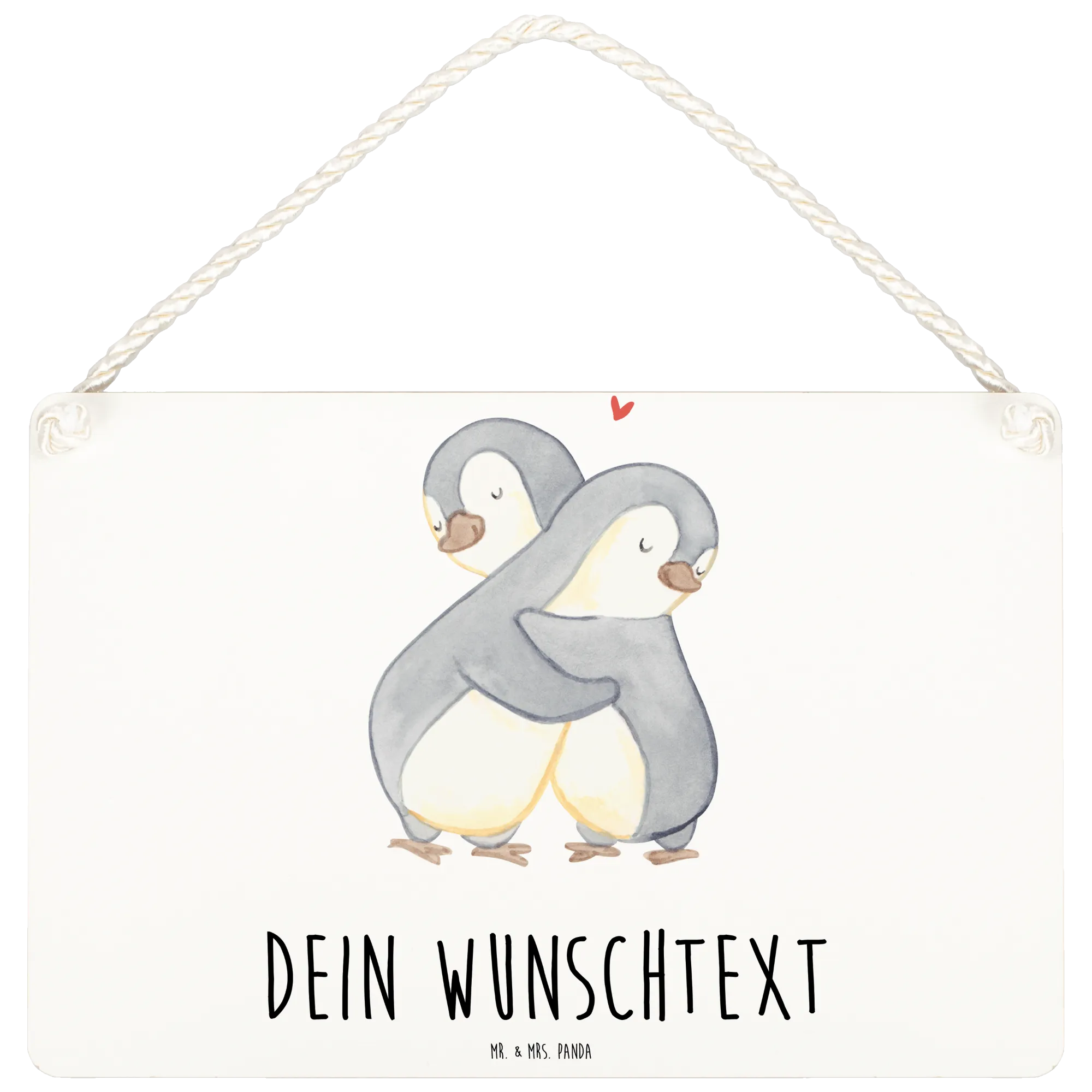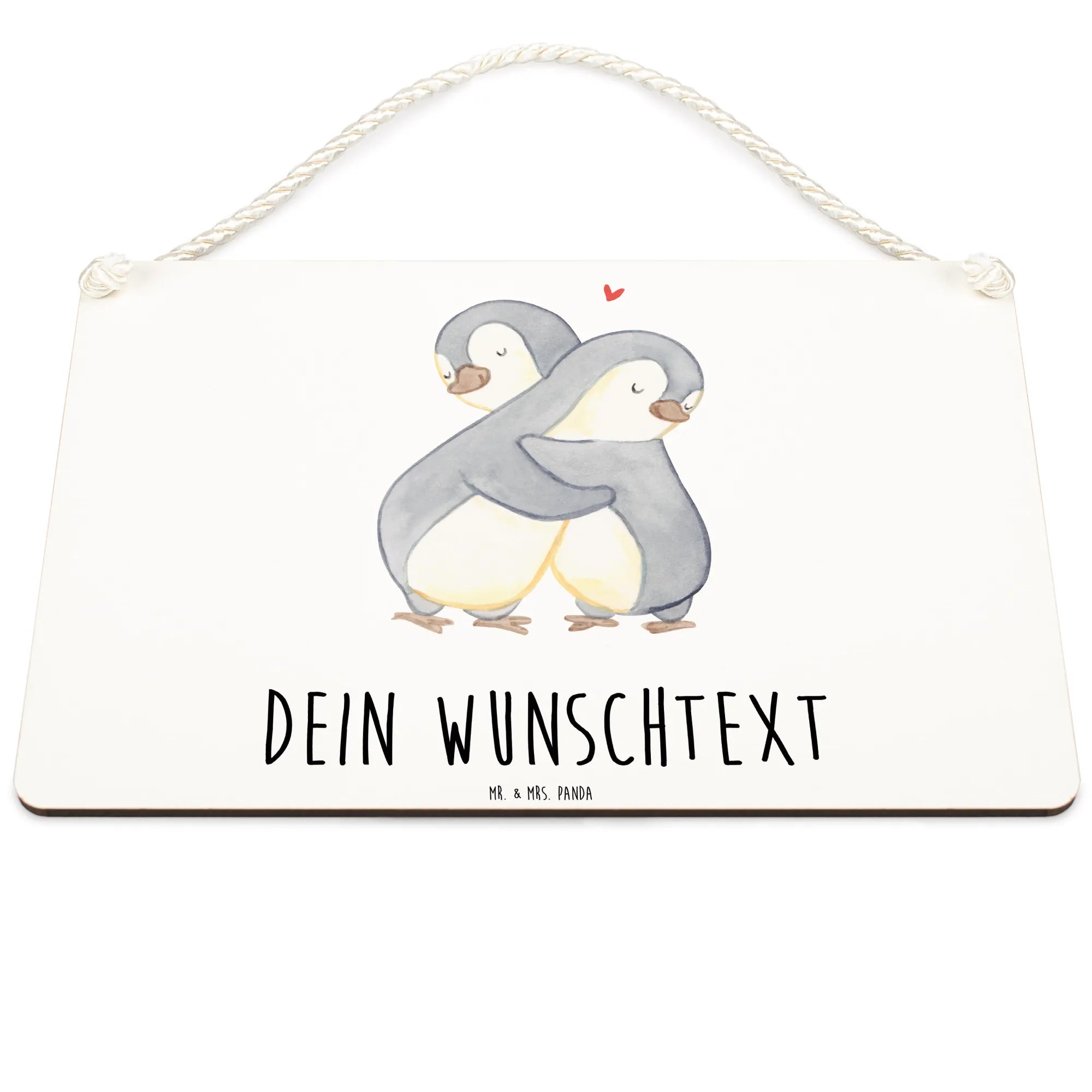 Das personalisierte Deko Schild "Pinguine Kuscheln" von Mr. & Mrs. Panda ist das perfekte Geschenk für alle, die die Liebe feiern möchten. Dieses einzigartige Wand- oder Türschild zeigt zwei niedliche Pinguine, die sich innig umarmen. Die sanften Grau- und Beigetöne sowie der kleine rote Herzakzent machen dieses Schild zu einem Blickfang in jedem Zuhause.