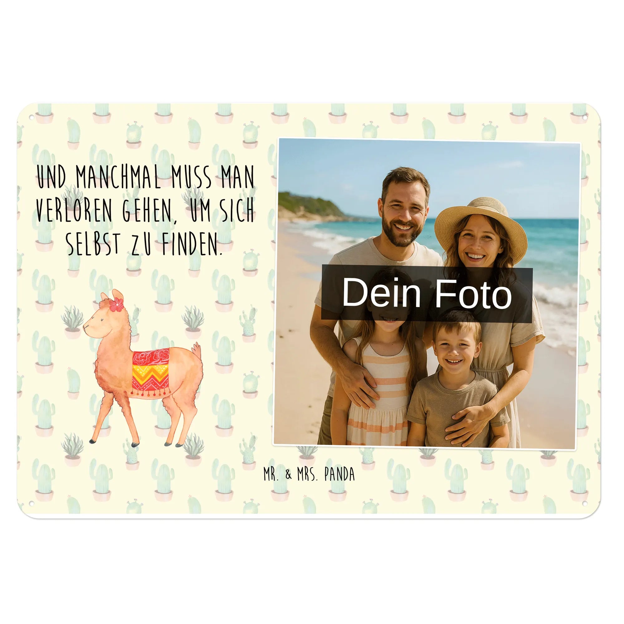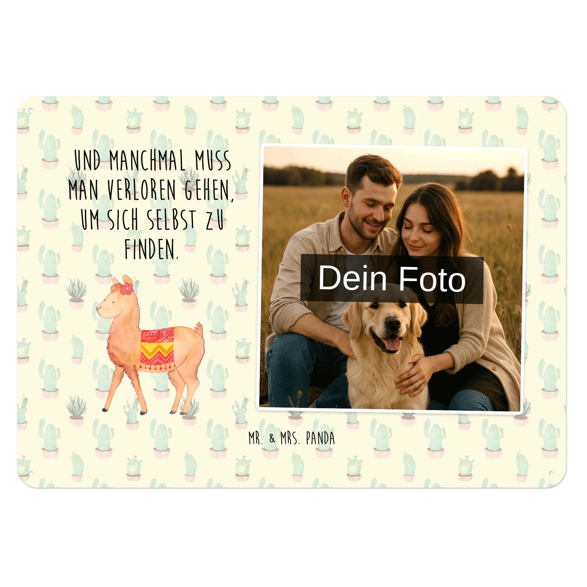 Suchst Du ein Geschenk, das persönlich, verspielt und gleichzeitig stilvoll ist? Unser personalisiertes Foto-Blechschild aus der Alpaka-Kollektion von Mr. & Mrs. Panda vereint ein handgezeichnetes Alpaka-Motiv mit Deinem Wunschfoto und dem liebevollen Spruch „Und manchmal muss man verloren gehen, um sich selbst zu finden.“ Ein echtes Highlight als Türschild mit Bild, Metallschild mit Wunschfoto oder als Dekoschild für Wohnzimmer und Küche.
