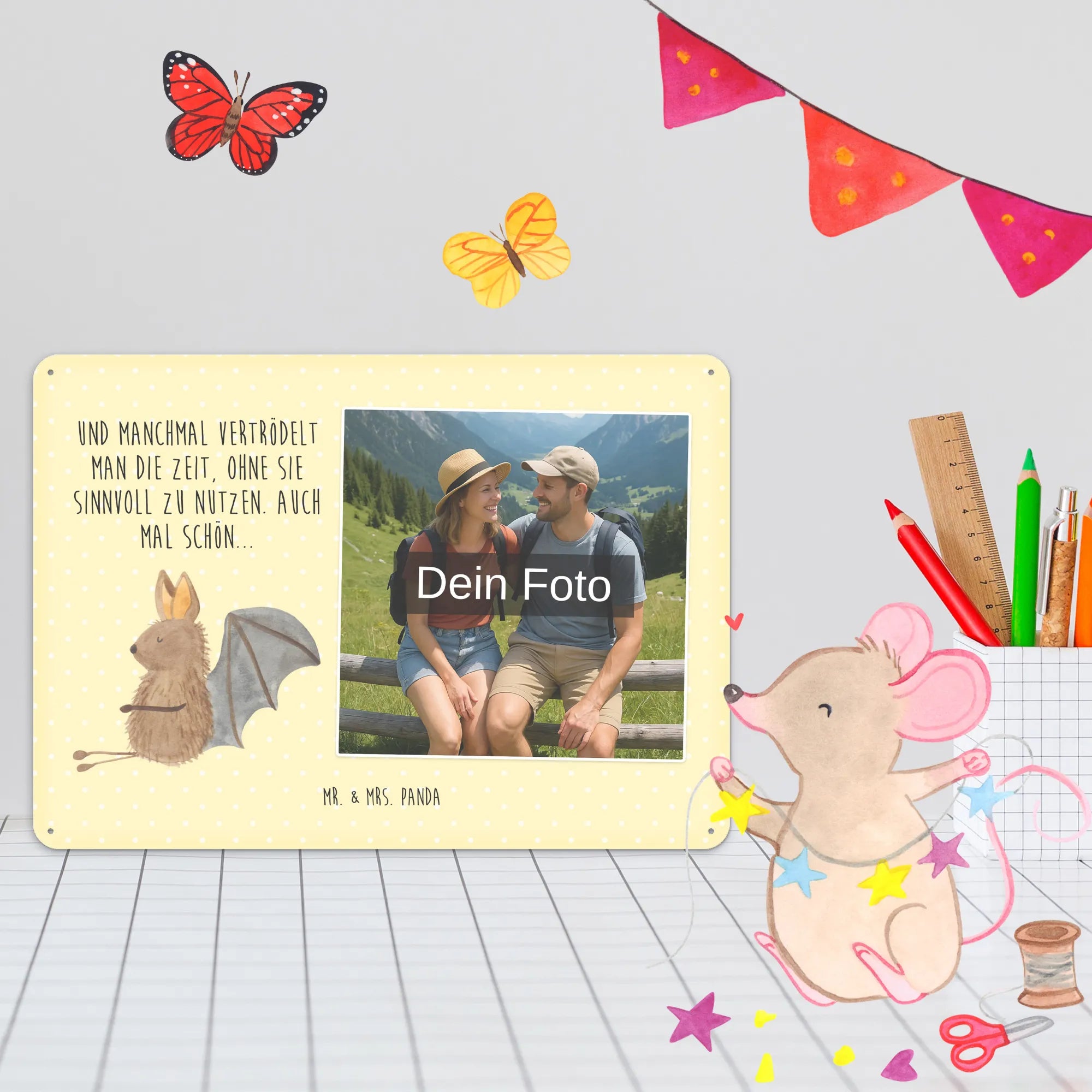 Gestalte dein persönliches Blechschild: Lade dein Foto hoch und kreiere ein einzigartiges Geschenk mit Mr. & Mrs. Panda – schnell gefertigt, liebevoll verpackt.