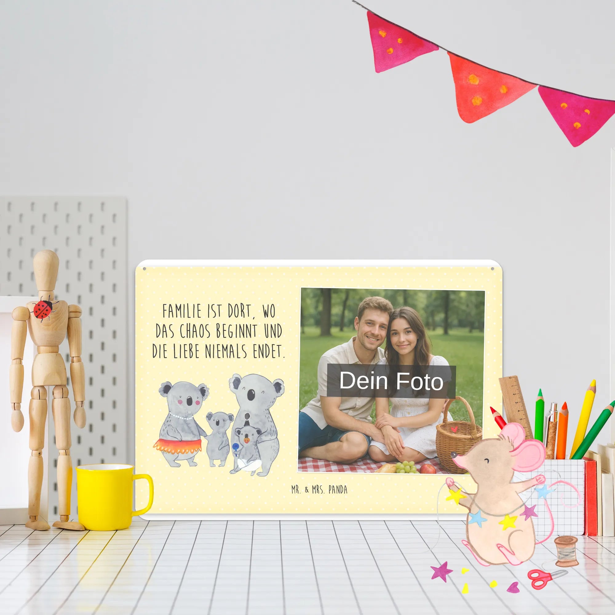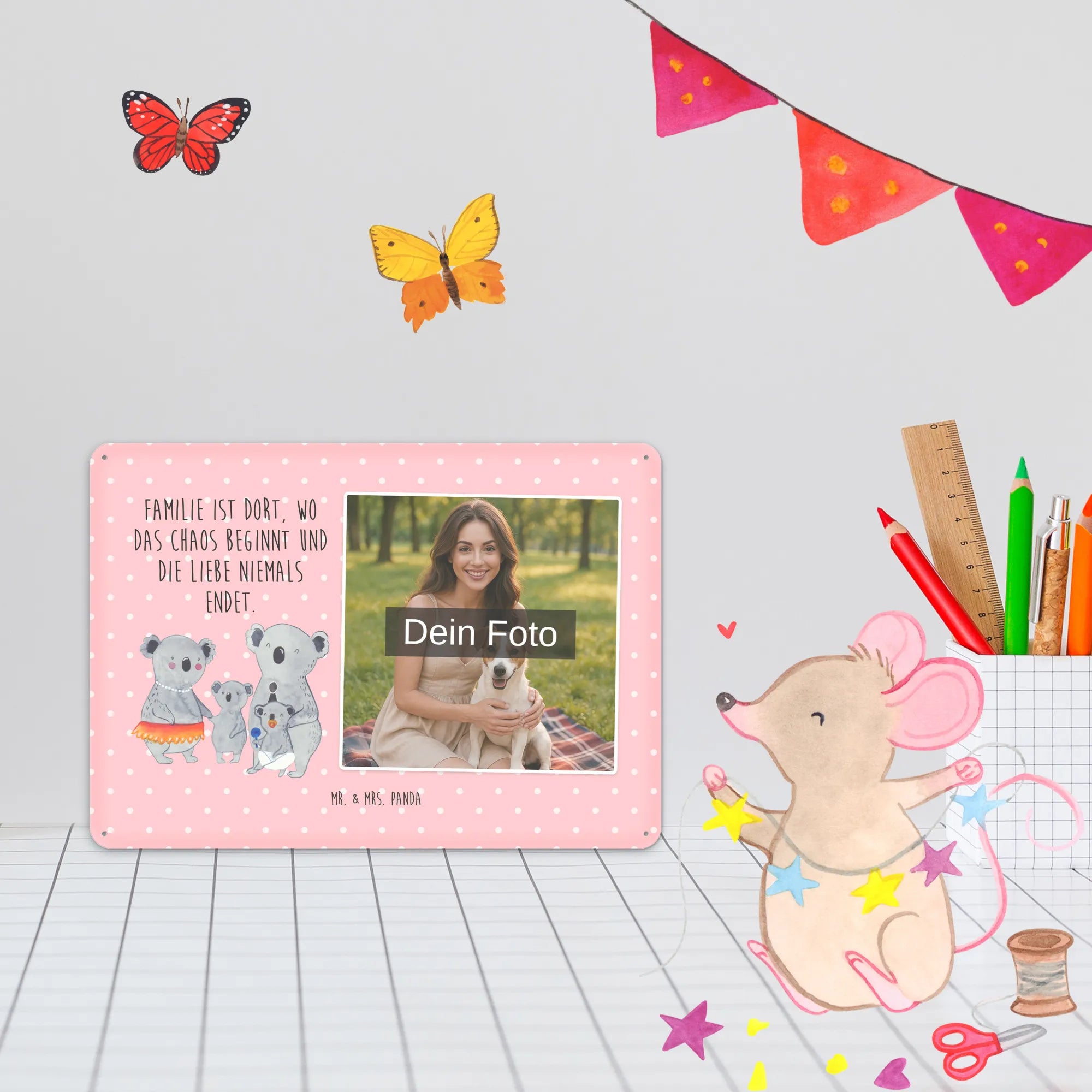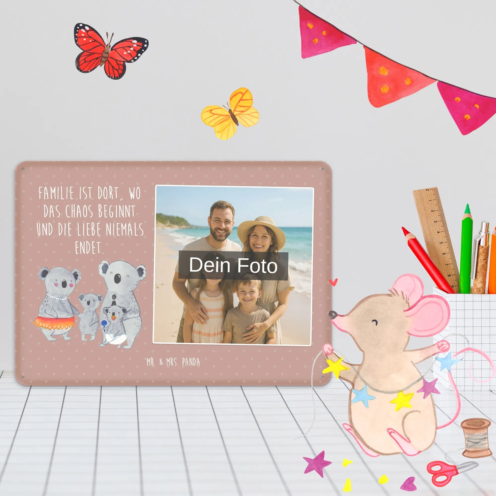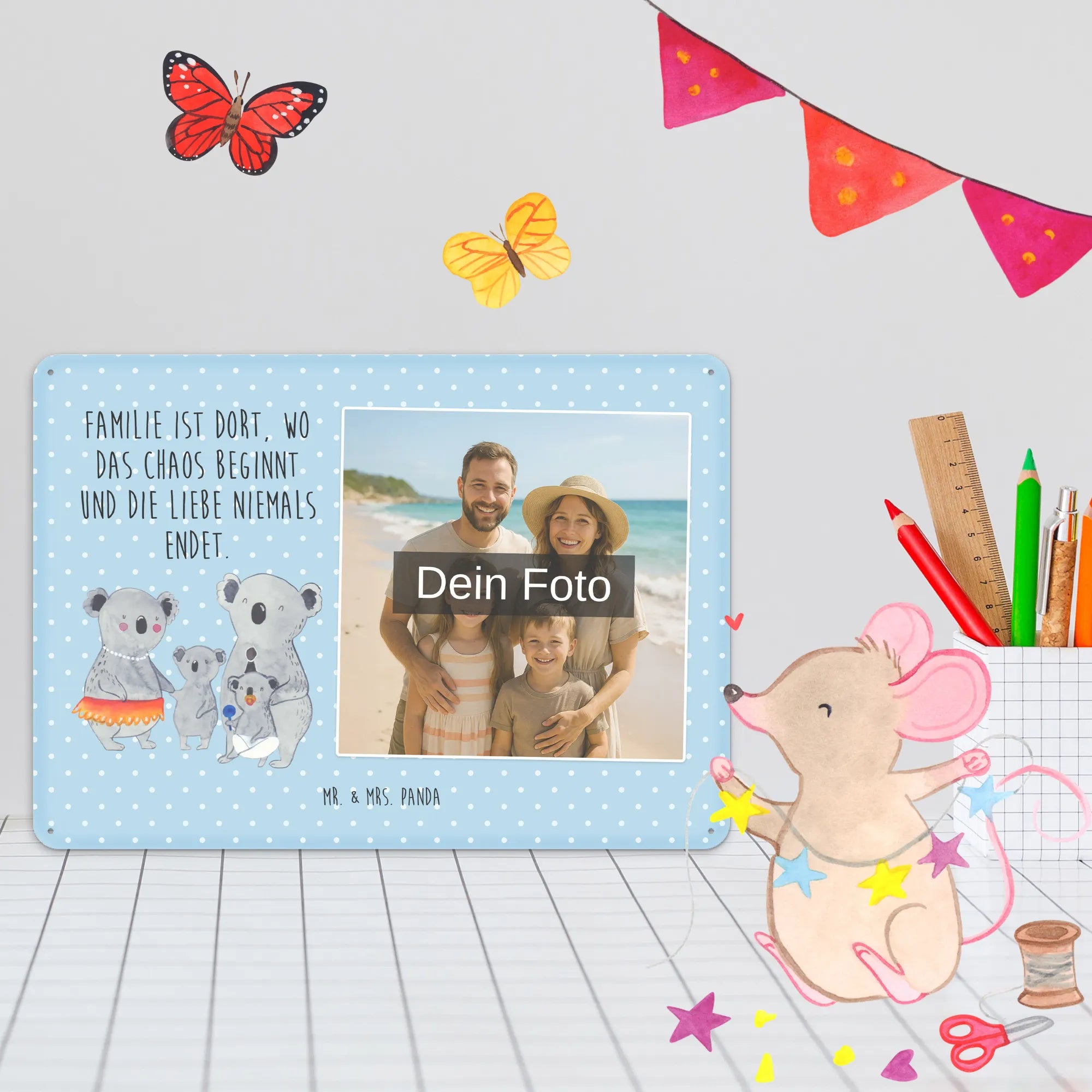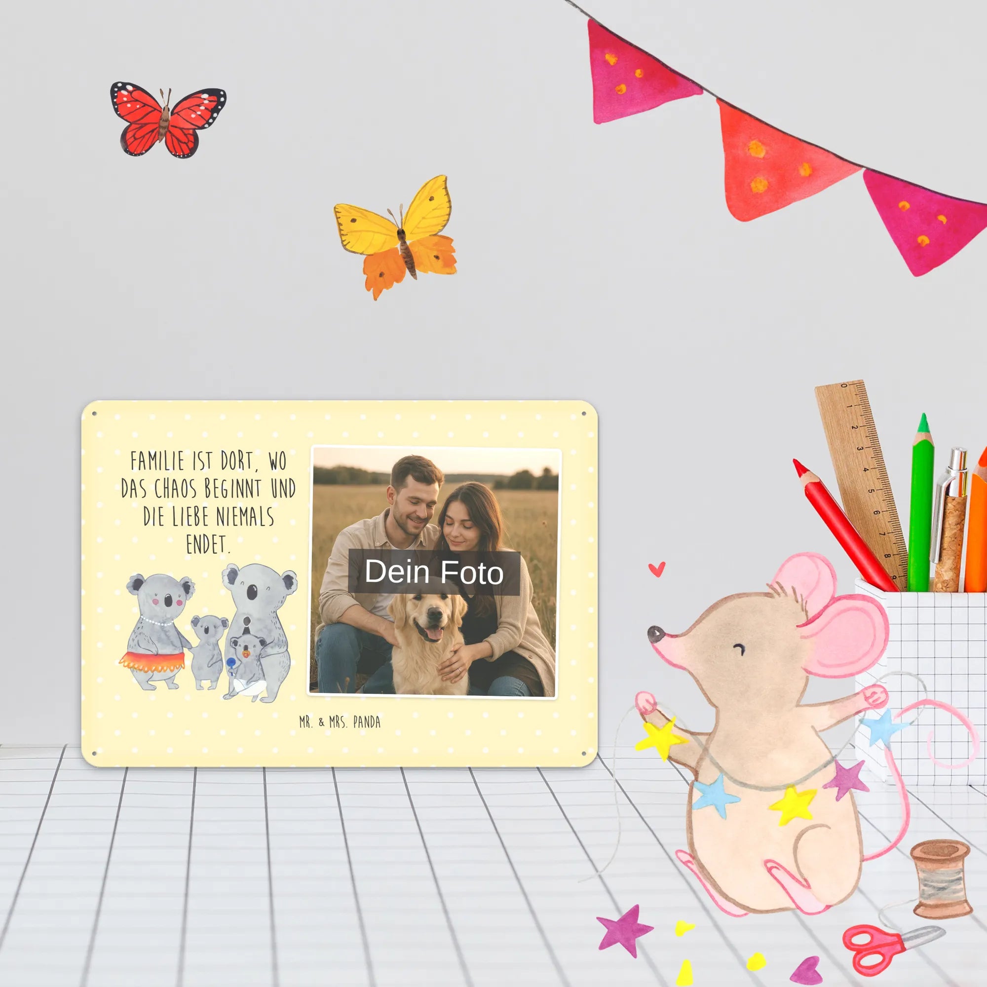 Blechschild mit eigenem Foto personalisiert – liebevoll gestaltet von Mr. & Mrs. Panda. Dieses edle Schild wird mit deinem Foto und unseren niedlichen Illustrationen bedruckt, sodass ein individuelles Dekostück entsteht. Achte unbedingt auf gute Bildqualität und geeigneten Bildausschnitt, damit das Motiv klar und harmonisch wirkt. Bitte nur eigene Bilder oder solche mit Nutzungsrecht hochladen. Gefertigt aus hochwertigem Stahlblech ohne Wölbung mit seidenmatter Oberfläche, bietet das Schild eine edle Optik. Maße: 70 mm x 297 mm x 210 mm. Der Druck ist langlebig und hochwertig verarbeitet. Für sicheren Halt gibt es vier Bohrungen, umgefalzte Kanten und abgerundete Ecken. Ideal für Innenräume, ob an der Tür, im Eingangsbereich oder an der Wohnzimmerwand. Pflegeleicht: einfach mit einem feuchten Tuch abwischen. In mehreren Größen erhältlich, so findest du garantiert die passende Variante. Verschenke Erinnerungen oder gestalte dein Zuhause persönlich — mit dem Blechschild mit eigenem Foto personalisiert von Mr. & Mrs. Panda wird jeder Raum ein Stückchen liebevoller.