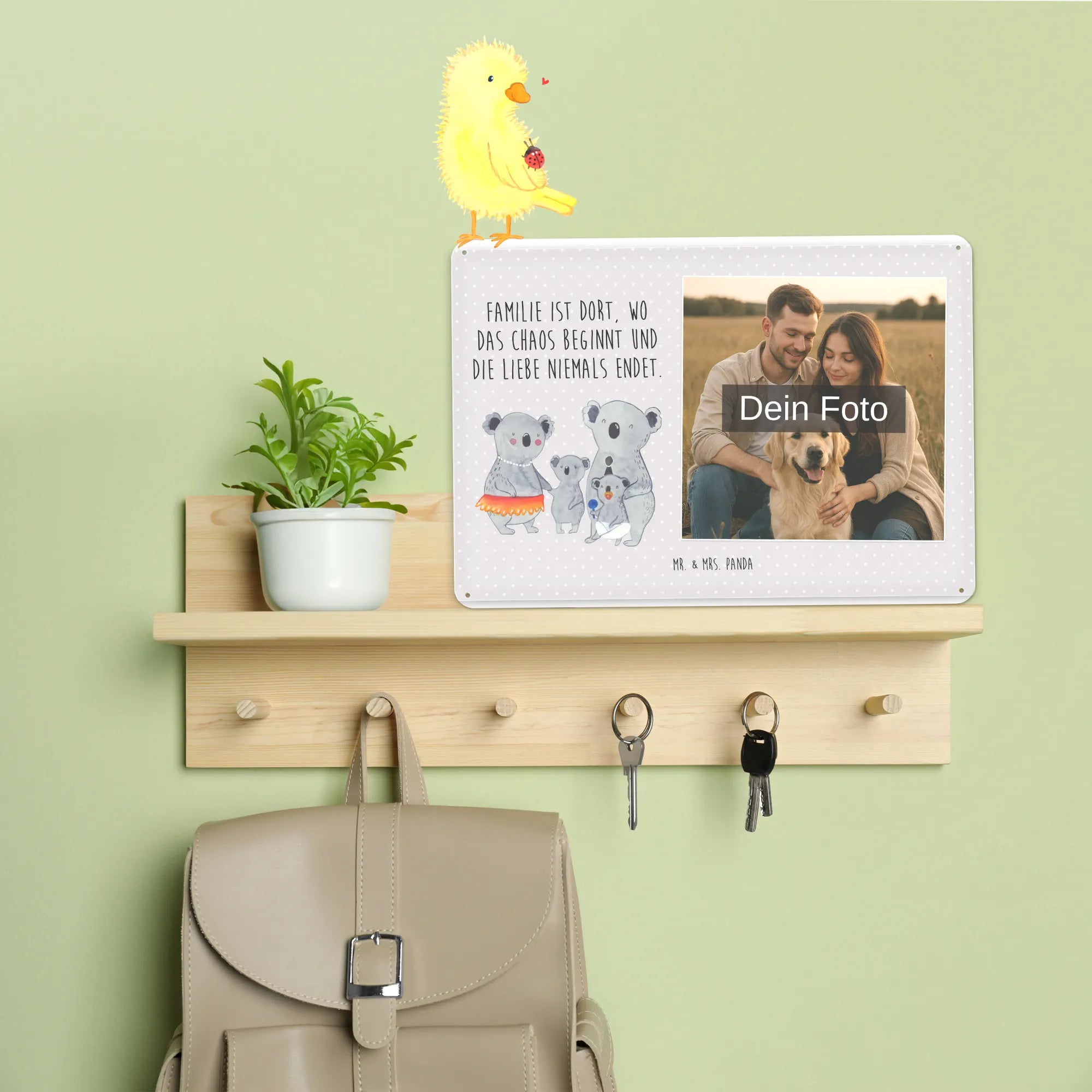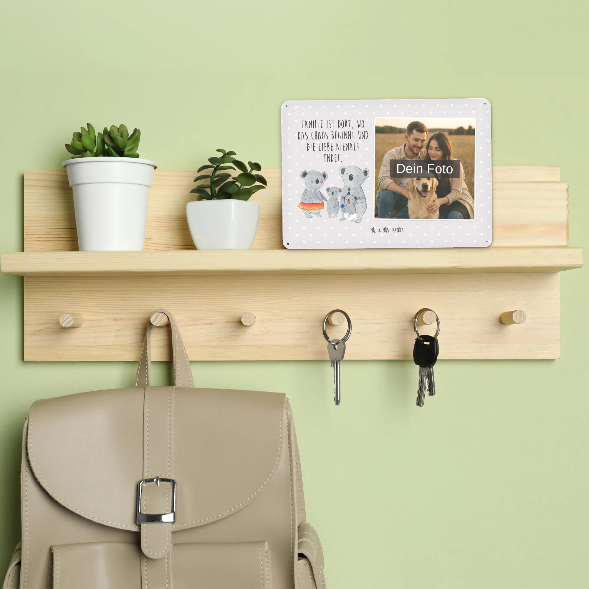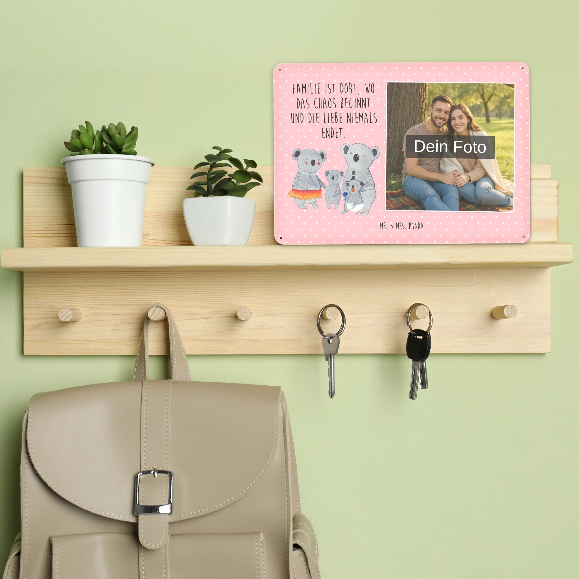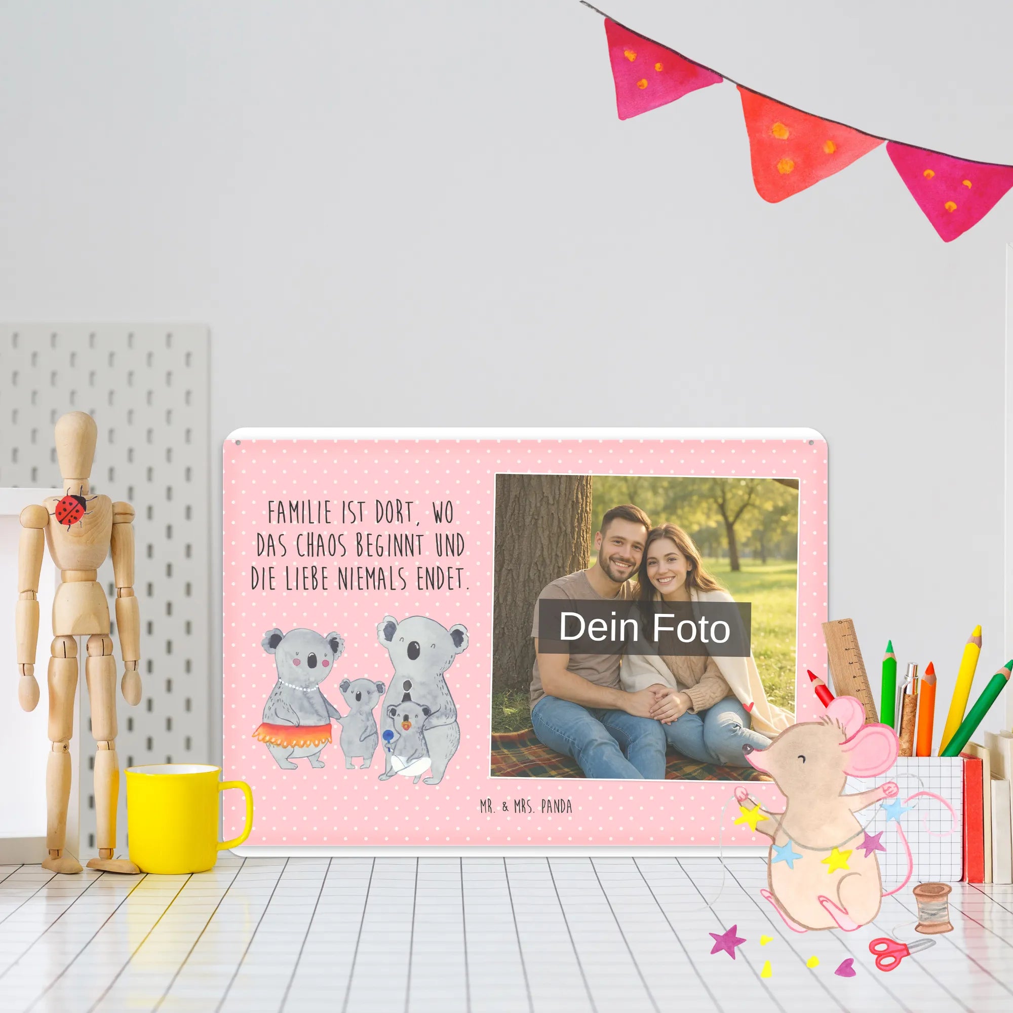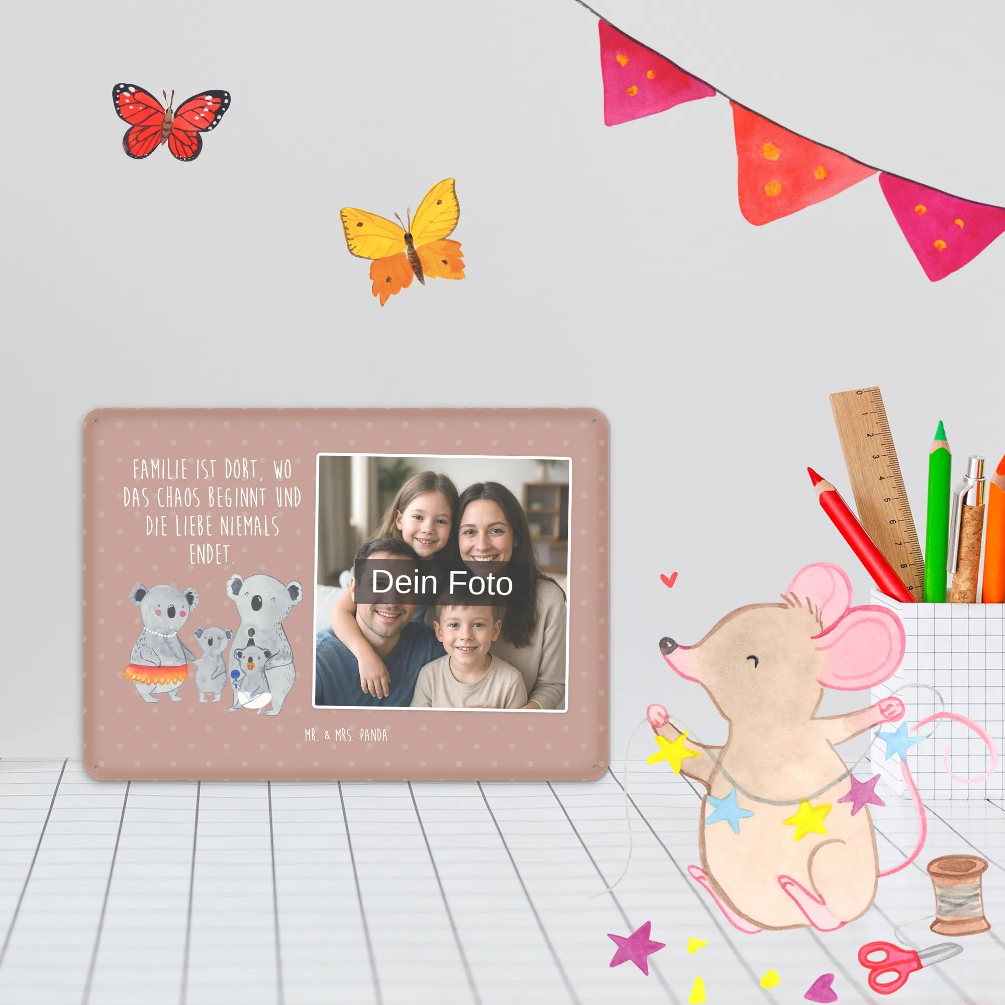 Blechschild mit eigenem Foto personalisiert – liebevoll gestaltet von Mr. & Mrs. Panda. Dieses edle Schild wird mit deinem Foto und unseren niedlichen Illustrationen bedruckt, sodass ein individuelles Dekostück entsteht. Achte unbedingt auf gute Bildqualität und geeigneten Bildausschnitt, damit das Motiv klar und harmonisch wirkt. Bitte nur eigene Bilder oder solche mit Nutzungsrecht hochladen. Gefertigt aus hochwertigem Stahlblech ohne Wölbung mit seidenmatter Oberfläche, bietet das Schild eine edle Optik. Maße: 70 mm x 297 mm x 210 mm. Der Druck ist langlebig und hochwertig verarbeitet. Für sicheren Halt gibt es vier Bohrungen, umgefalzte Kanten und abgerundete Ecken. Ideal für Innenräume, ob an der Tür, im Eingangsbereich oder an der Wohnzimmerwand. Pflegeleicht: einfach mit einem feuchten Tuch abwischen. In mehreren Größen erhältlich, so findest du garantiert die passende Variante. Verschenke Erinnerungen oder gestalte dein Zuhause persönlich — mit dem Blechschild mit eigenem Foto personalisiert von Mr. & Mrs. Panda wird jeder Raum ein Stückchen liebevoller.